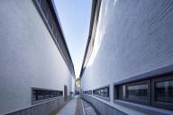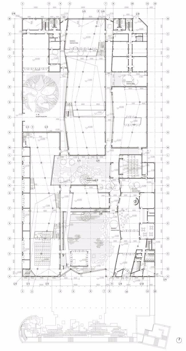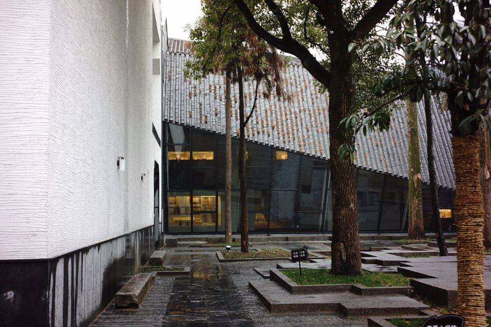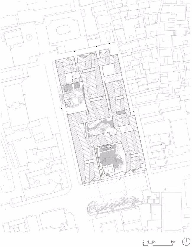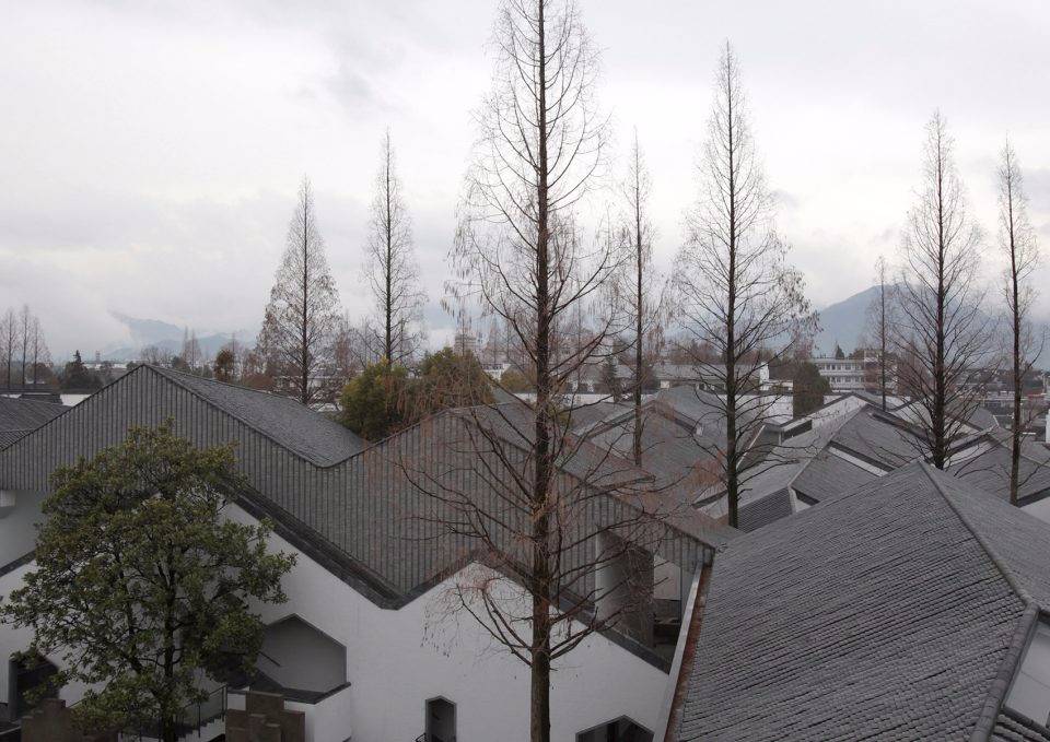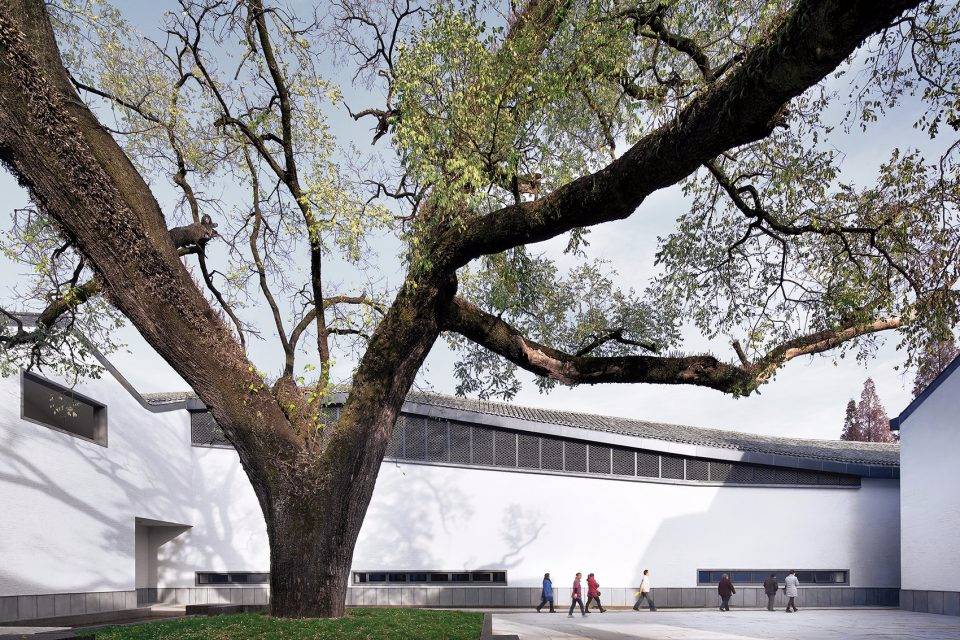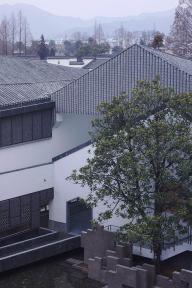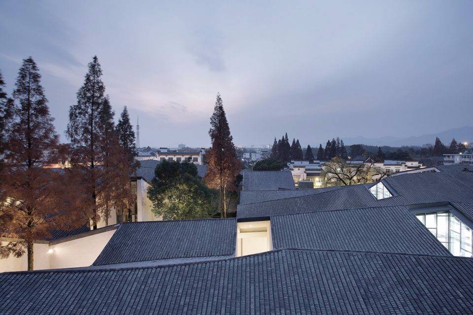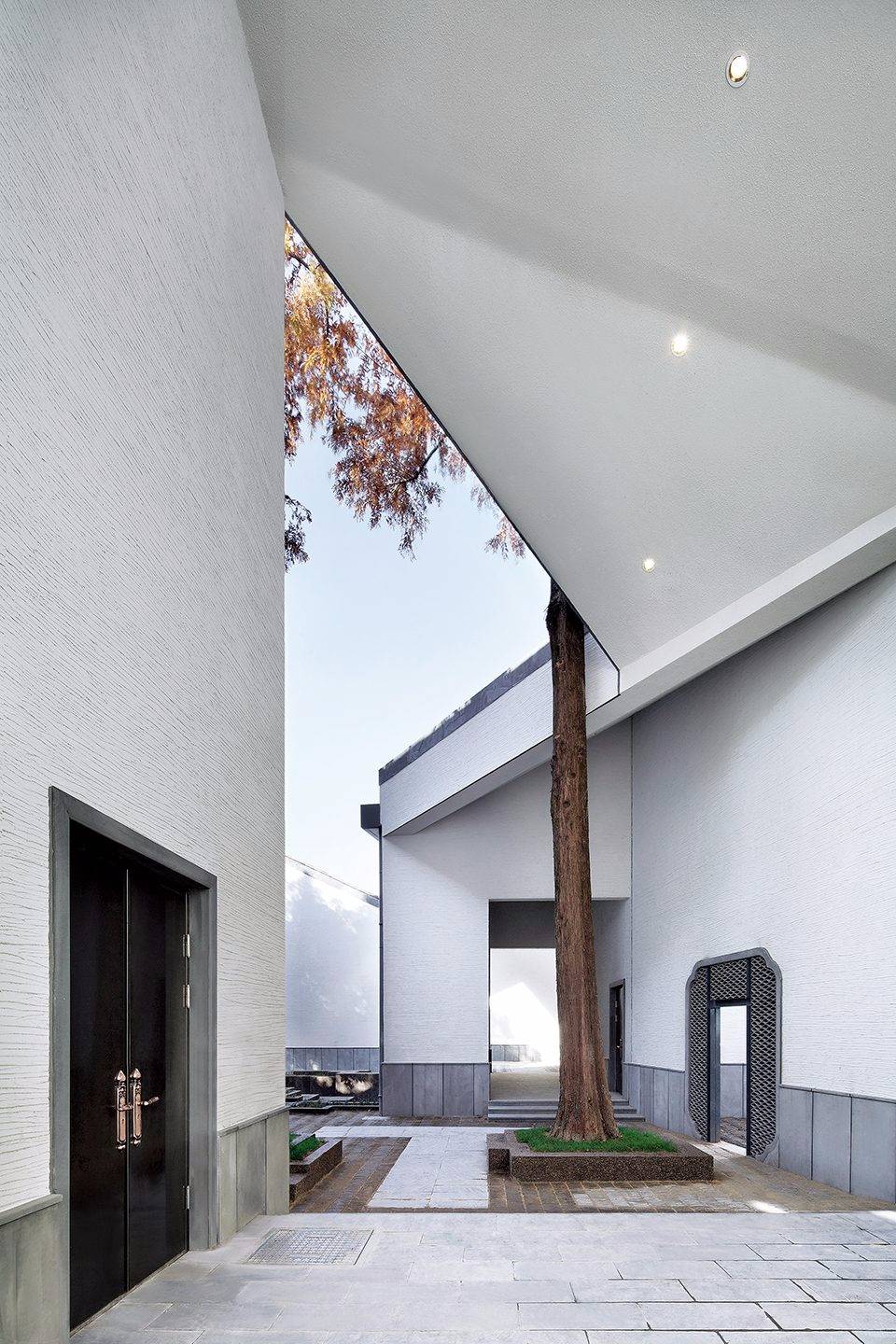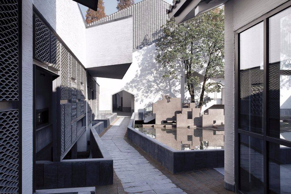 為盡可能保留用地內(nèi)的現(xiàn)狀樹木(特別是用地西北部一株700 年樹齡的古槐),建筑的整體布局中設(shè)置了多個庭院、天井和街巷,既營造出舒適宜人的室內(nèi)外空間環(huán)境,也是徽派建筑空間布局的重釋。建筑群落內(nèi)沿著街巷設(shè)置有東西兩條水圳, 匯聚于主入口大庭院內(nèi)的水面。