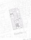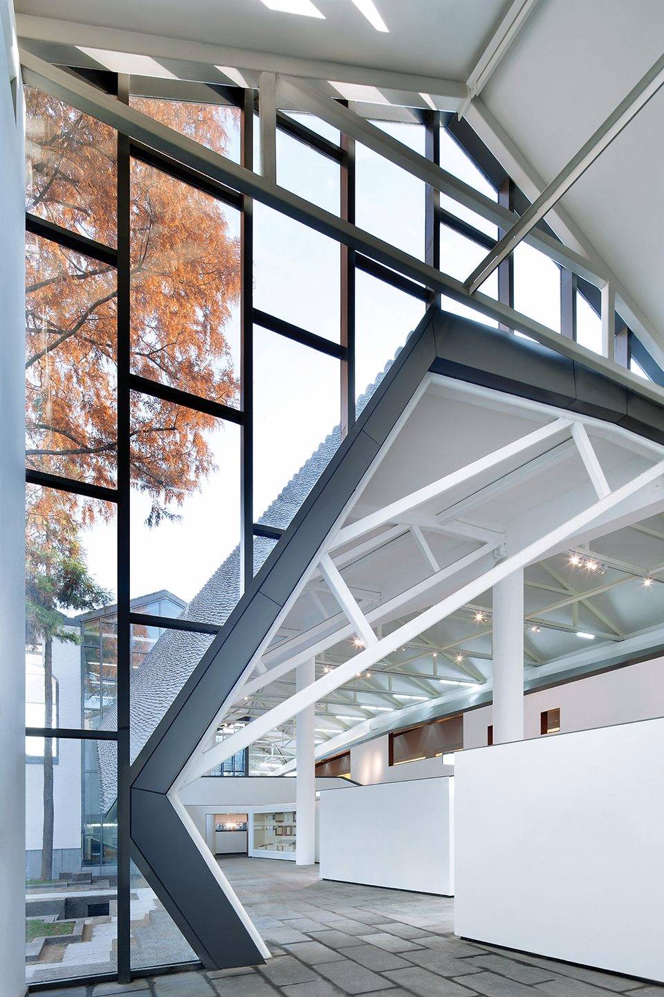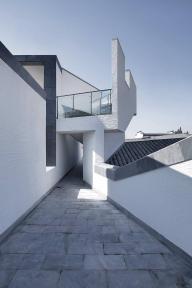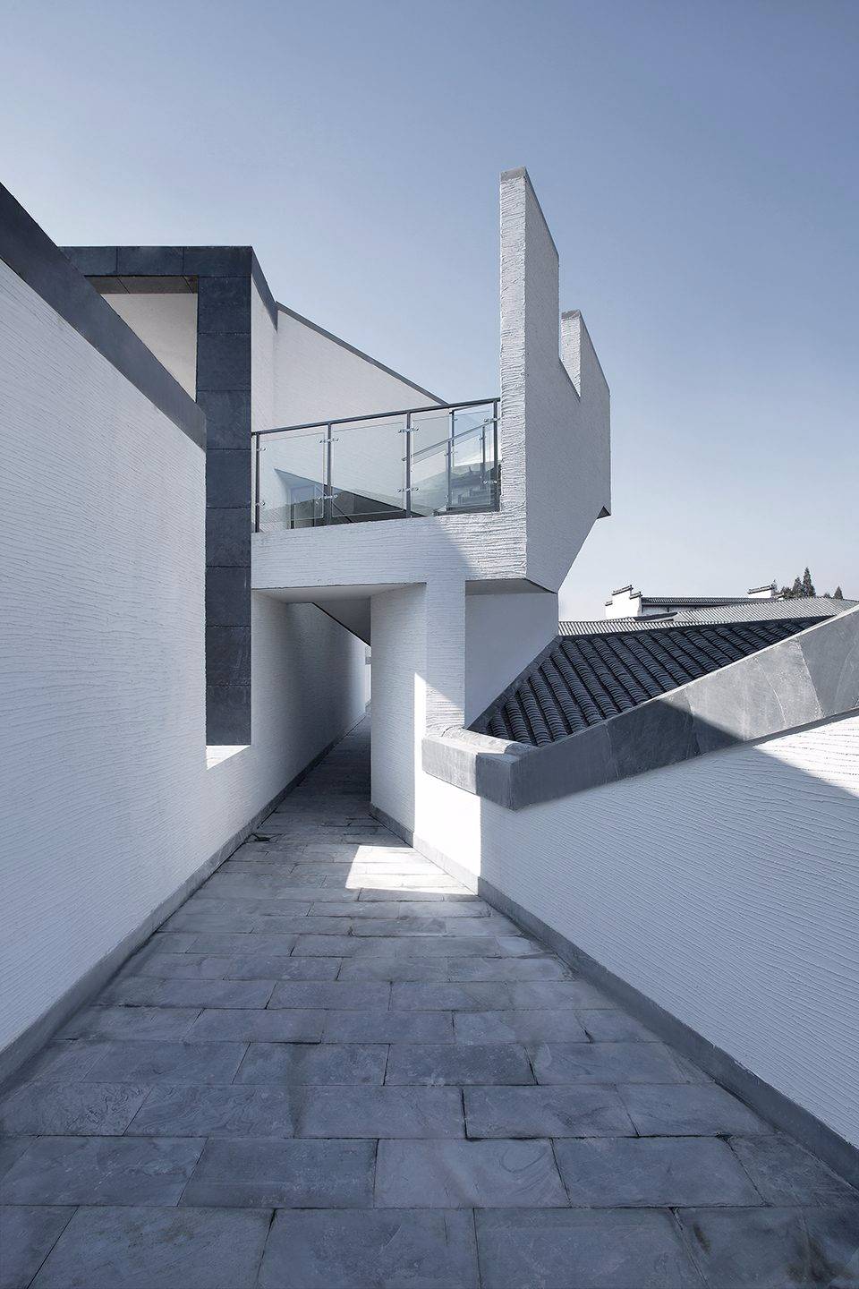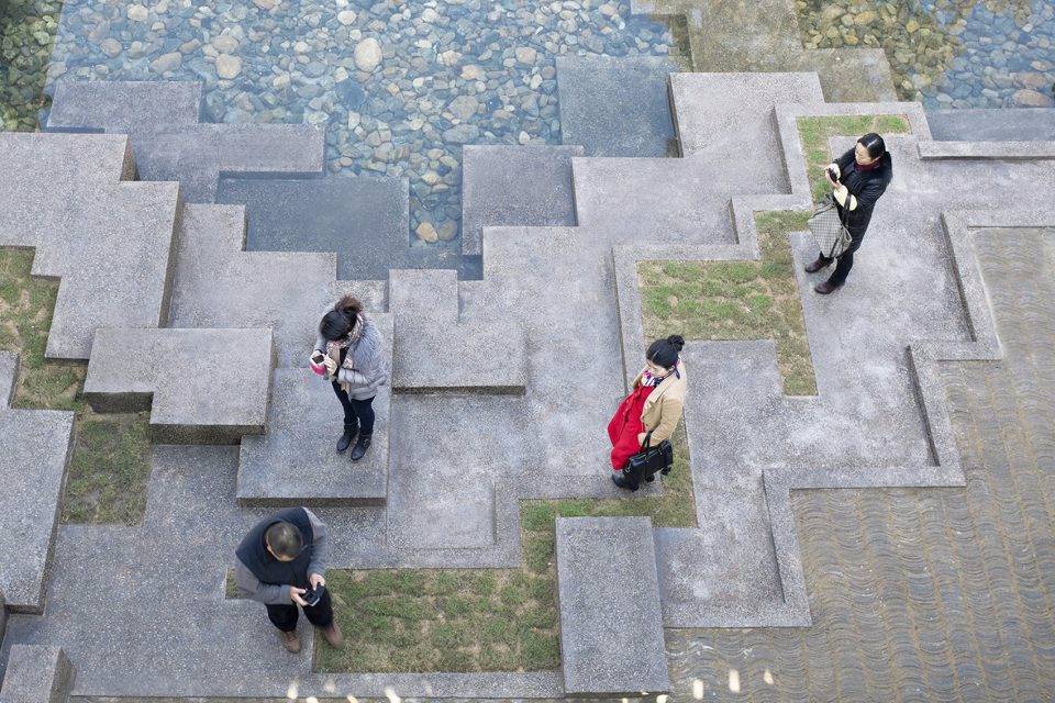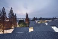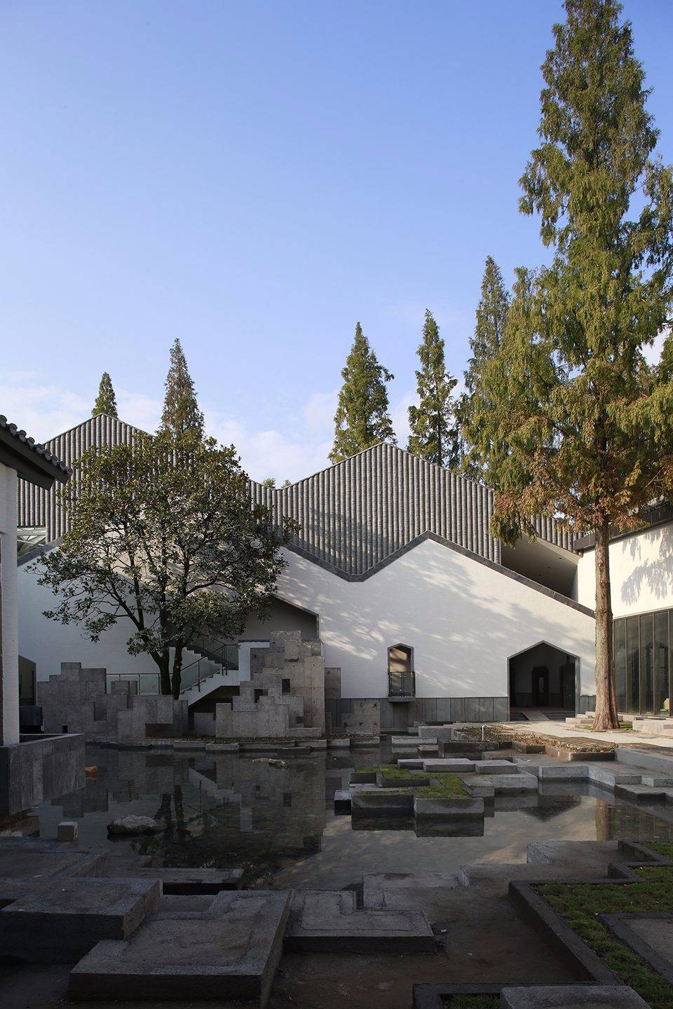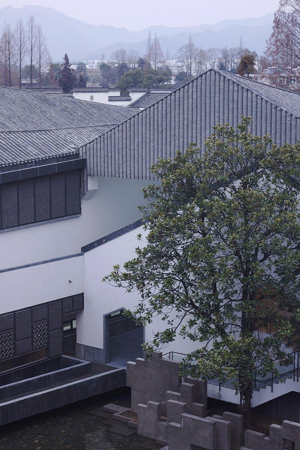 建筑南側(cè)設(shè)內(nèi)向型的前廣場——“明堂”,符合徽派民居的典型布局特征,同時也符合中國傳統(tǒng)的“聚攏風(fēng)水之氣”的理念;主入口正對方位設(shè)置一組被抽象化的“假山”。圍繞“明堂”、大門、水面有對市民開放的、立體的“觀賞流線”,將游客引至建筑東南角的“觀景臺”,俯瞰建筑的屋面、庭院和秀美的遠(yuǎn)山。
