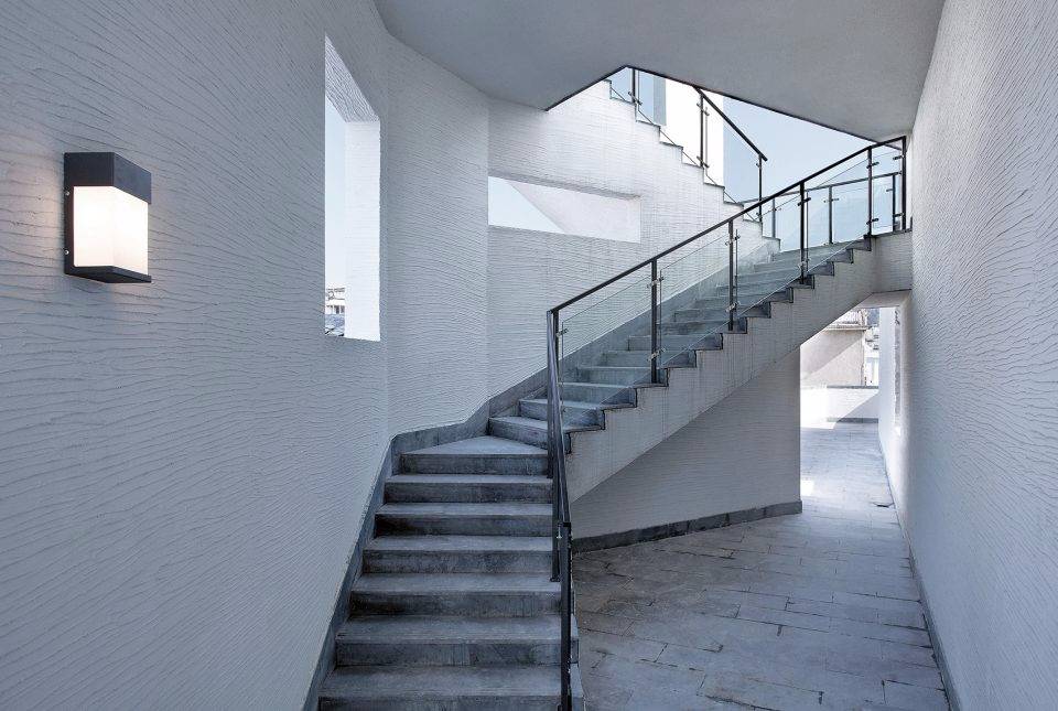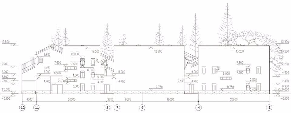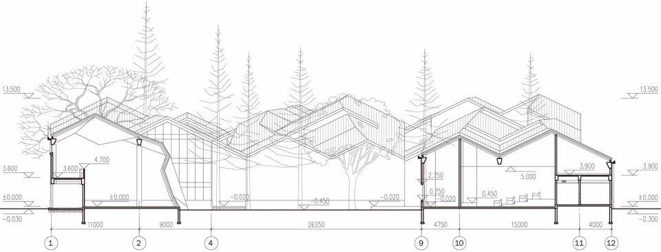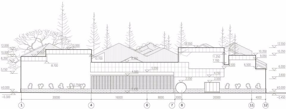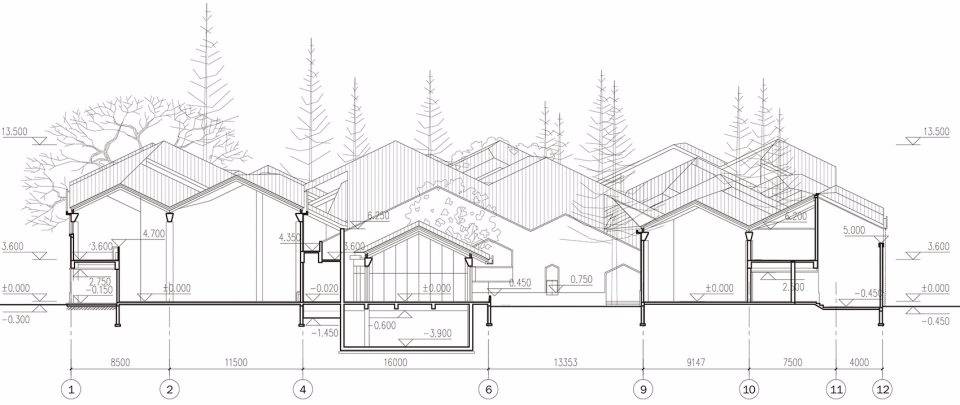 規(guī)律性組合布置的三角屋架單元,其坡度源自當(dāng)?shù)亟ㄖ?,并適應(yīng)連續(xù)起伏的屋面形態(tài);在適當(dāng)采用當(dāng)?shù)貍鹘y(tǒng)建筑技術(shù)的同時, 靈活的使用磚、瓦等當(dāng)?shù)爻R姷慕ㄖ牧希L試使之呈現(xiàn)出當(dāng)代感。