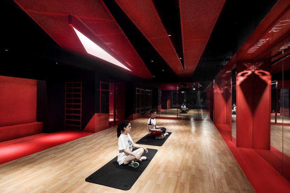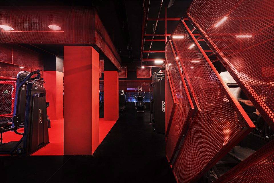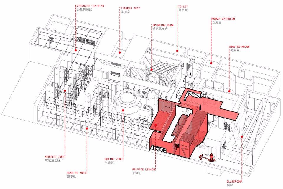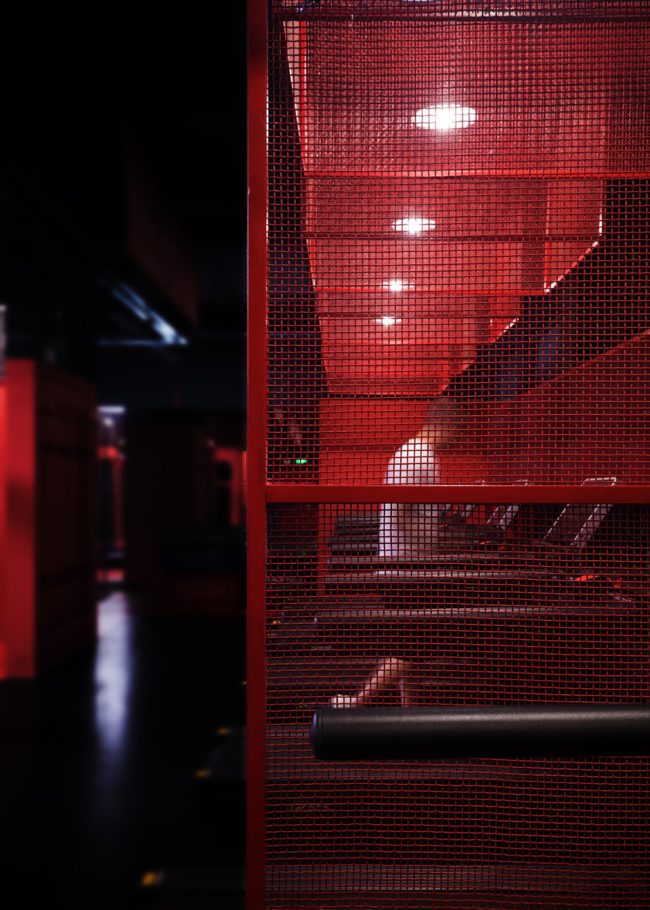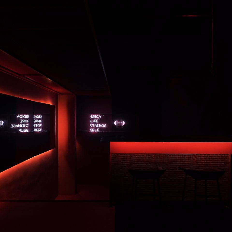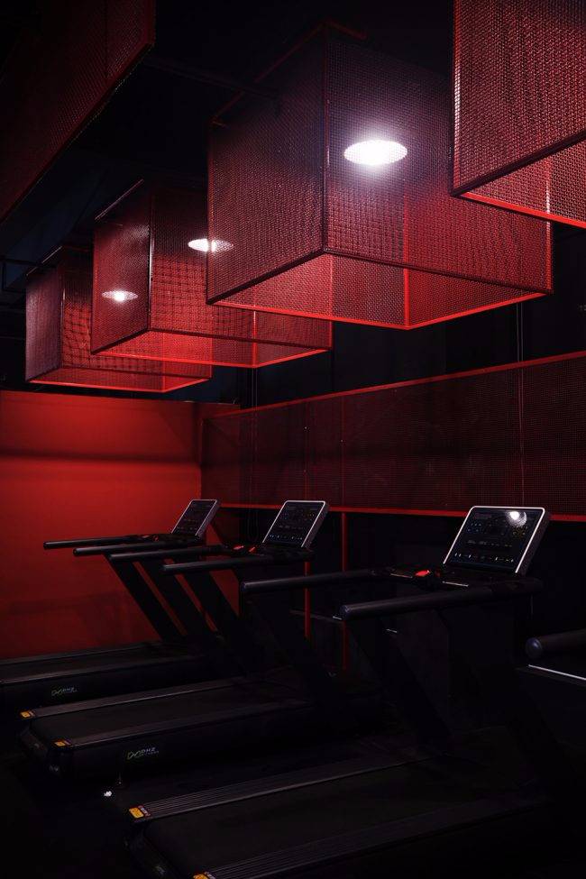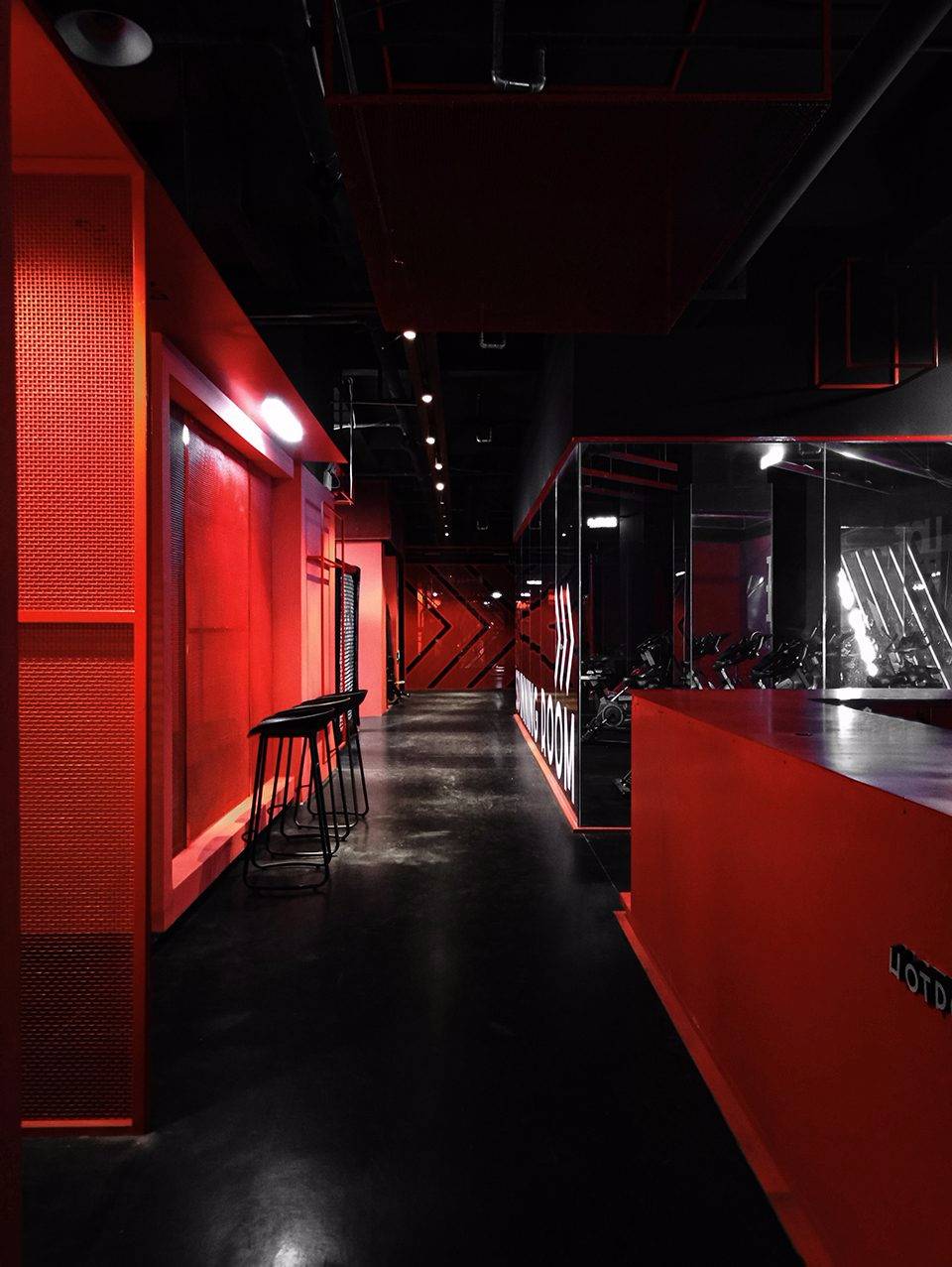 2. 色彩:選擇了非紅即黑的空間氛圍。紅色元素提取自工農(nóng)村大量的紅磚老房,黑色的應(yīng)用則是強(qiáng)調(diào)活動(dòng)的空間的同時(shí)隱藏原建筑的破損和混亂的頂面管道,加上燈光的作用,人會(huì)更多的關(guān)注到紅色運(yùn)動(dòng)空間,忽視黑色部分。