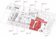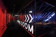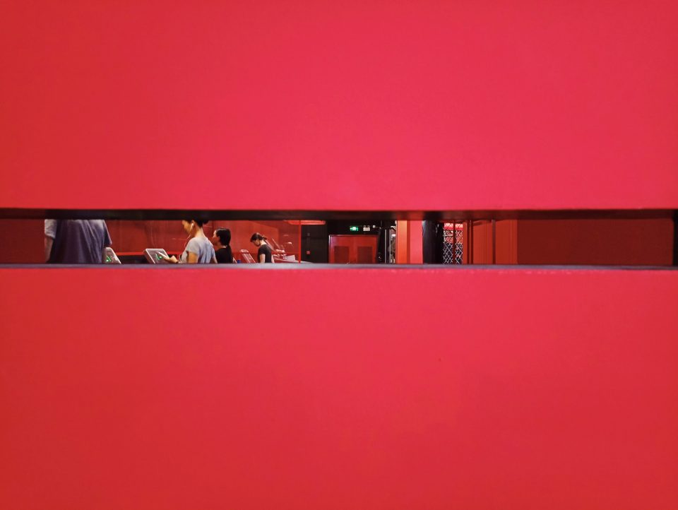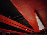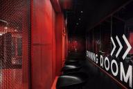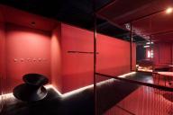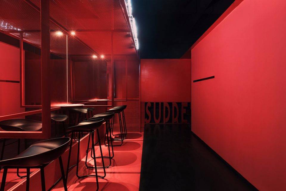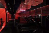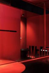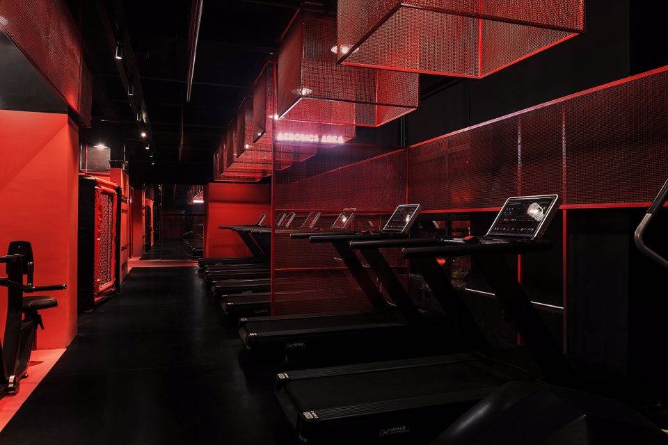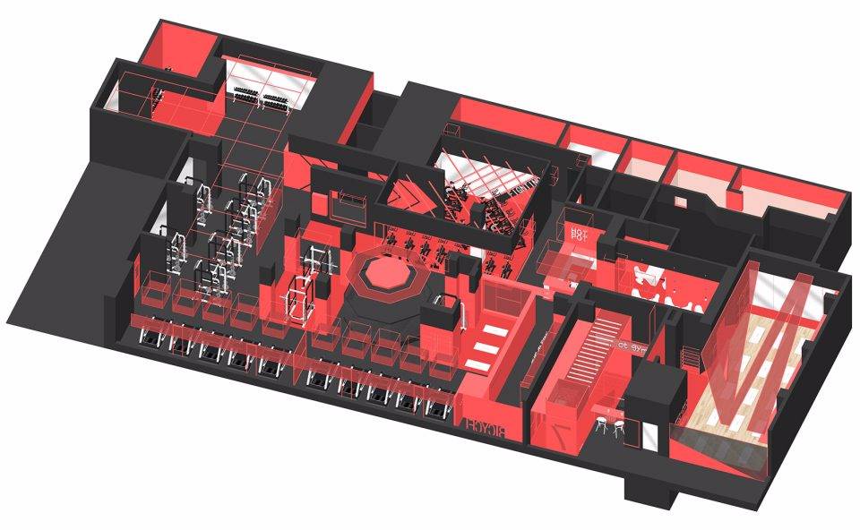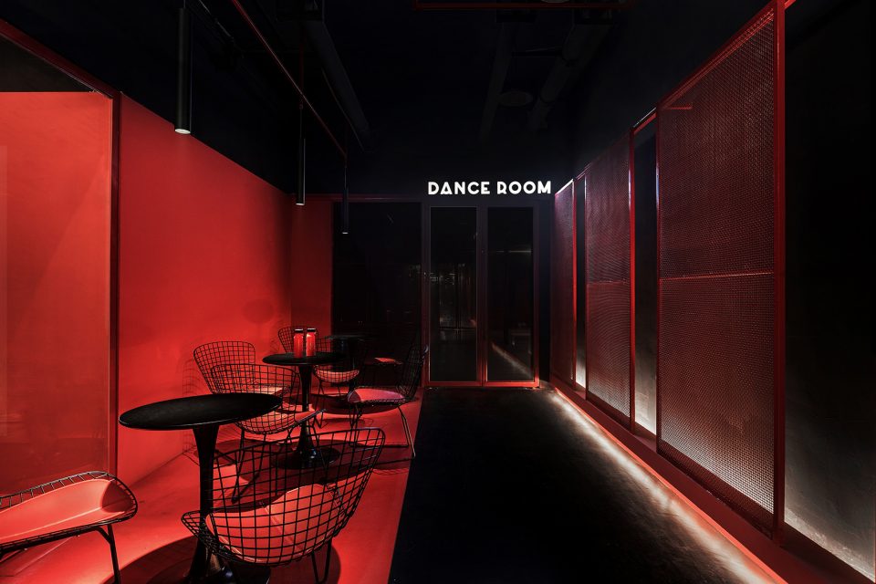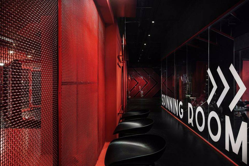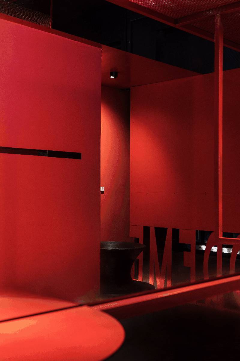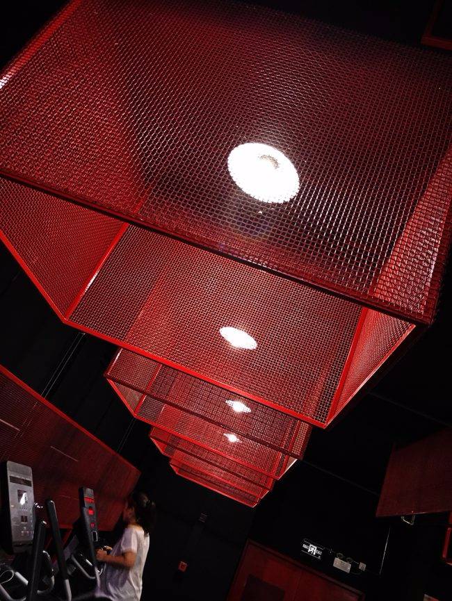 2. 色彩:選擇了非紅即黑的空間氛圍。紅色元素提取自工農(nóng)村大量的紅磚老房,黑色的應(yīng)用則是強(qiáng)調(diào)活動(dòng)的空間的同時(shí)隱藏原建筑的破損和混亂的頂面管道,加上燈光的作用,人會(huì)更多的關(guān)注到紅色運(yùn)動(dòng)空間,忽視黑色部分。