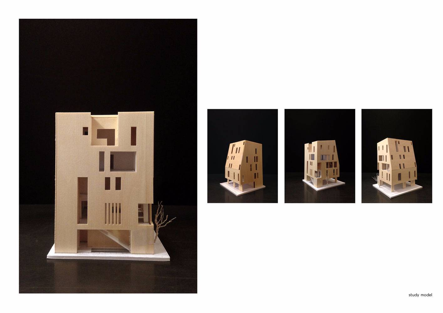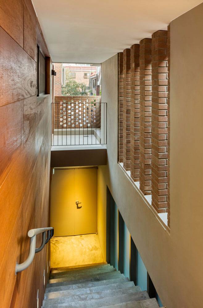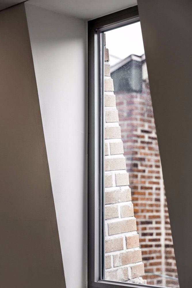 對(duì)于高密度的住宅區(qū)內(nèi),建筑的日照量會(huì)成為設(shè)計(jì)的主要影響因素。經(jīng)過深思熟慮,我們計(jì)劃將無(wú)形的窗洞作為建筑的外部特征顯露出來(lái)。傾斜的邊緣給室內(nèi)空間帶來(lái)不尋常的體驗(yàn),在普遍的住宅類型中并不常見。整個(gè)立面只用單一的一種材料,棕色磚,所以建筑物得到了一個(gè)簡(jiǎn)單而利落的外觀。樓梯間的窗戶設(shè)計(jì)各不相同,在夜間燈光從立面內(nèi)輕灑透出,并為這條舊而持續(xù)改變的后街注入生命的活力。