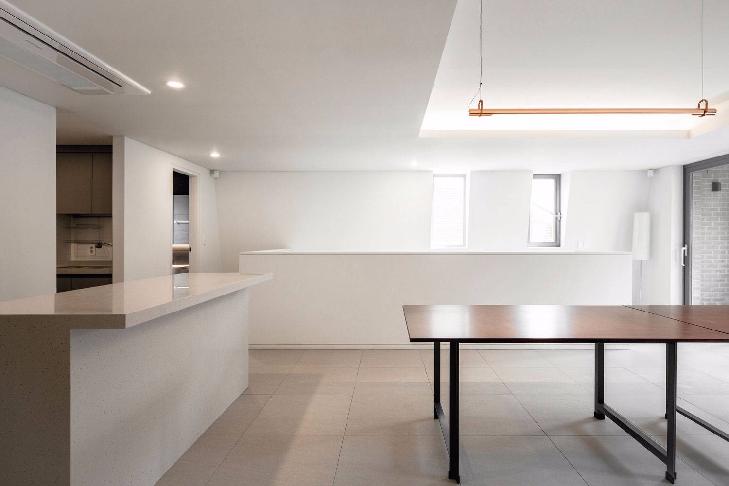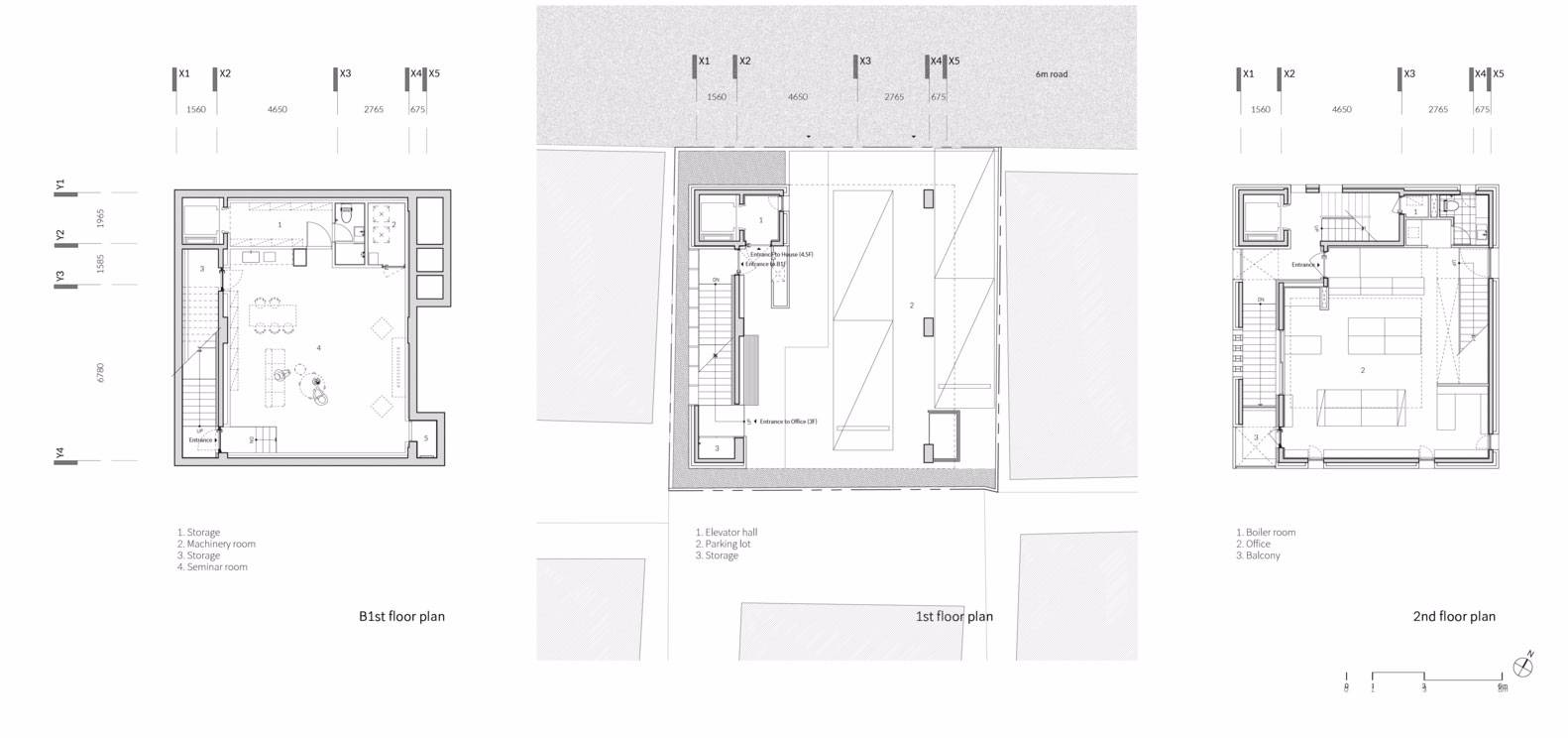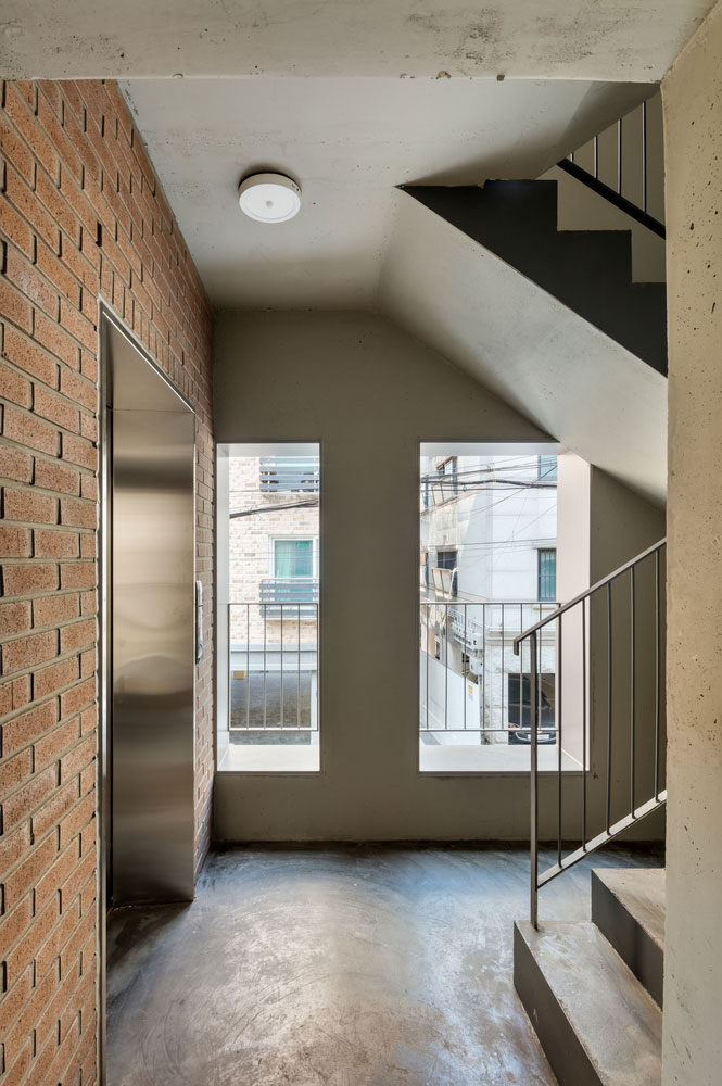 因?yàn)榇髽怯赊k公室和兩個(gè)家庭組成,所以相應(yīng)地設(shè)計(jì)流線變得更重要。電梯專供老太太使用,從而使辦公室的工作人員和居民的動(dòng)線分開。地下一層的多用途空間也有一個(gè)獨(dú)立的入口,以便使參觀公司的游覽者可以更方便的使用它。通過這種方式,辦公室,家庭和多用途空間可以確保個(gè)人的單獨(dú)入口和移動(dòng)流線。