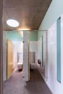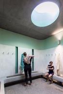 朝向海岸的建筑引導(dǎo)著人們進入,為游客提供了洗手間和更衣室等便利設(shè)施。圓形的天窗引入了大量的自然光,墻壁上的縫隙則使新鮮的空氣貫穿室內(nèi)。該建筑代替了1980年建造的舊設(shè)施,更大程度地迎合了所有沙灘游客的需求。