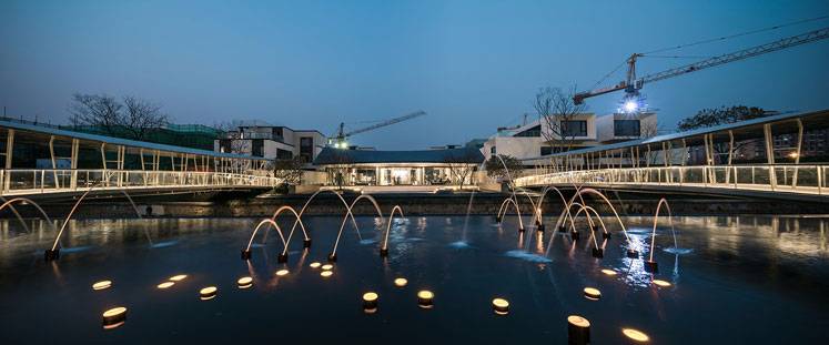 將江南水鄉(xiāng)的重重院落以一種富有秩序感與節(jié)奏感的多重合院來再現(xiàn),營造適應(yīng)現(xiàn)代生活美學(xué)的前場空間。將傳統(tǒng)的園林空間的起承轉(zhuǎn)合與一步一景之感用現(xiàn)代建筑語言進(jìn)行轉(zhuǎn)譯,結(jié)合小品景觀來化物為境,以次體現(xiàn)簡潔輕盈又不失大氣的美。