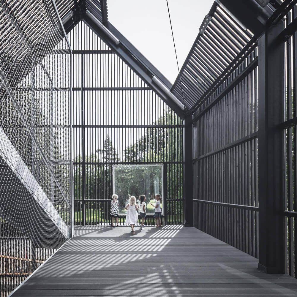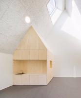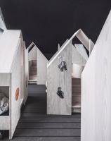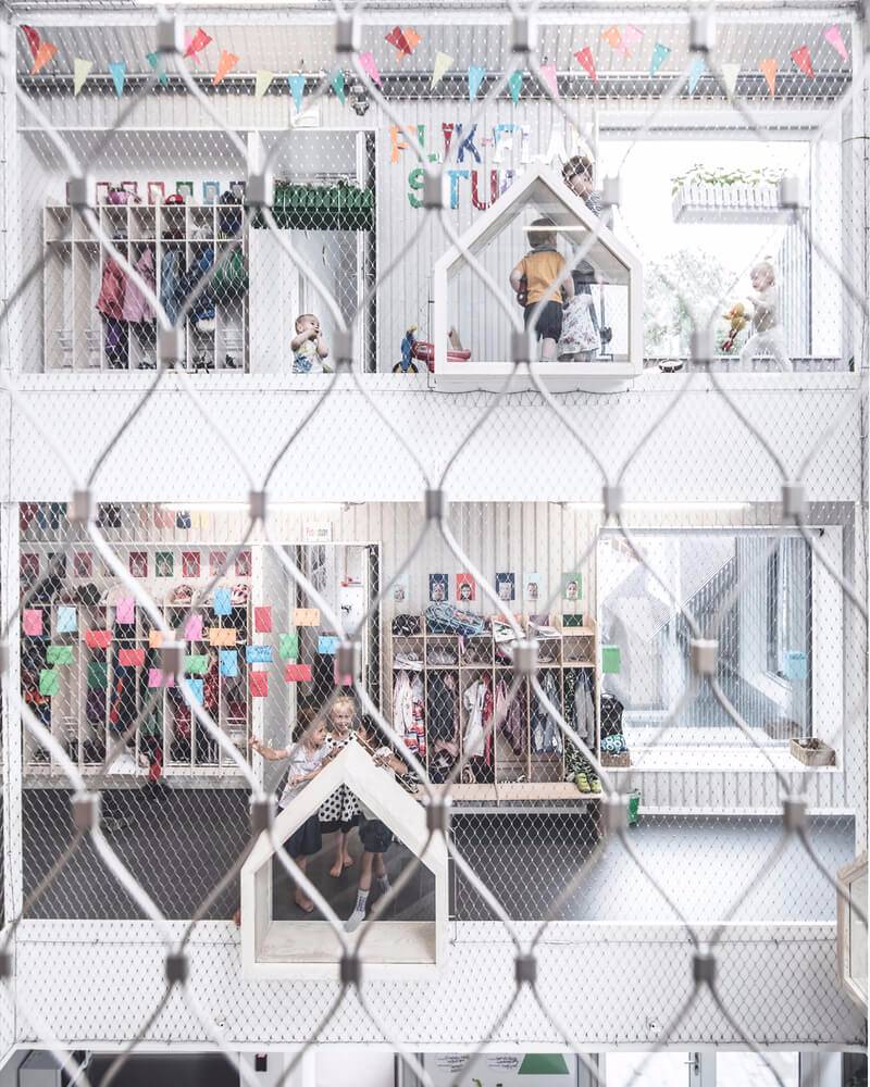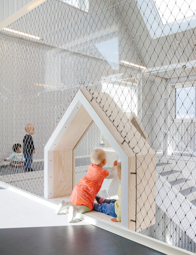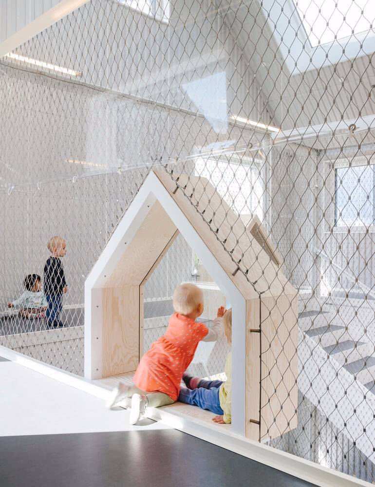 圍繞著主幼兒園,位于游樂場區(qū)域的另外六個較小的房屋用于存放嬰兒車、玩具和工具。在主幼兒園大樓內(nèi),一個個小房屋形狀的空間都是廚房、搖籃室、游戲室和用來給嬰兒換尿布的地方。所有這些都符合小村莊環(huán)境的主要概念。