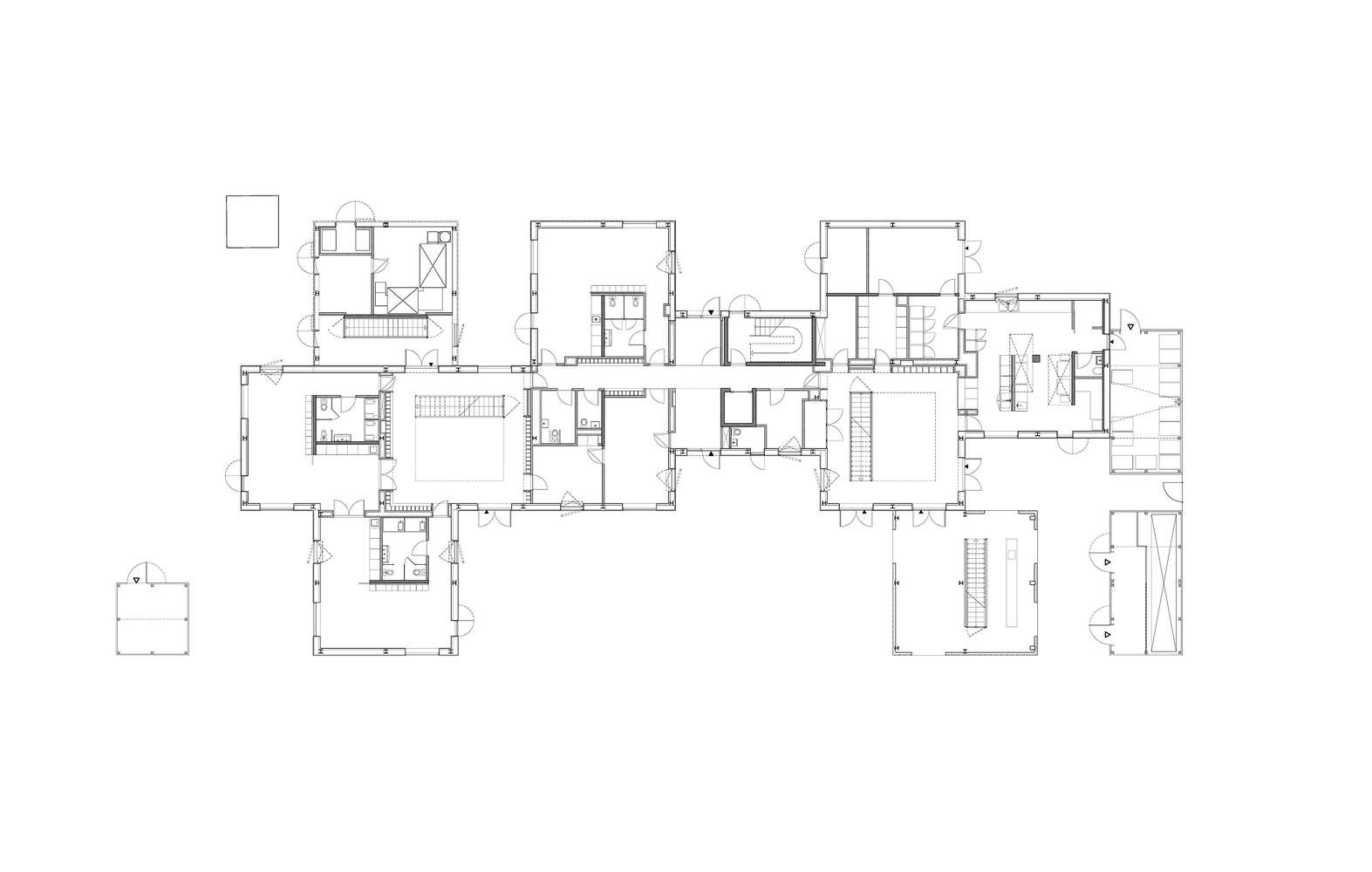幼兒園希望擺脫傳統(tǒng)的那種大規(guī)模日托幼兒園,打造一個充滿童趣的小村莊。小尺度村莊氛圍的營造是通過將建筑物分成11個小房子,以不同方向聯(lián)合在一起實(shí)現(xiàn)的。幼兒園的各種玩耍娛樂空間都圍繞著兩個冬季花園,出現(xiàn)了很多由孩子們自己塑造的小而個性化的場所。