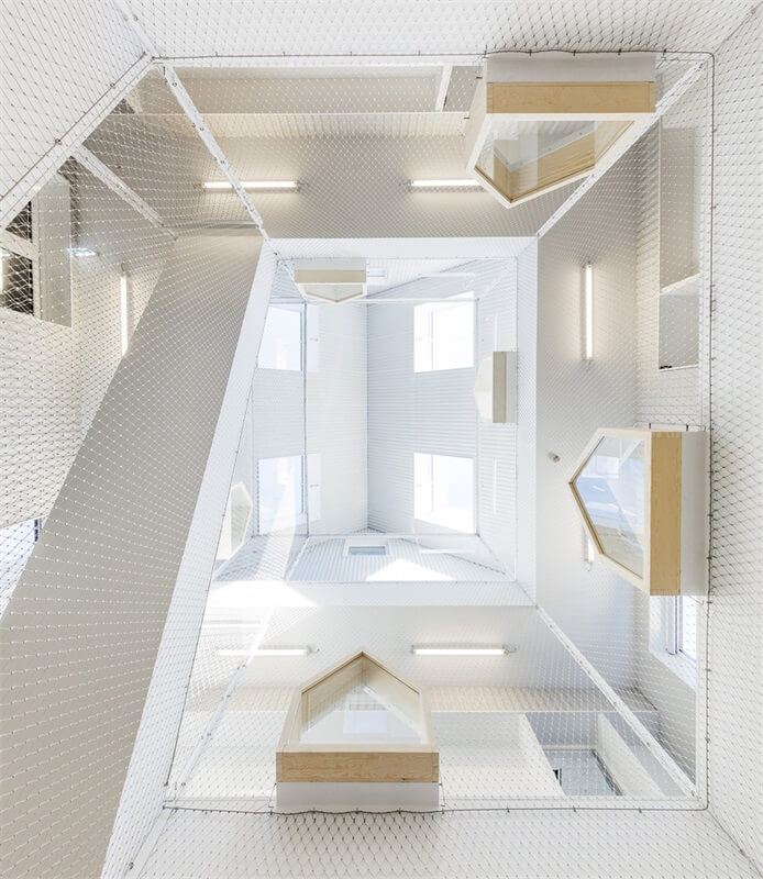 這11個房間的位置都稍微偏移,以便打碎整個幼兒園整體感。從外面看,外墻的偏移將幼兒園氛圍了較小的戶外區(qū)域和游樂區(qū),也讓陽光能夠順利進(jìn)入室內(nèi)。幼兒園由2至3層樓組成,每個樓層都有獨(dú)立的室外空間。