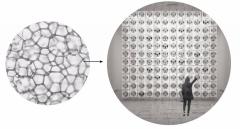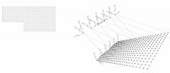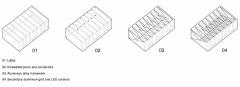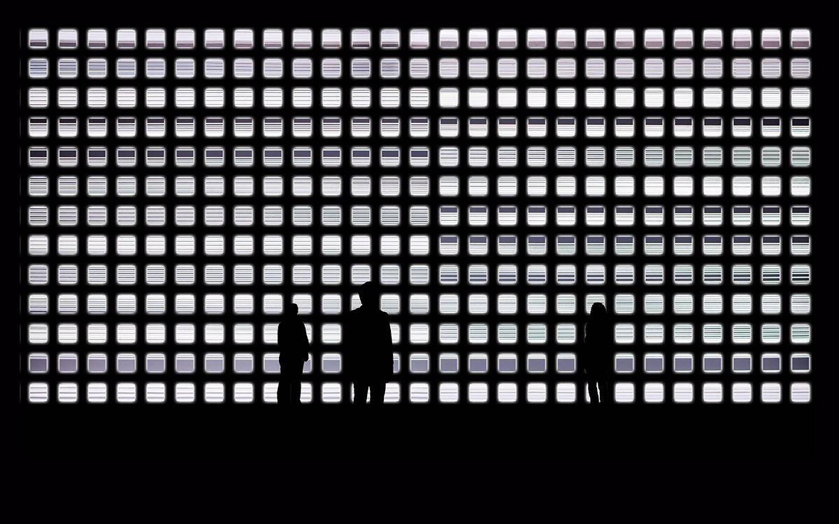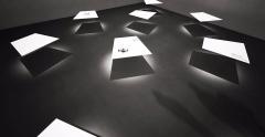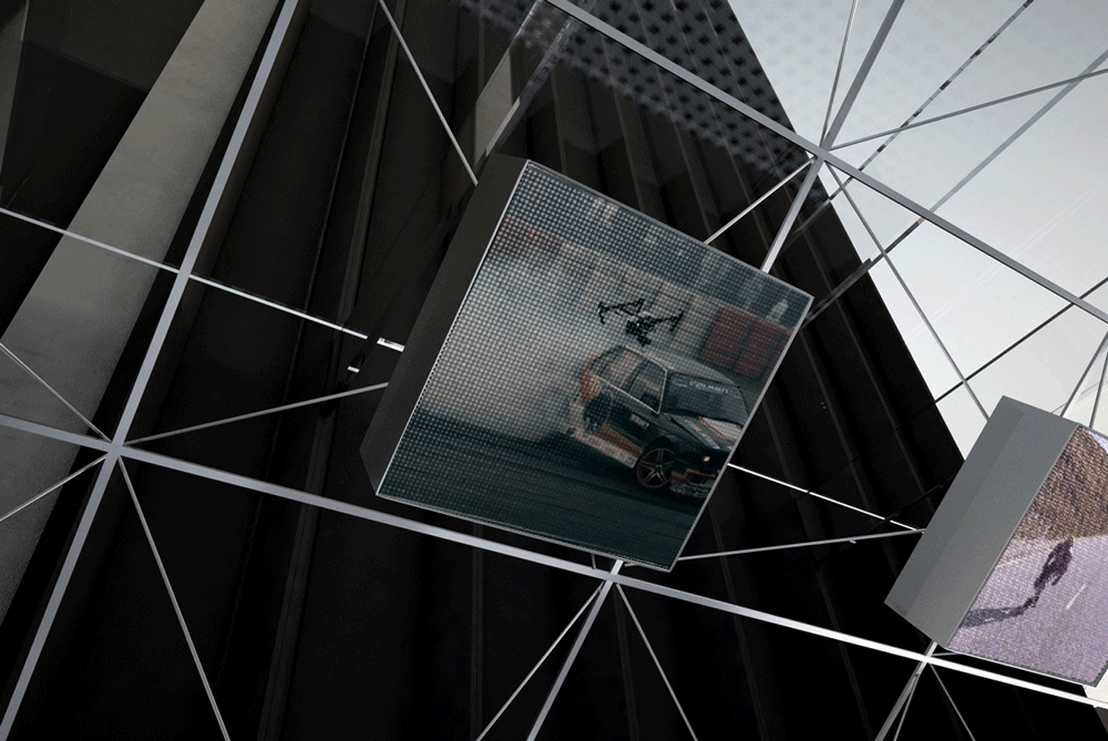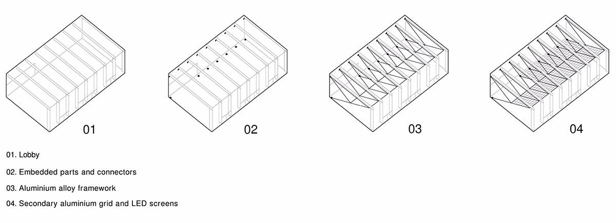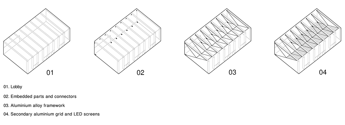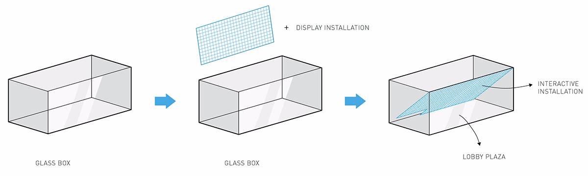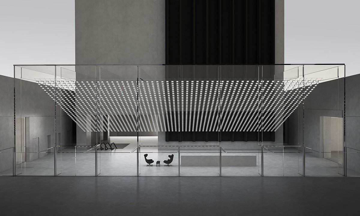 走進大堂,在一個全透明的空間之中,一面由1400塊250*250mm的定制LED屏組成的交互裝置傾斜安置在視線上方,屏幕由鋁合金框架支撐。