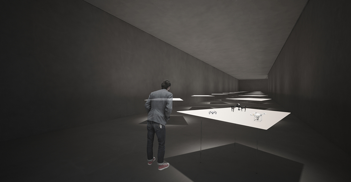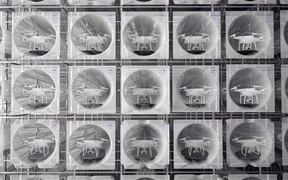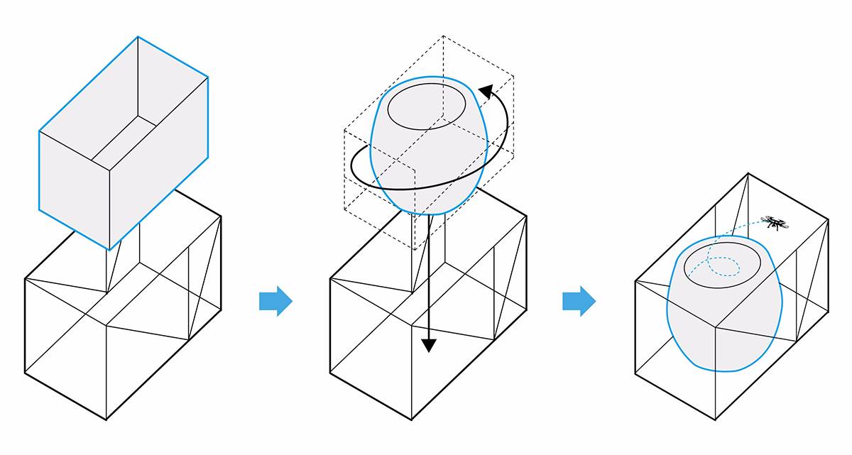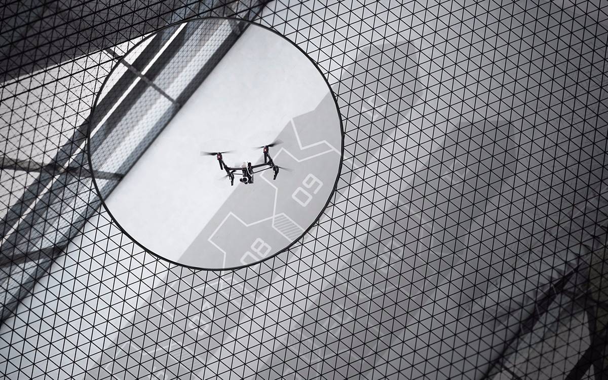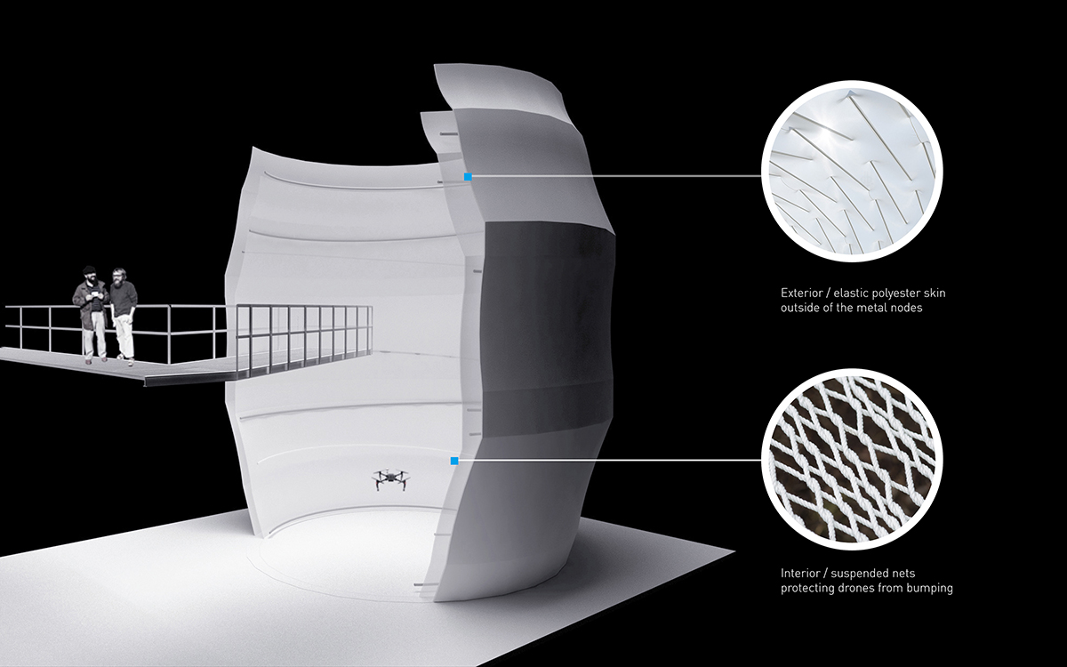 漢諾森的靈感來源于一個軟質(zhì)“膠囊”。 “膠囊”隔離了原有的壁壘??萍纪黄坪螄L不是同理?這一個雙層的空間,內(nèi)部為防止無人機試飛產(chǎn)生撞擊設計成懸置的網(wǎng)結(jié)構(gòu),外層由彈性聚酯纖維表面包裹。