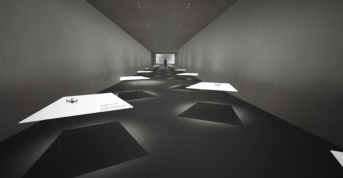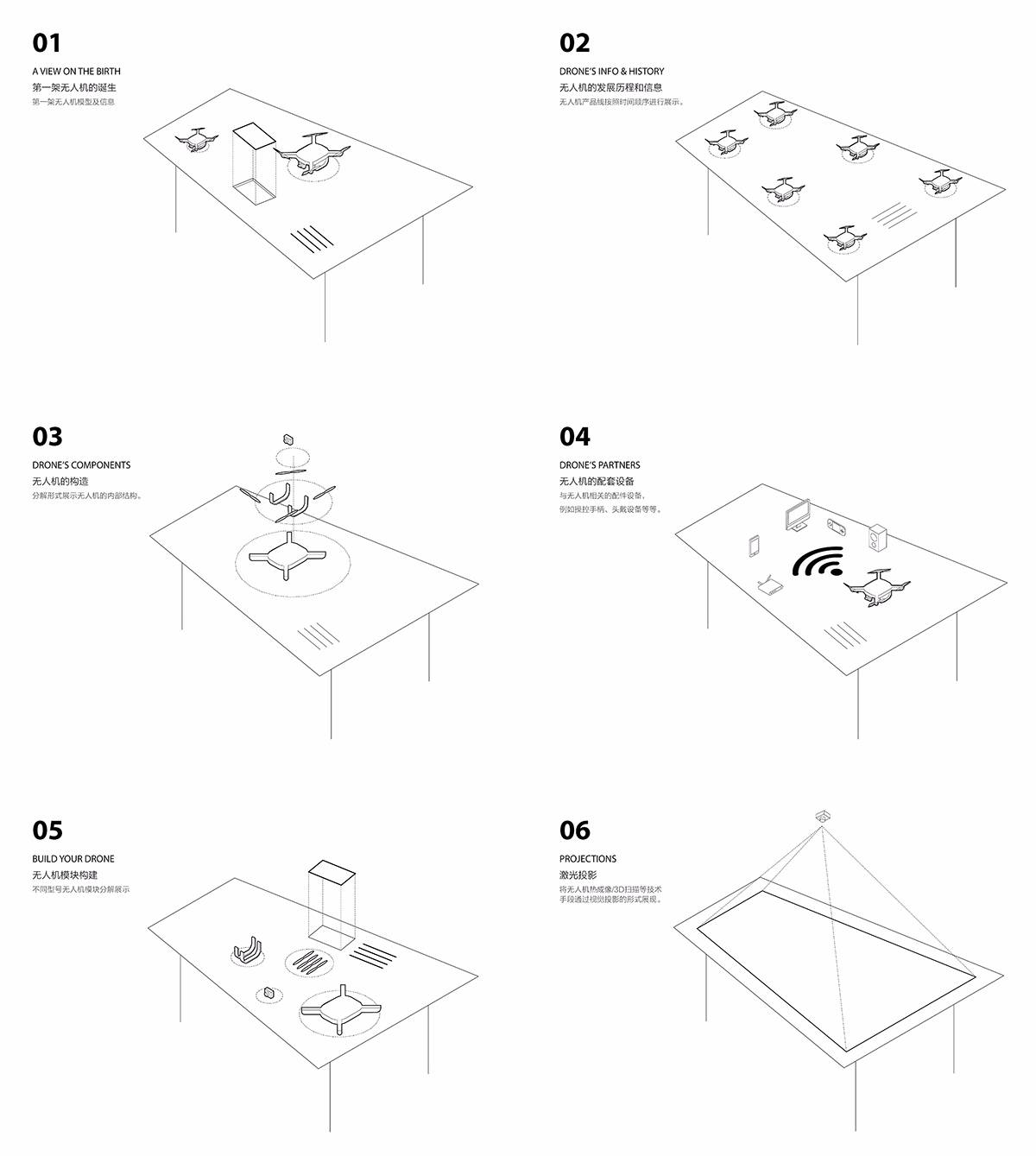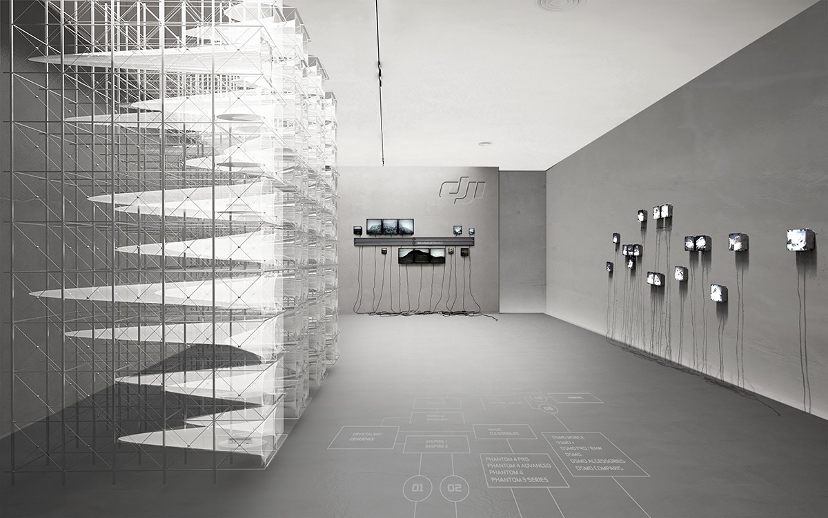 陳列展示窗以細胞結(jié)構(gòu)為靈感,多個錘形的盒子鑲嵌在鋁合金支架的空隙中,形成排列整齊的圓形展示窗口,用于放置不同的無人機模型。這一仿生理念也流露出一種人文性的溫暖。