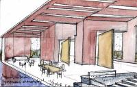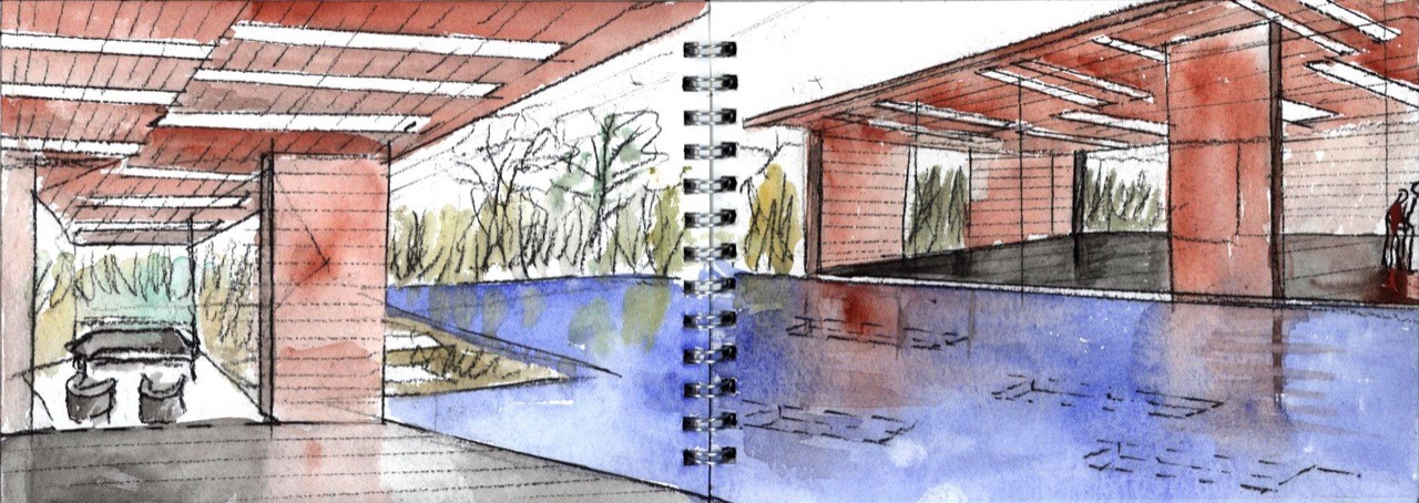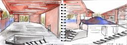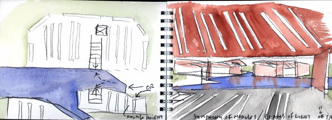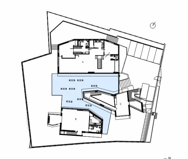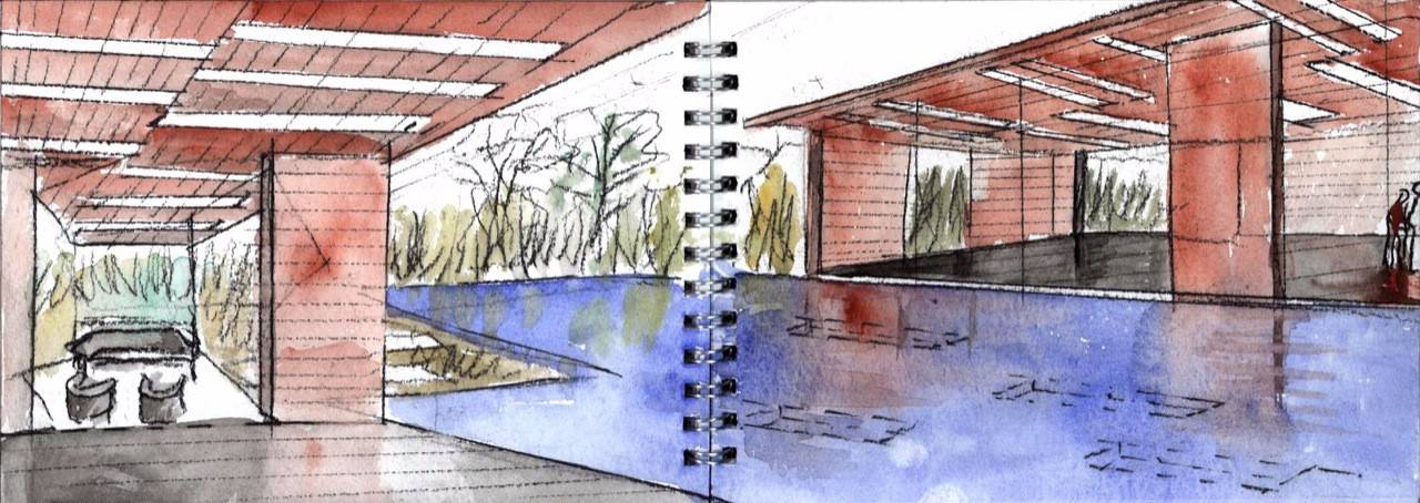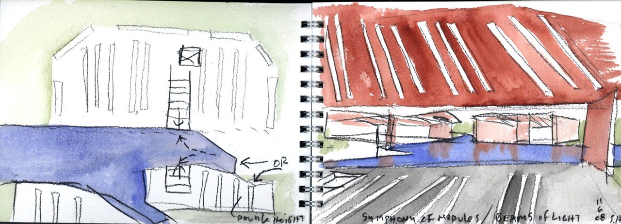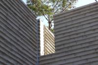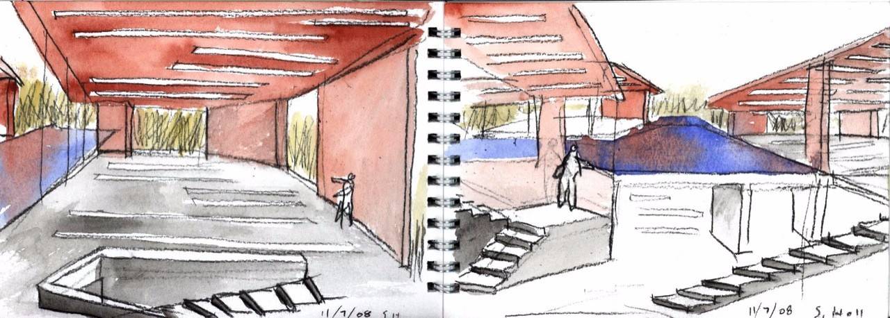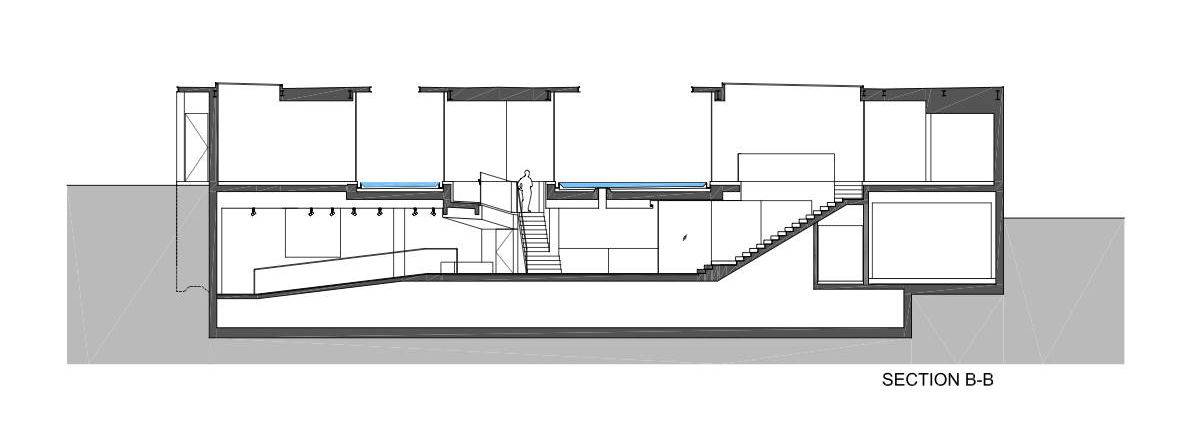 建筑由三個(gè)亭子體塊組成; 分別用于入口,住宅和活動(dòng)空間,逐漸從下層的連續(xù)畫(huà)廊向上疊加。一片水域出現(xiàn)在一二層平面之間。在被日光照射之前這片空間是靜謐的,當(dāng)亭子屋頂上的55個(gè)天窗條形開(kāi)啟扇被打開(kāi),自然光從天窗傾瀉而下整個(gè)空間都被點(diǎn)亮激活。