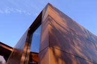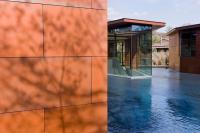 在每個(gè)展館都有5條透明玻璃條讓日光進(jìn)入到空間并根據(jù)一天的時(shí)間和季節(jié)變幻扭轉(zhuǎn)彎曲,自由變幻。展館內(nèi)的景觀由反射池構(gòu)成,由垂直于天窗條的花園圍合了起來(lái)。