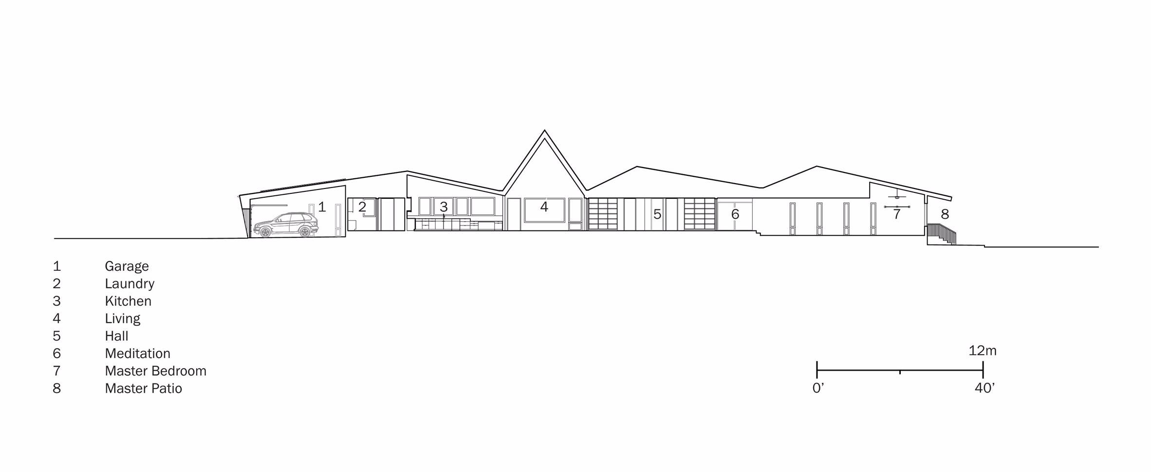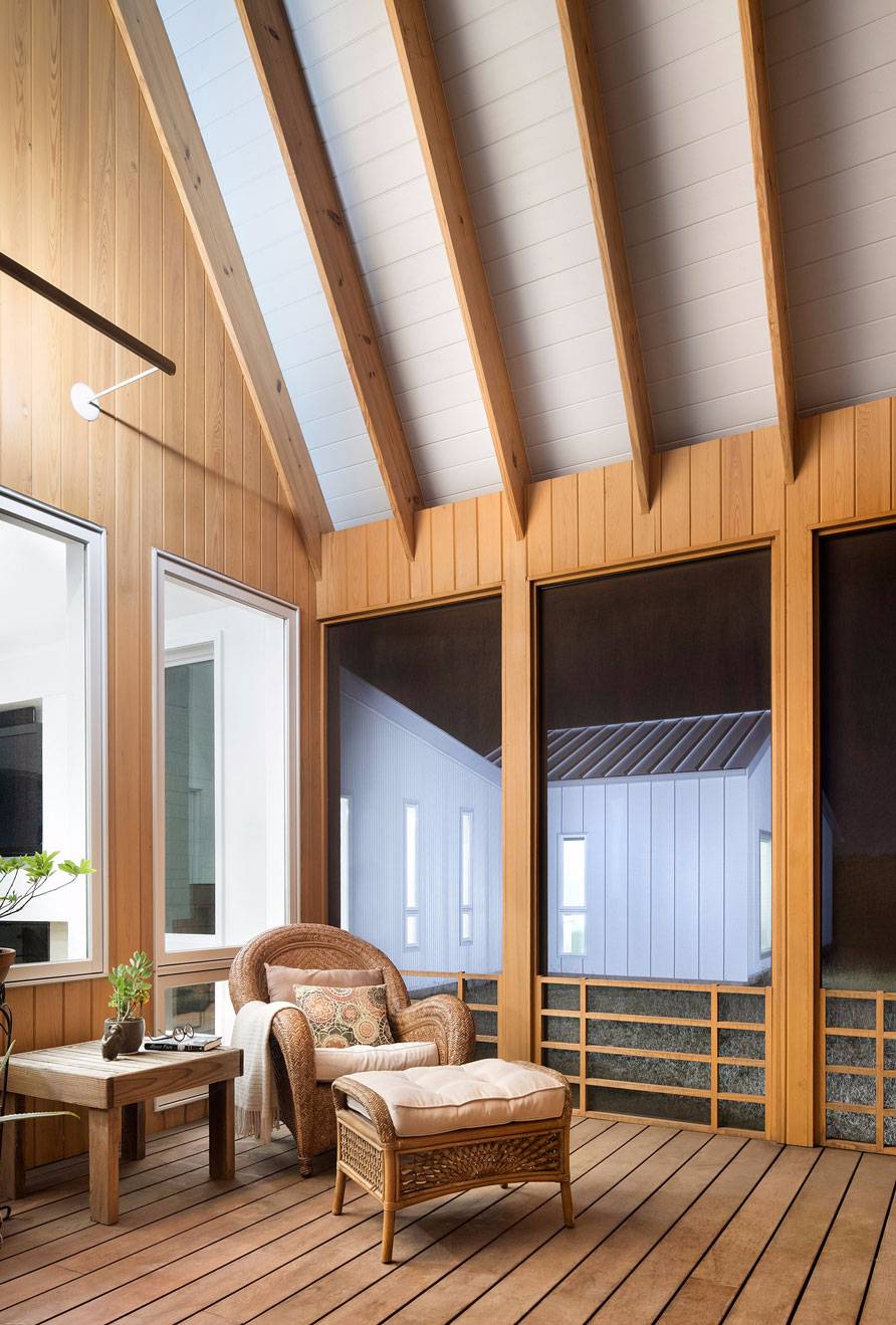 休息室位于山墻部分,旁邊是內(nèi)襯百葉幕墻的門廊。走廊通向客用臥室、浴室和健身房,房子的另一端是主人套房。車庫外面是帶有遮陽的庭院,同樣用木材做飾面,與山墻兩端的飾面效果相搭配。這個室外區(qū)域被設(shè)計成室外雕塑工作室,同時也是房主舉辦小音樂會的舞臺。