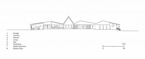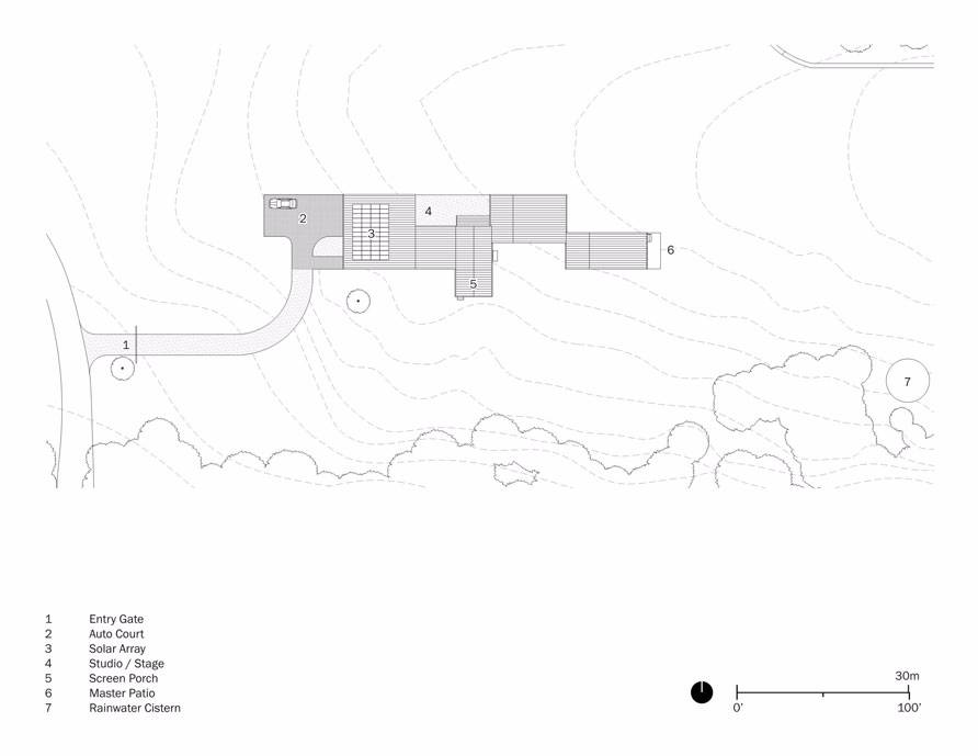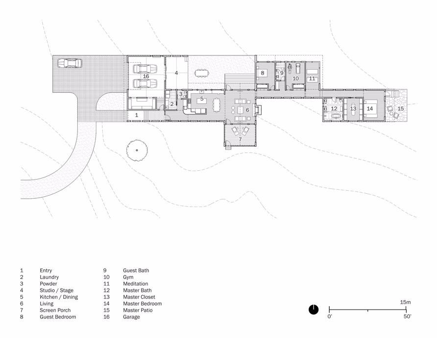 整座住宅呈線性分布,僅設(shè)一層,建筑面積為5,100平方英尺(合475平方米),場地面積達(dá)44.7英畝(18.8公頃),在德克薩斯溫布利一片指定的大型野生動物管理區(qū)內(nèi)。該場地內(nèi)時常有候鳥遷徙過境,房屋多年來一直堅持對它們進(jìn)行數(shù)目記錄。房子坐落在一片起伏的草地上,被一系列短柱子抬離地面,水流可以在架空層內(nèi)自由流動。