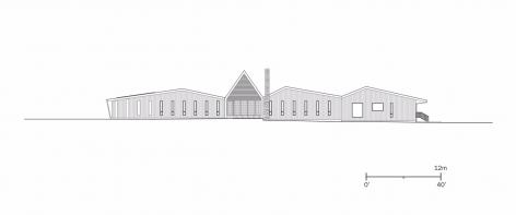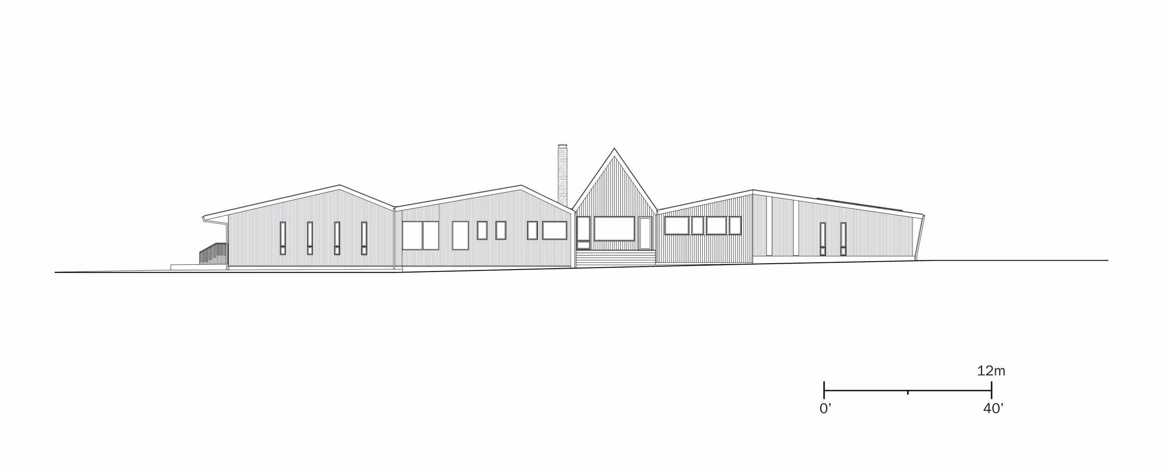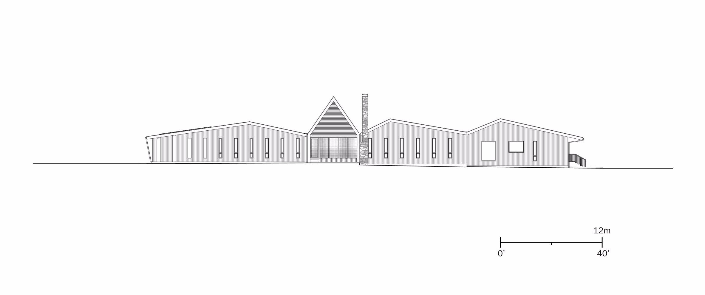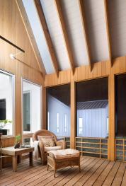 住宅中一個更具傳統(tǒng)風(fēng)格的元素是逐漸變細(xì)的煙囪,外部以石灰石覆蓋,該細(xì)部設(shè)計是為了地區(qū)的鄉(xiāng)村建筑風(fēng)格以及一幢場地中原有的棚屋有所聯(lián)系。在建筑物的中心是鋸齒屋頂?shù)纳椒宀糠?,最高處?0英尺(合九米),外部以暖色調(diào)的雪松木作為飾面材料。坡屋頂?shù)囊粋?cè),水平向鋪就的板條在白天能讓日光濾入,到了夜晚透出淡淡的光芒。