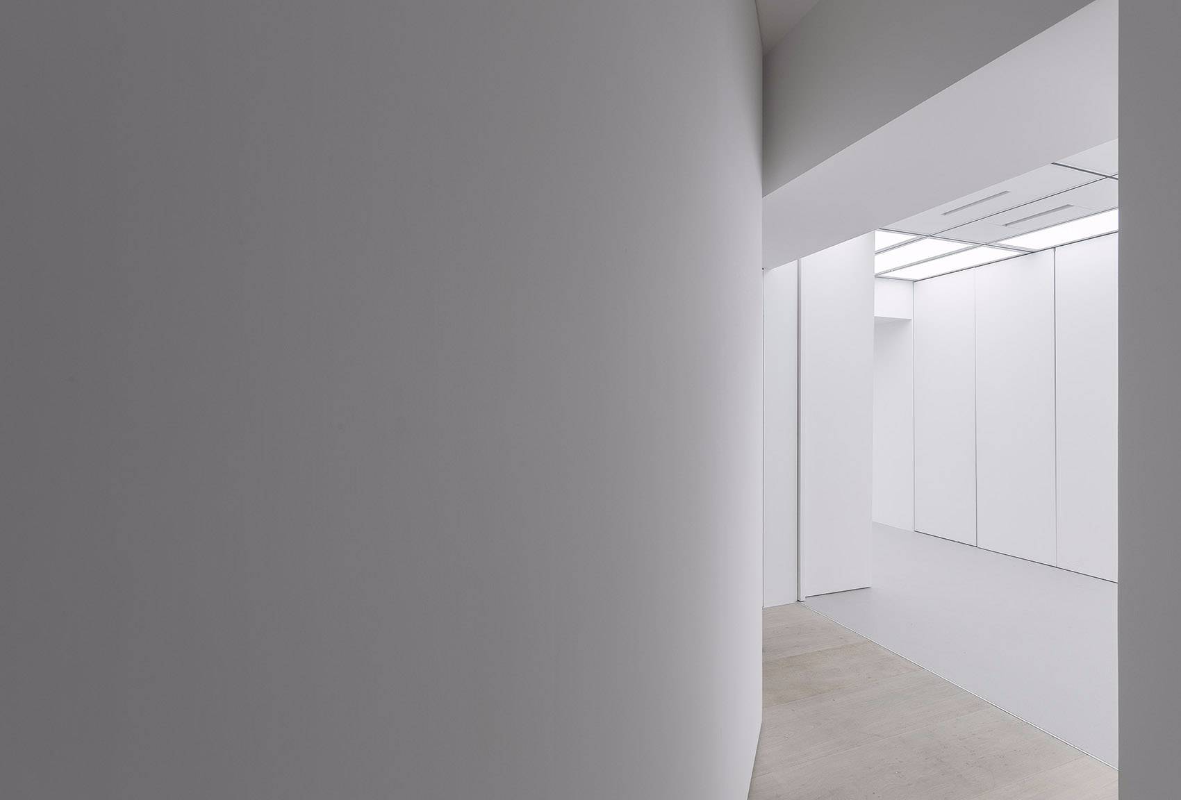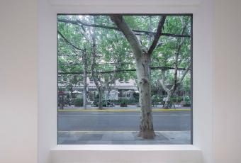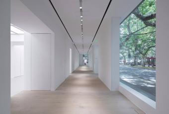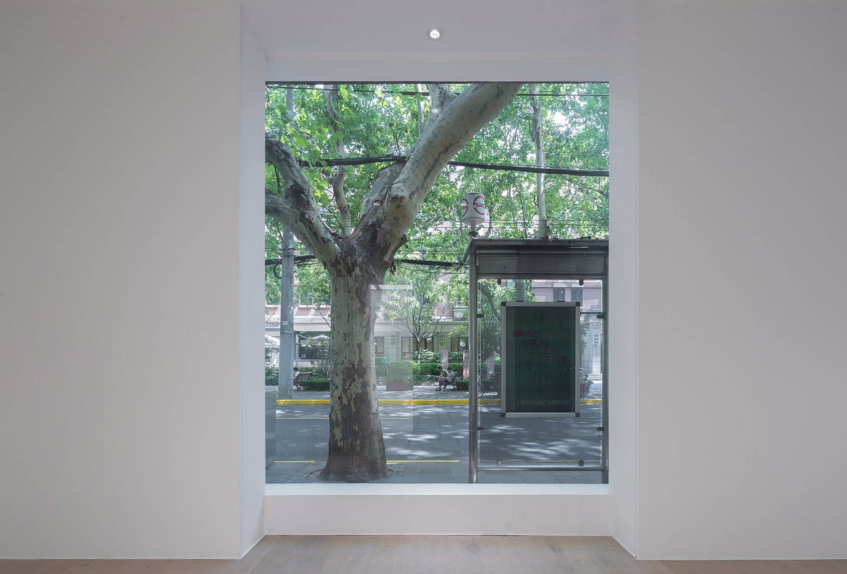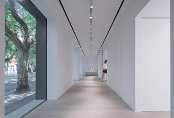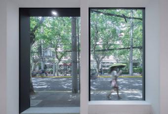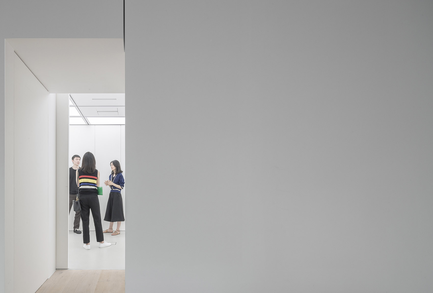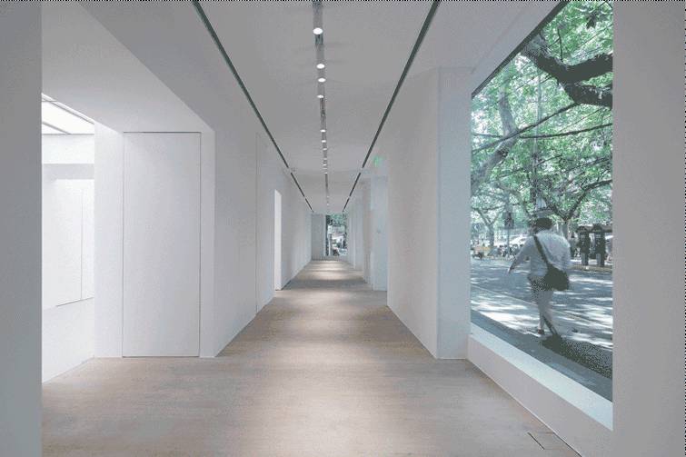 對于Gallery的外立面,萬社拆除了原本繁瑣的12扇玻璃幕墻,以最大化玻璃展示的方式配合整個空間的原始結構,營造了一個干凈且直接的外立面。簡單直接的門窗展示使客人能清晰直觀的看到畫廊里的內容,在復雜及熱鬧的街道中以寧靜清透的個性實現(xiàn)了現(xiàn)代畫廊與歷史建筑的對話。