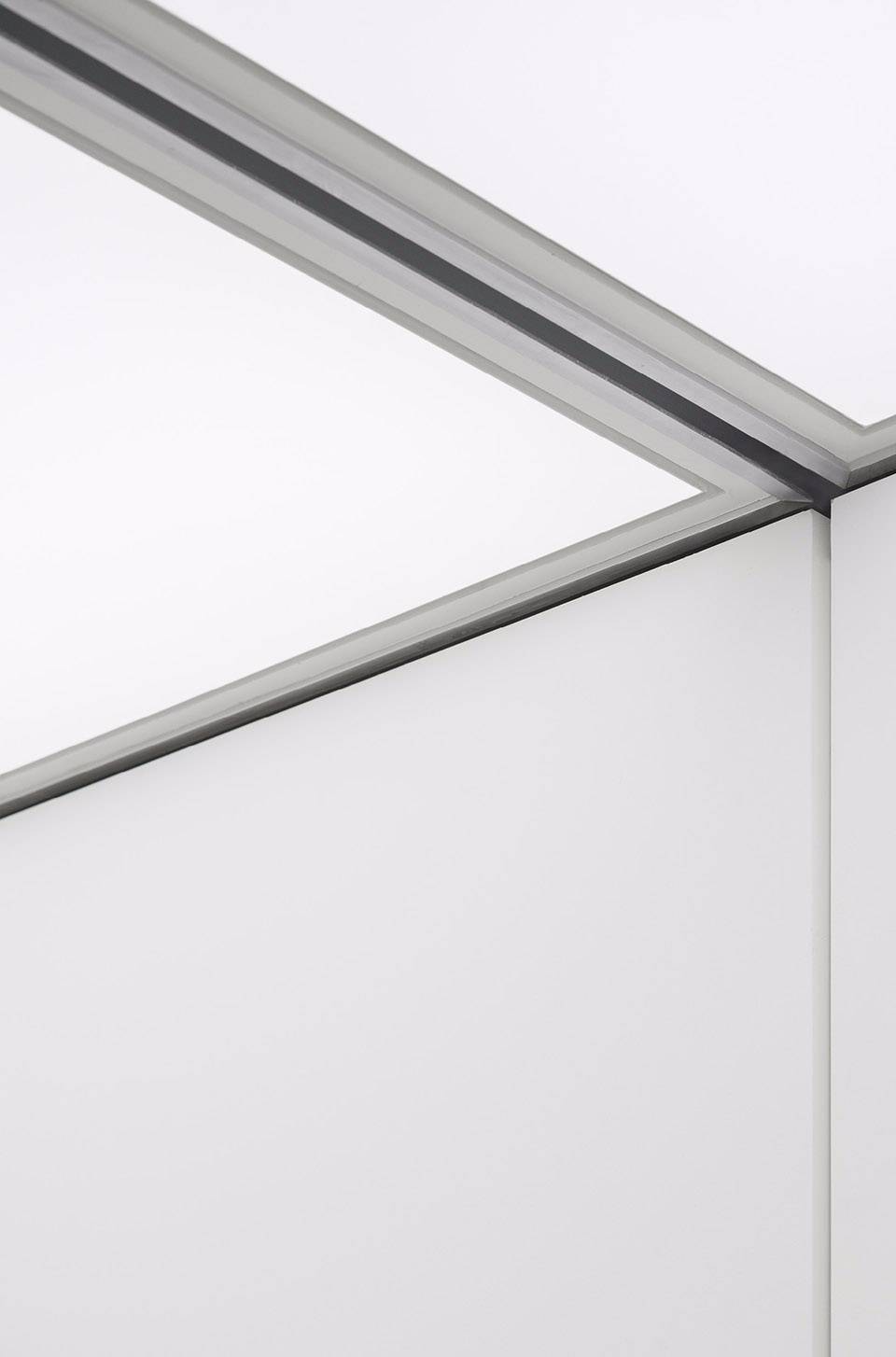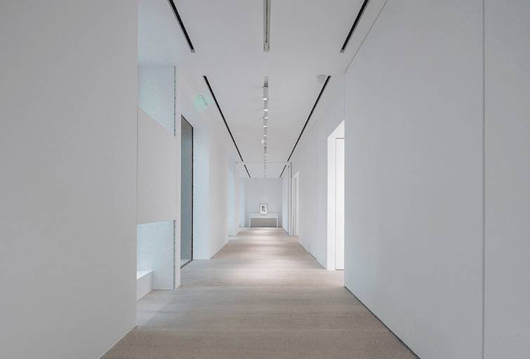 內部區(qū)域使用了軌道吊頂及天光結合的設計語言,讓空間呈現(xiàn)通透干凈的質感,讓游覽者能更多的關注兩側的展示畫作。而兩側展板可按需求自由的旋轉移動,制造出不同的空間布局跟展覽方式。方便后期各式各樣的展覽及行為藝術,表演等。