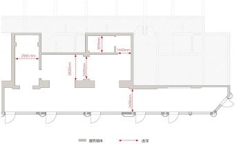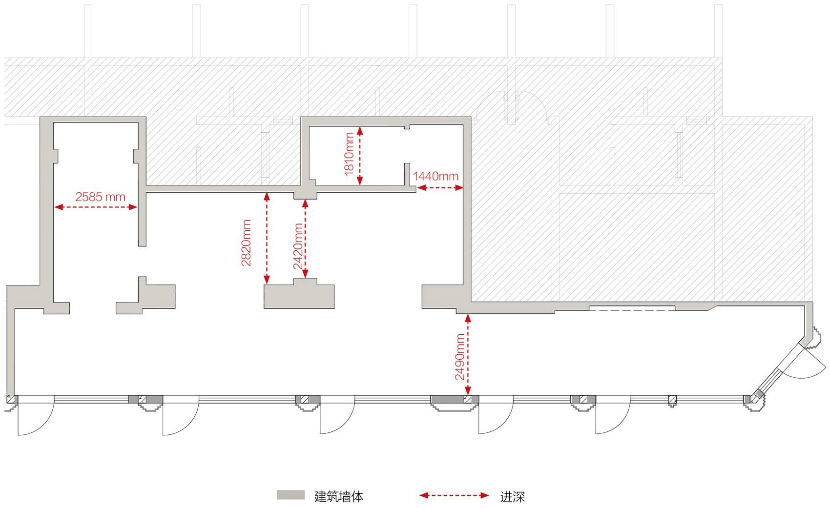 該項目位置早期原為上海的金庫,所以結構墻本身非常厚實且不能改變。結構墻體凹凸不平,內部空間被結構墻分隔成了若干部分,空間的靈活性不足且平面以細長型布局呈現(xiàn)。項目進深小,最寬的地方進深僅為 2.82 m。