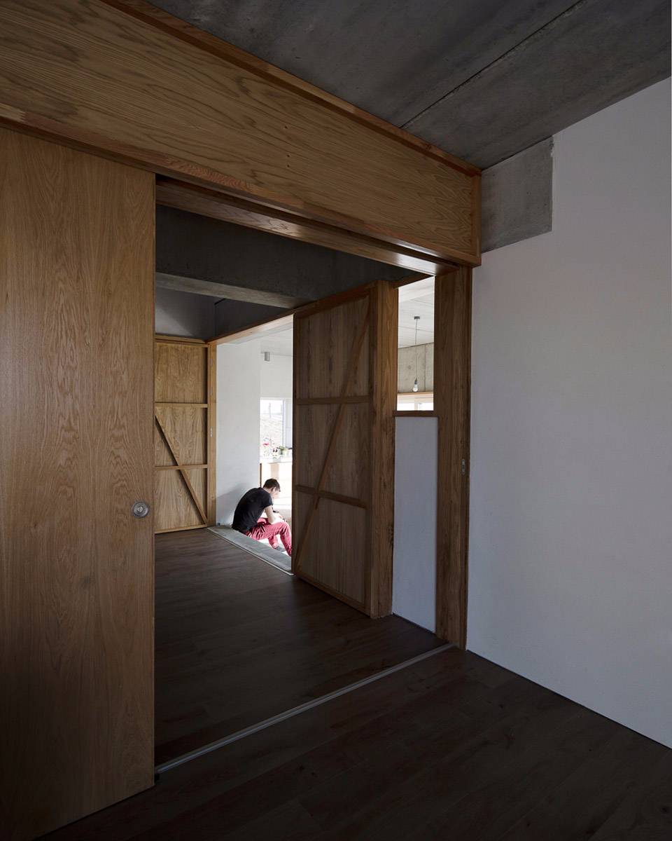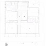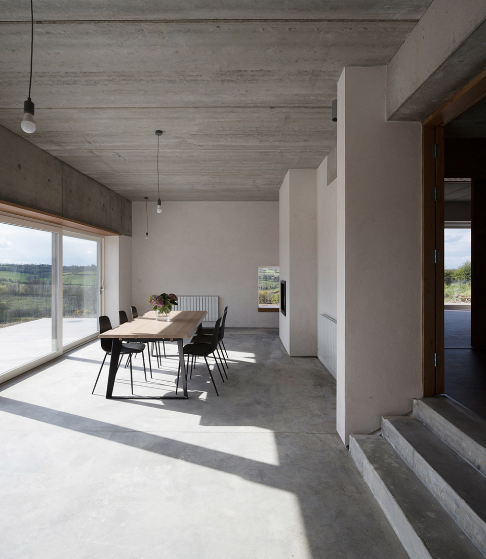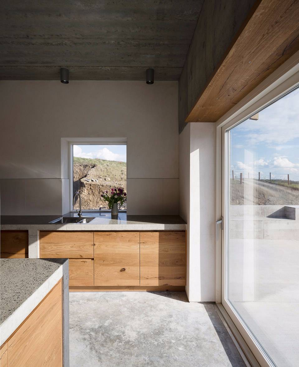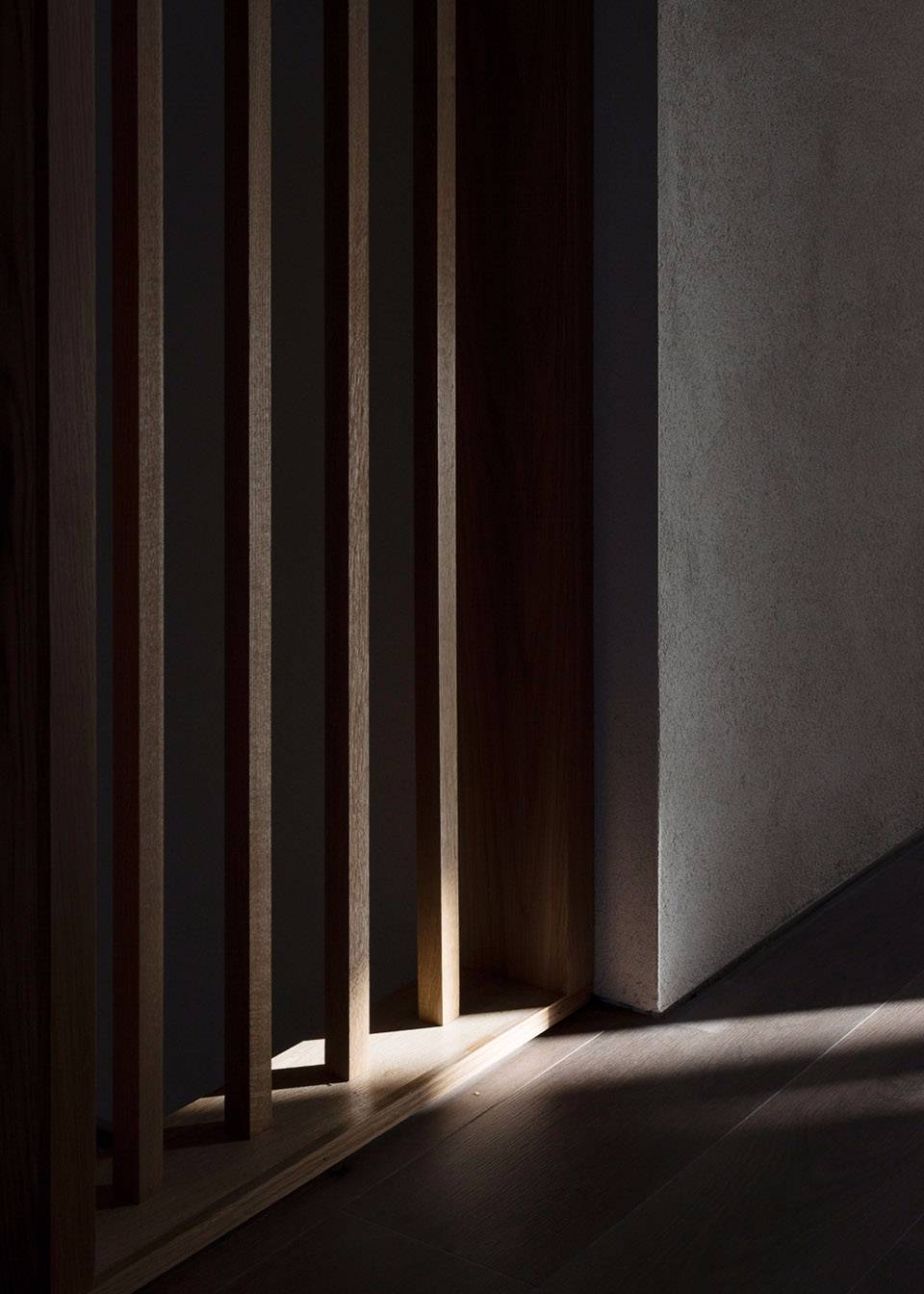 設(shè)計(jì)師故意將屋頂設(shè)計(jì)得很“奇怪”,仿佛溶洞一樣。屋頂內(nèi)部裝有隱蔽的燈,打開后能照亮屋頂頂部。房屋內(nèi)部,廚房和其他功能空間之間的隔斷墻頂部與混凝土橫梁相接,這樣順著墻看能看到整個(gè)屋頂。