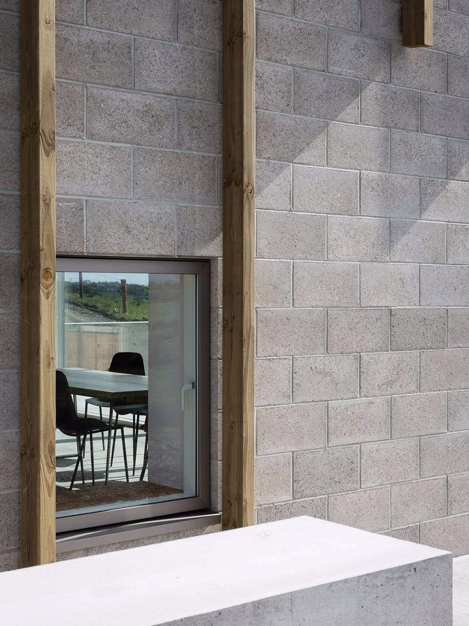 擴(kuò)建部分的結(jié)構(gòu)采用了混凝土磚,外露毛面混凝土橫梁,屋頂材質(zhì)選用落葉松木。藍(lán)色鋅制的屋頂?shù)臒粞刂菁惯B續(xù)排布。