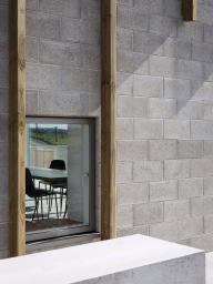 ▼建筑采用了混凝土磚,外露毛面混凝土橫梁,屋頂材質(zhì)選用落葉松木