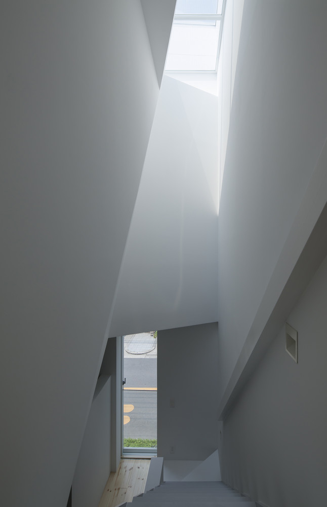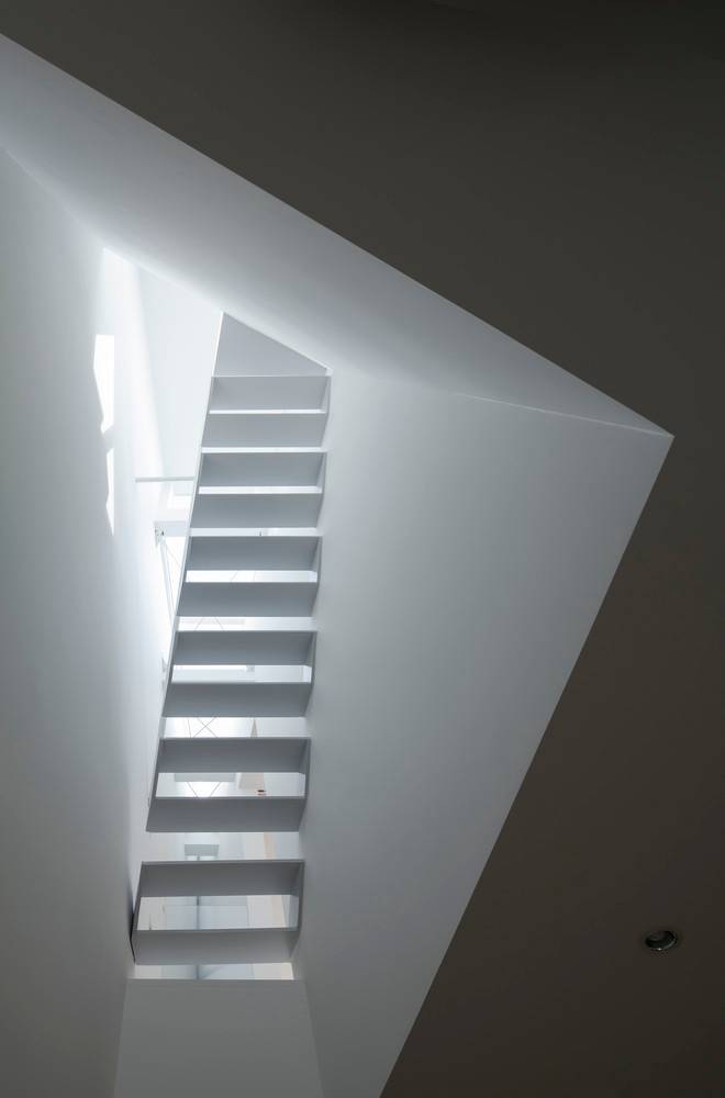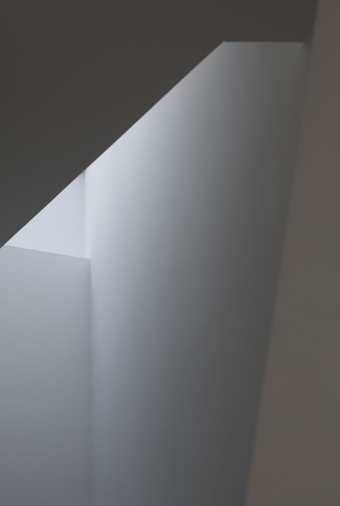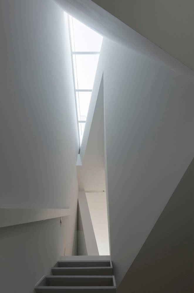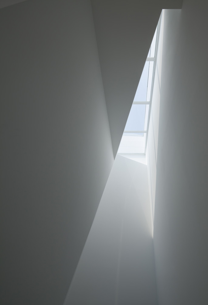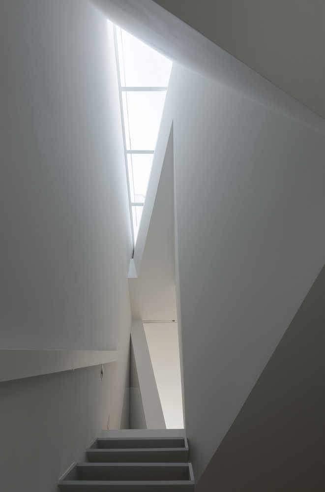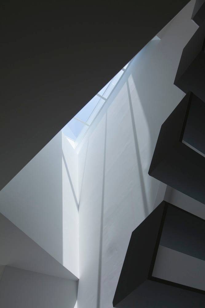 此外,兩堵墻旋轉14度,二樓的布置也傾向于和墻體垂直,利用樓梯打開空間,形成了像折紙或面重疊的部分。該傾斜壁給人感覺感覺偏離常態(tài),觸摸傾斜和光,空間在反映出傾斜的程度的同時,引發(fā)一個全新的物理意義。