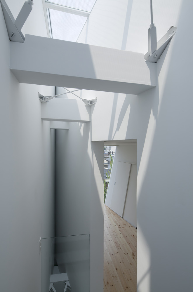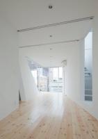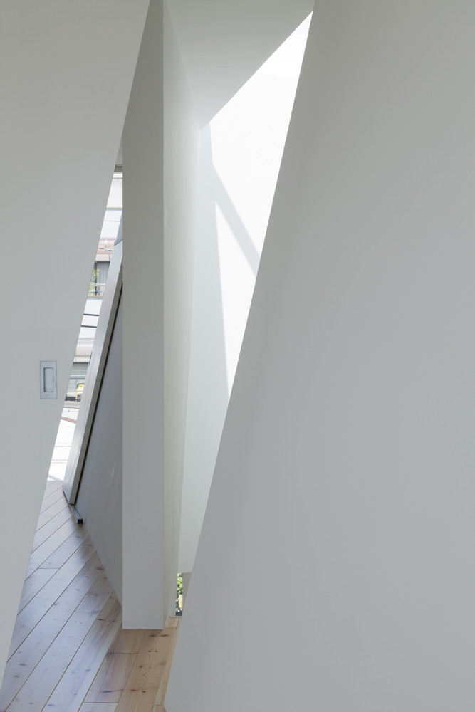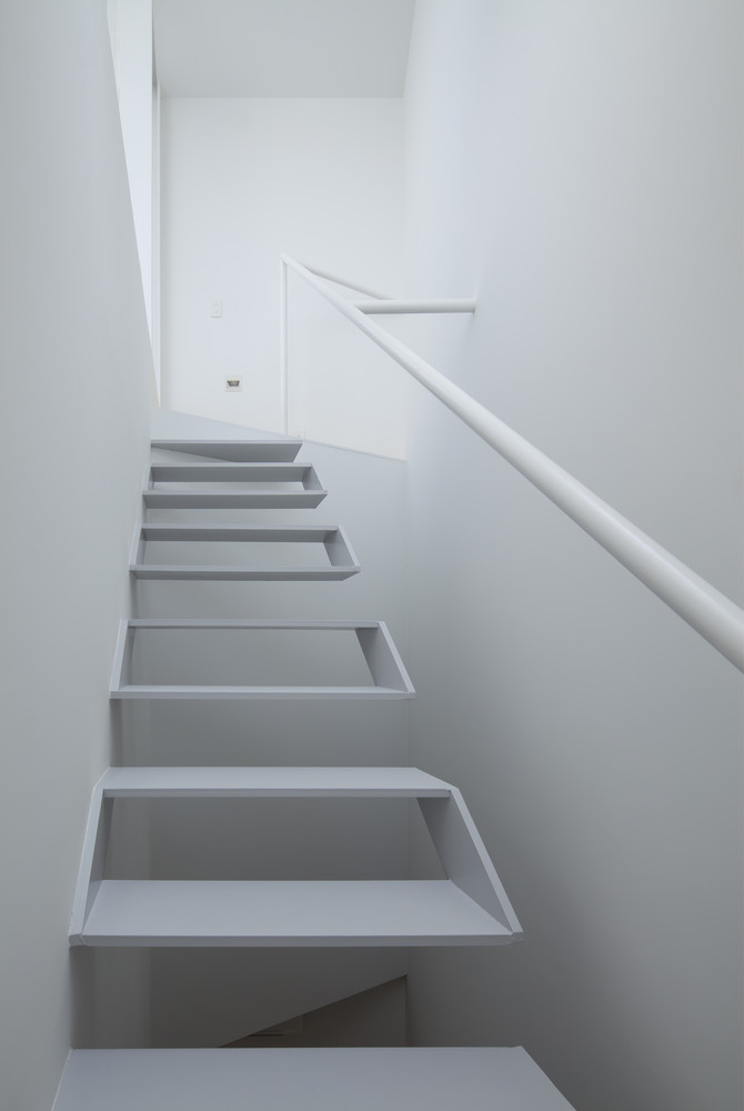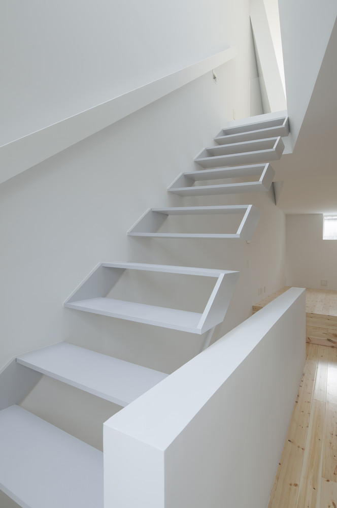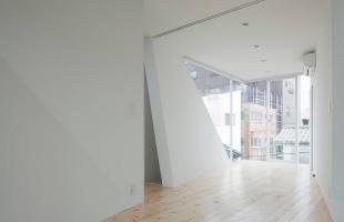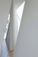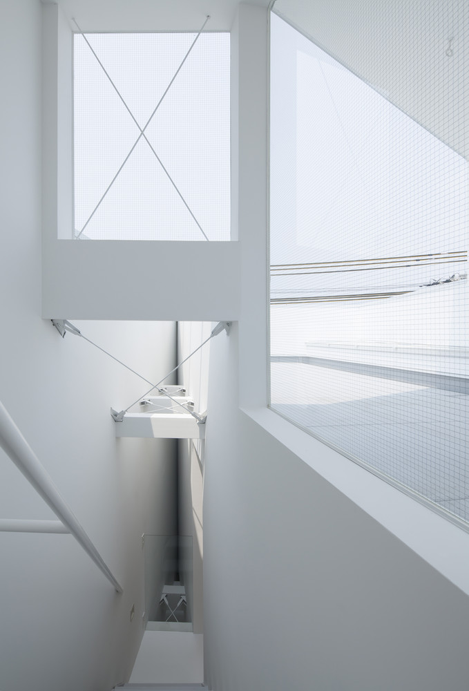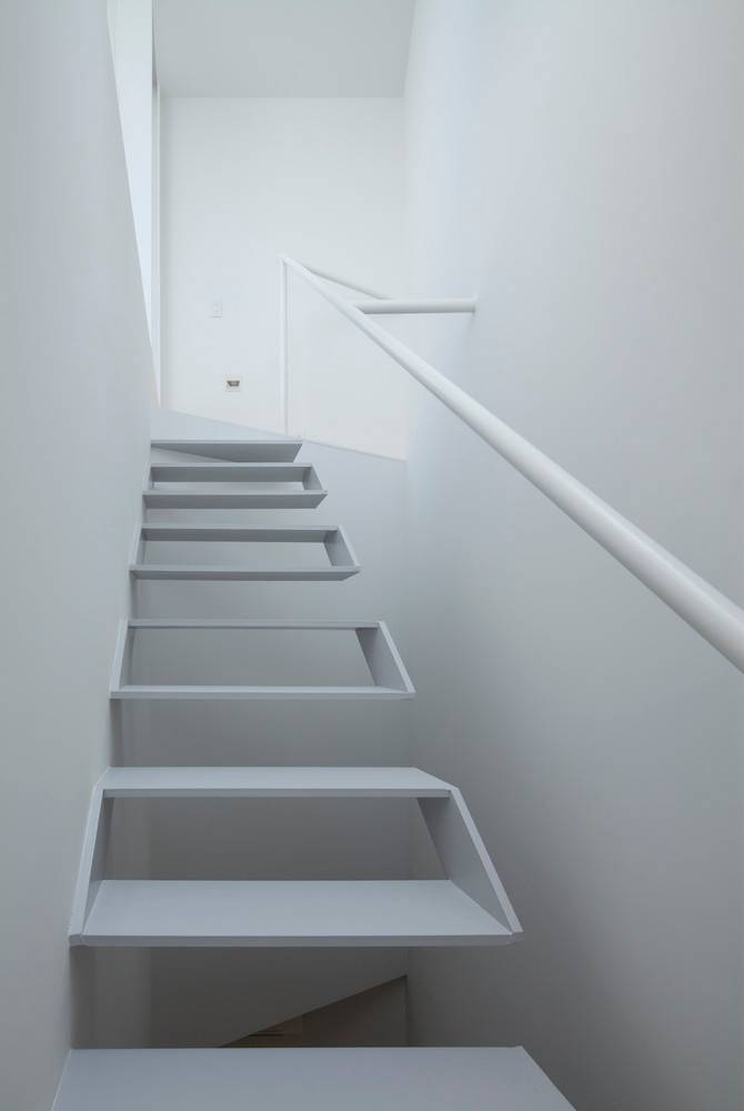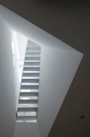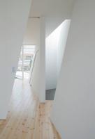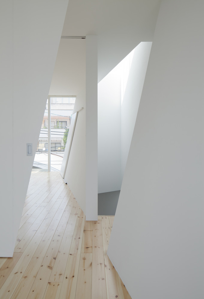 此外,兩堵墻旋轉14度,二樓的布置也傾向于和墻體垂直,利用樓梯打開空間,形成了像折紙或面重疊的部分。該傾斜壁給人感覺感覺偏離常態(tài),觸摸傾斜和光,空間在反映出傾斜的程度的同時,引發(fā)一個全新的物理意義。