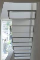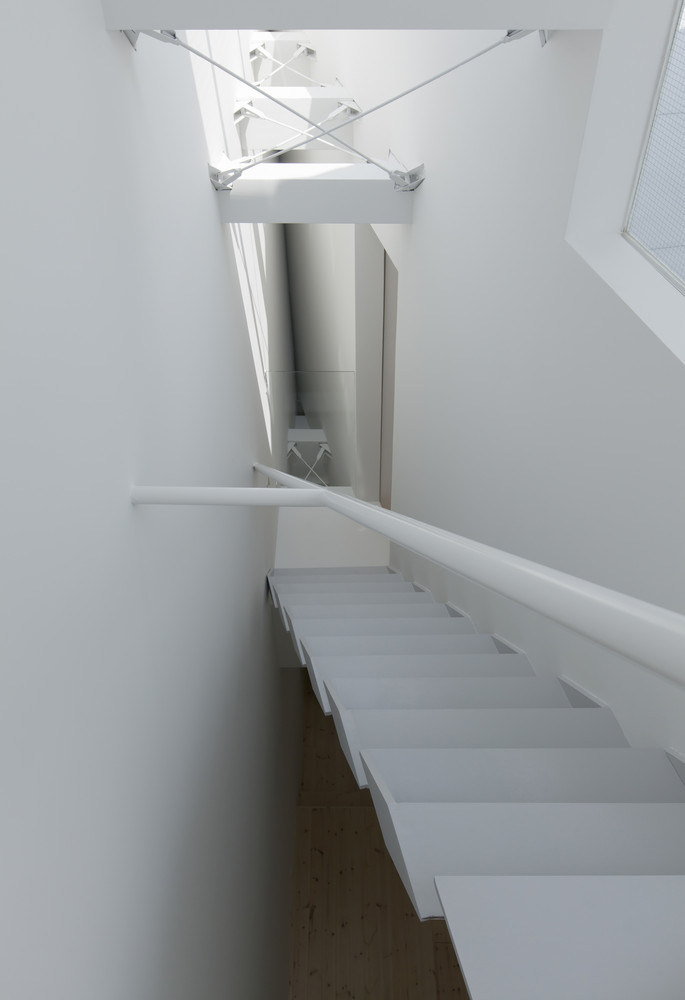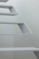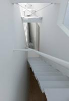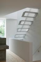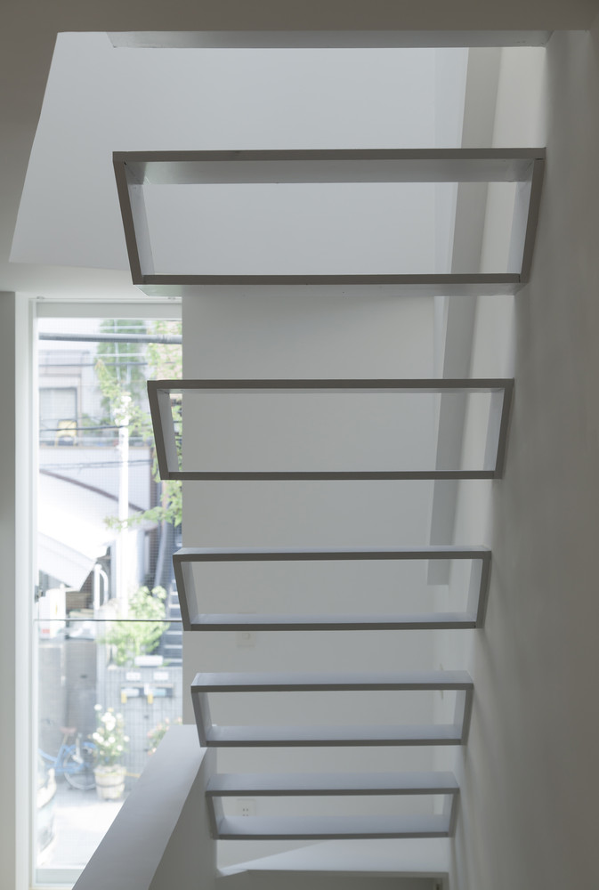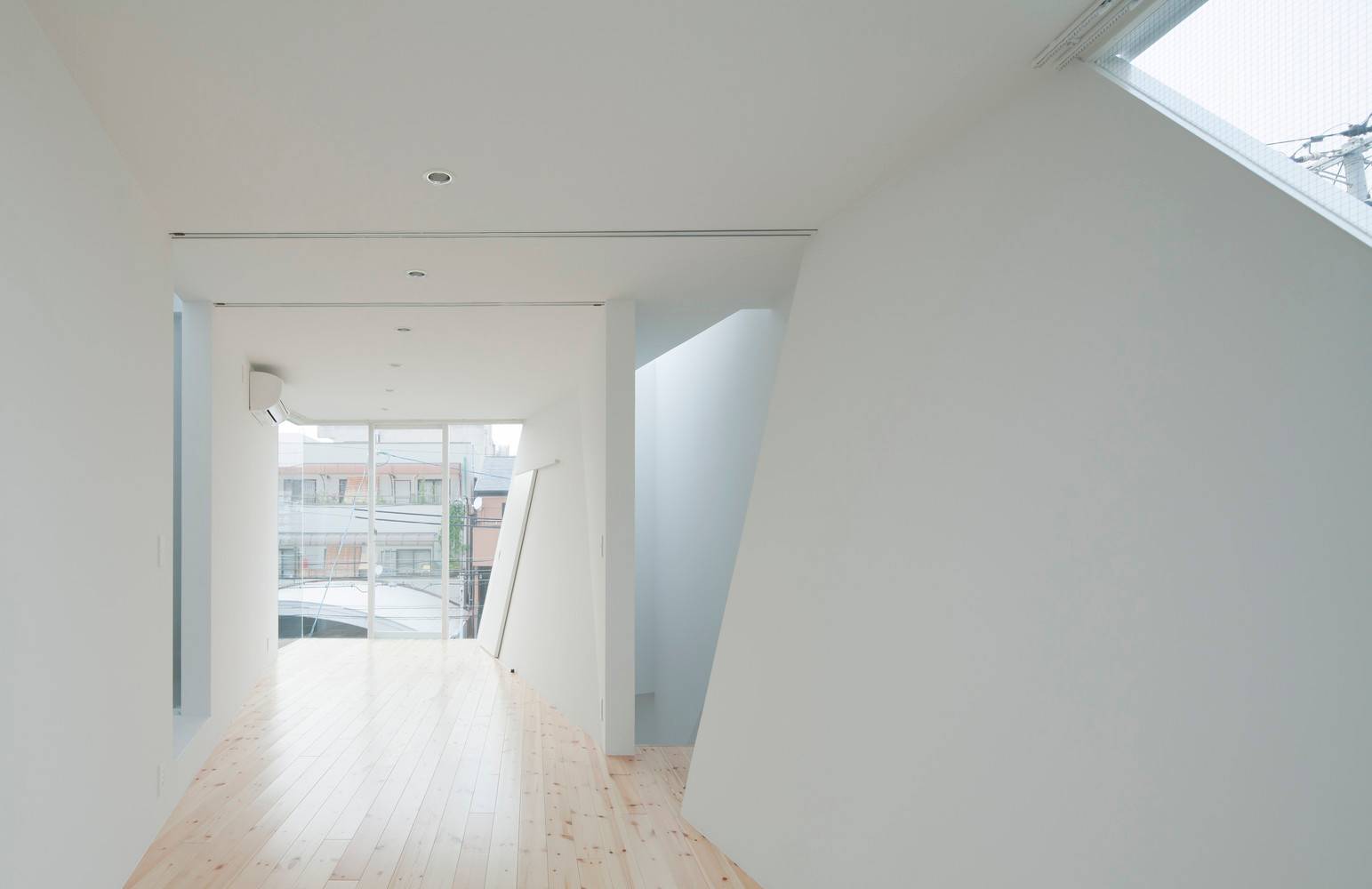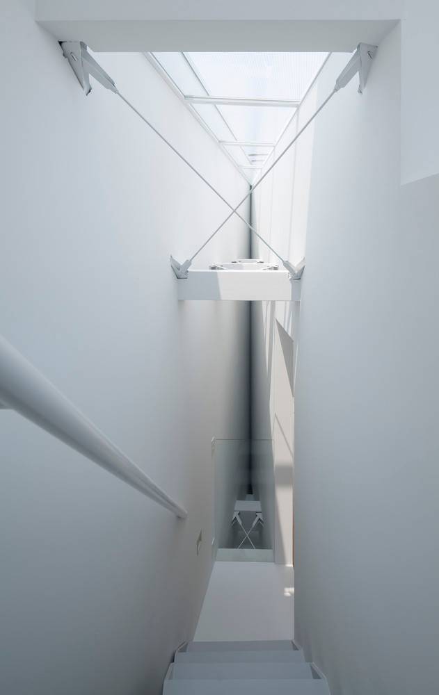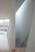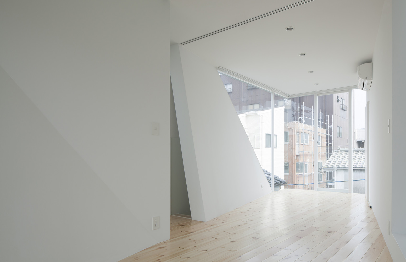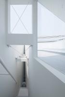 此外,兩堵墻旋轉14度,二樓的布置也傾向于和墻體垂直,利用樓梯打開空間,形成了像折紙或面重疊的部分。該傾斜壁給人感覺感覺偏離常態(tài),觸摸傾斜和光,空間在反映出傾斜的程度的同時,引發(fā)一個全新的物理意義。