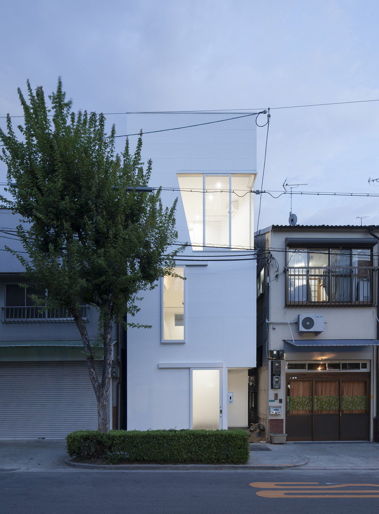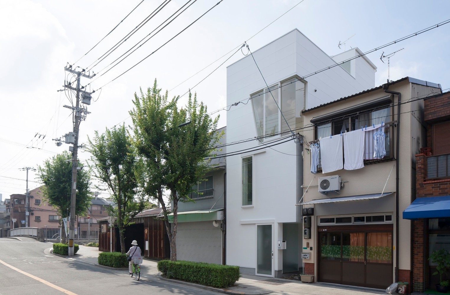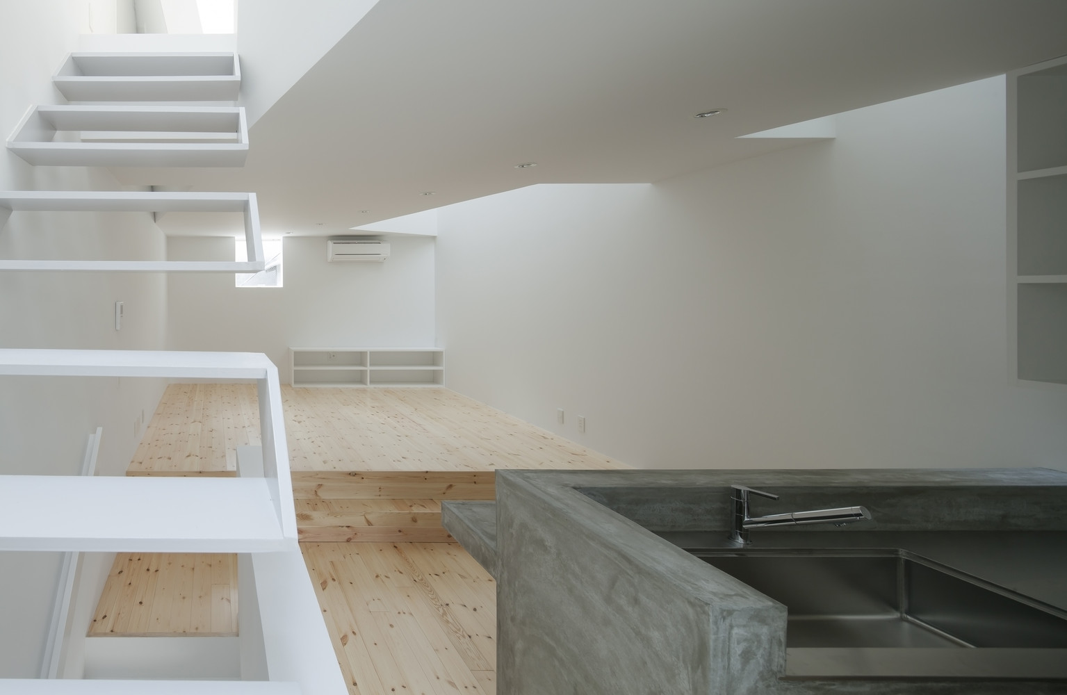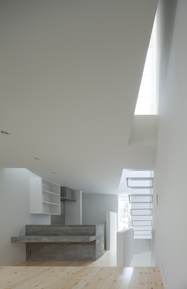 這房子是為有兩個孩子的家庭設計的。這所房子位于市區(qū)及一小塊在日本大阪只有43.21平方米的地方。地段周圍是混合使用的區(qū)域,小房子、小工廠和小辦公樓共存沒有任何的和諧。客戶的舊的居所也在這個地段,是一個木制的兩層樓的房子。相鄰部位接近,沒有自然光進入老房子。因此,客戶要求的家庭房(生活區(qū),用餐區(qū)和廚房)盡可能無柱,或使用道路承重墻,讓自然光進入屋內,尤其是進入家庭房內。