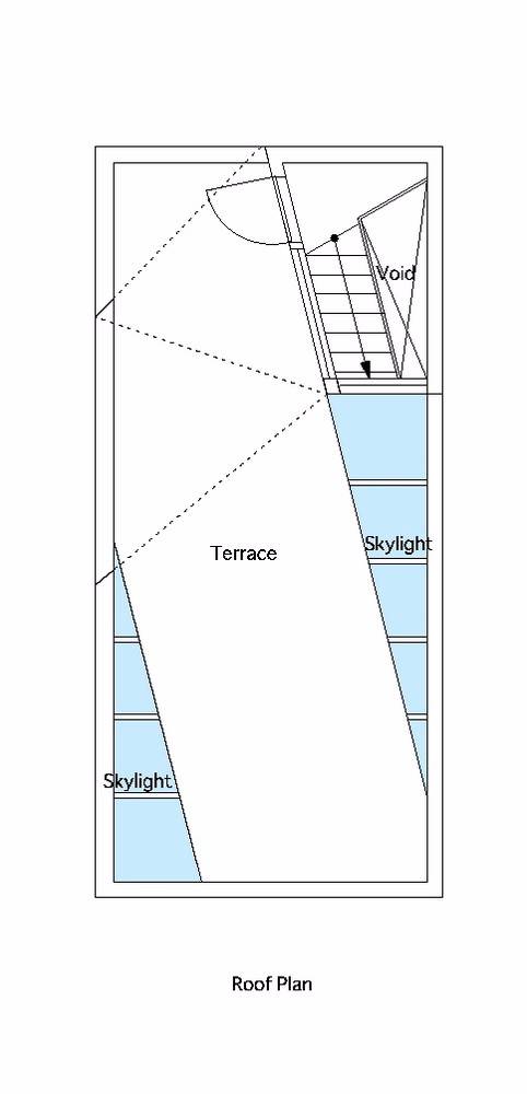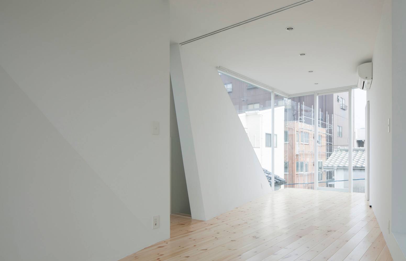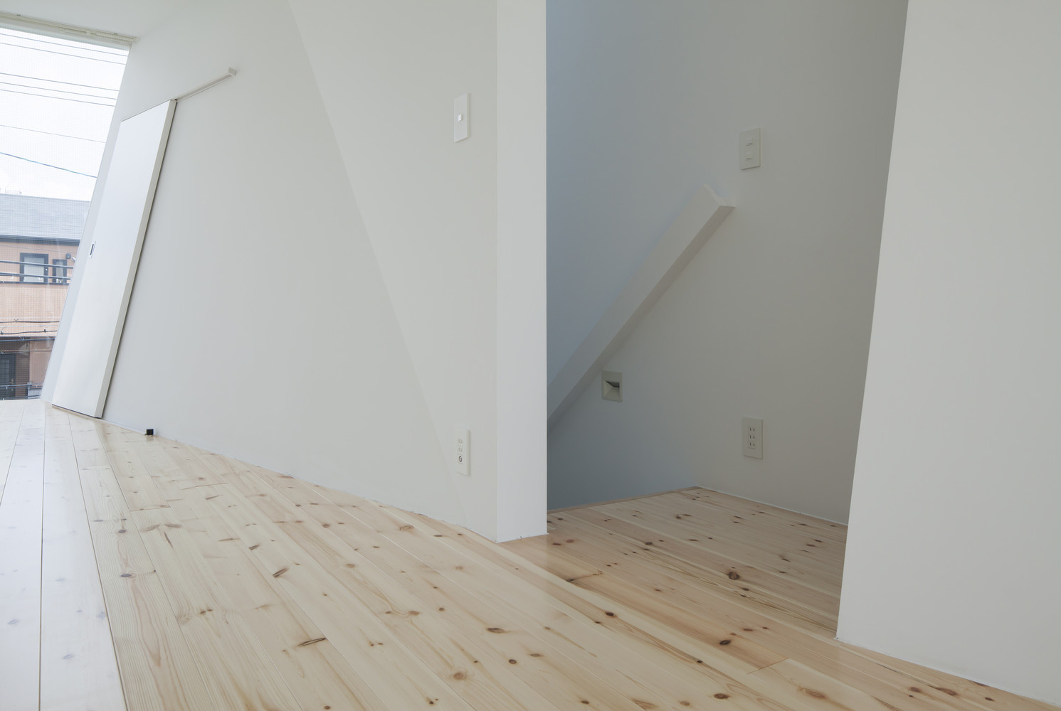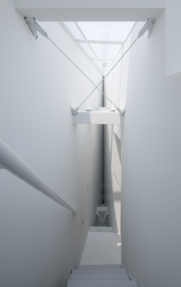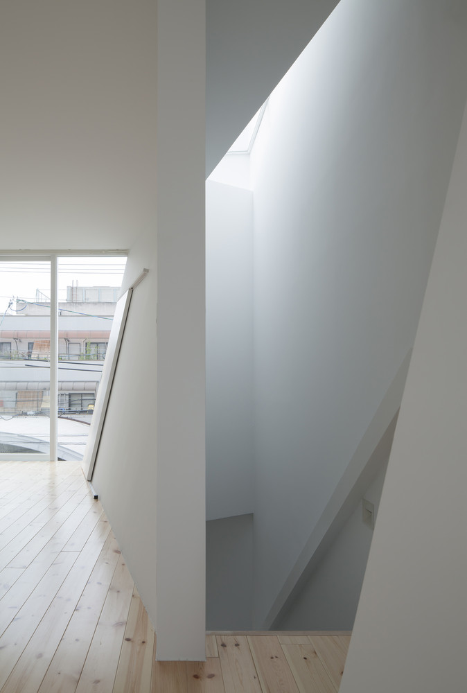 第一,因為該地段很窄,建筑物的體積占領了盡可能多的面積。根據(jù)客戶的生活方式,這對夫妻的臥室和潮濕地區(qū)被放置在一樓,孩子的房間放置在二樓,露臺放置在屋頂。由于結構性原因,開口只能開在靠近該建筑物的第一層的道路側。所以,我旋轉二樓的體積14度形成建筑物的軸線,并使旋轉壁和建筑物的外壁之間的間隙空間成為空孔。天窗置于虛空的上空,意在讓自然光進入一樓的家庭房。