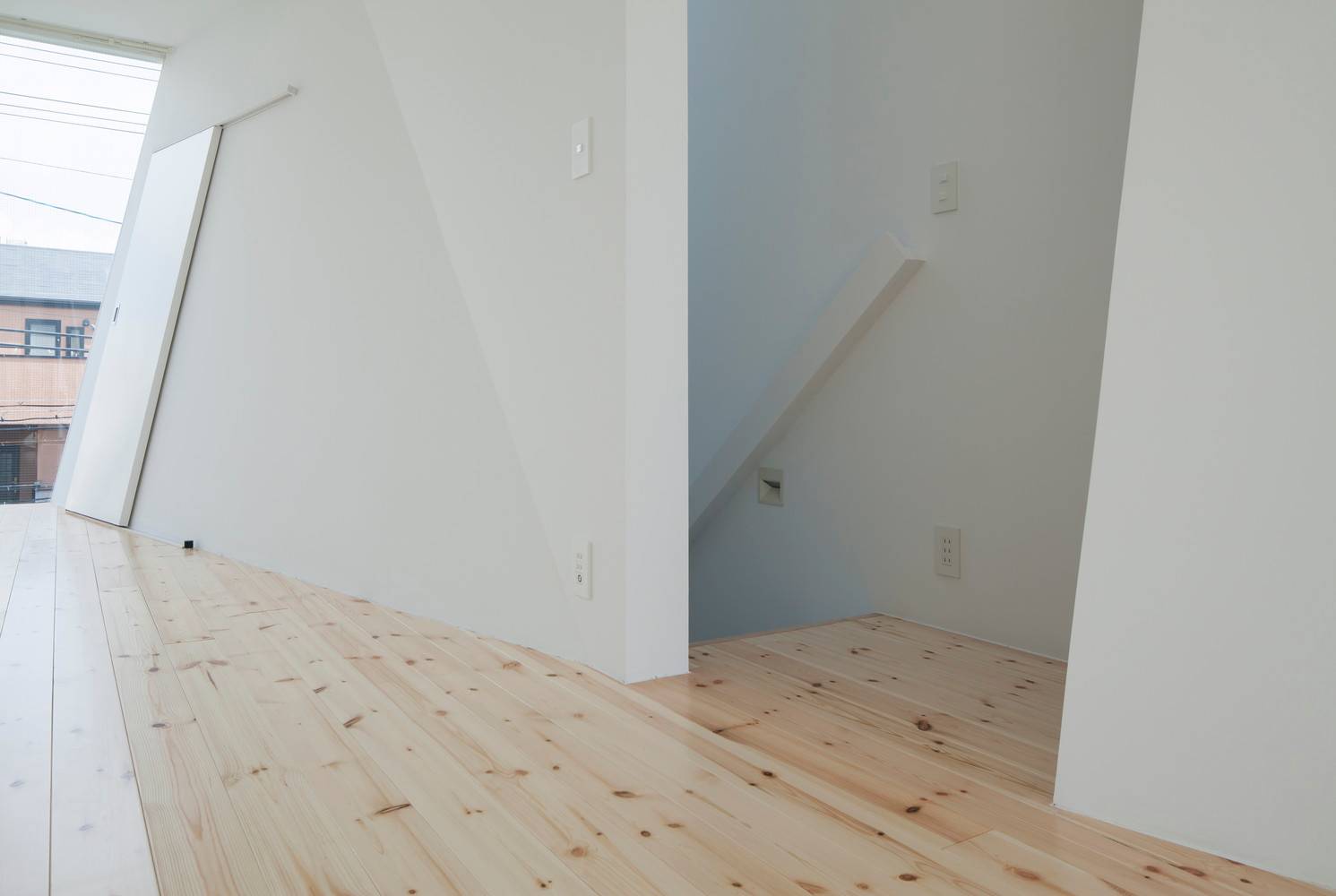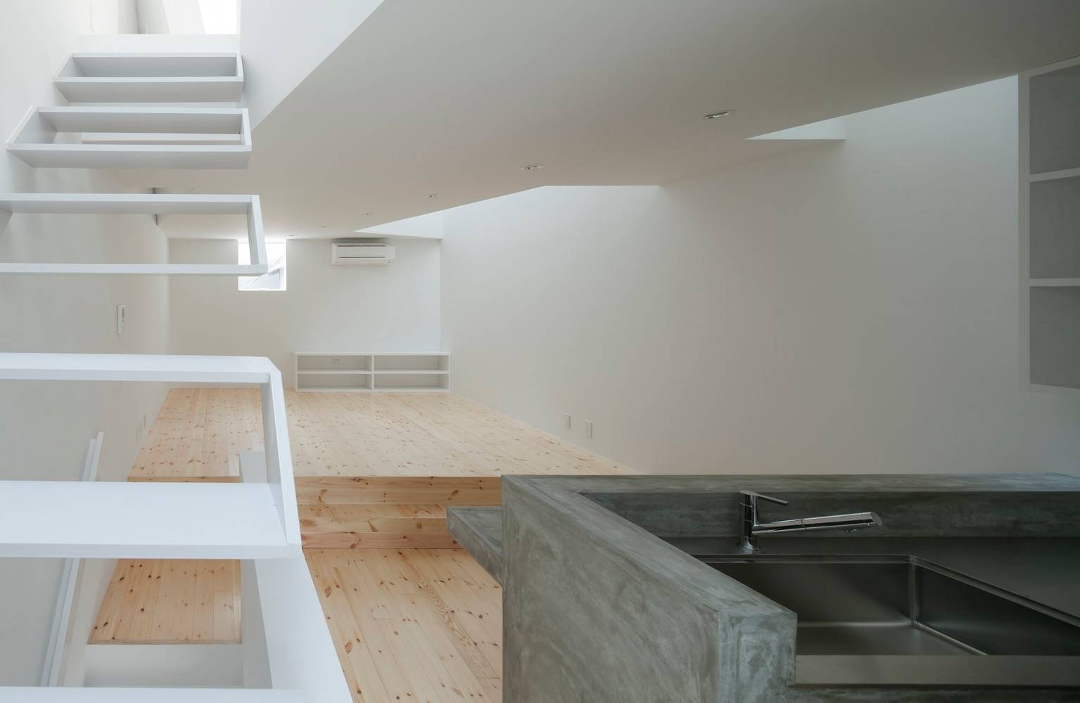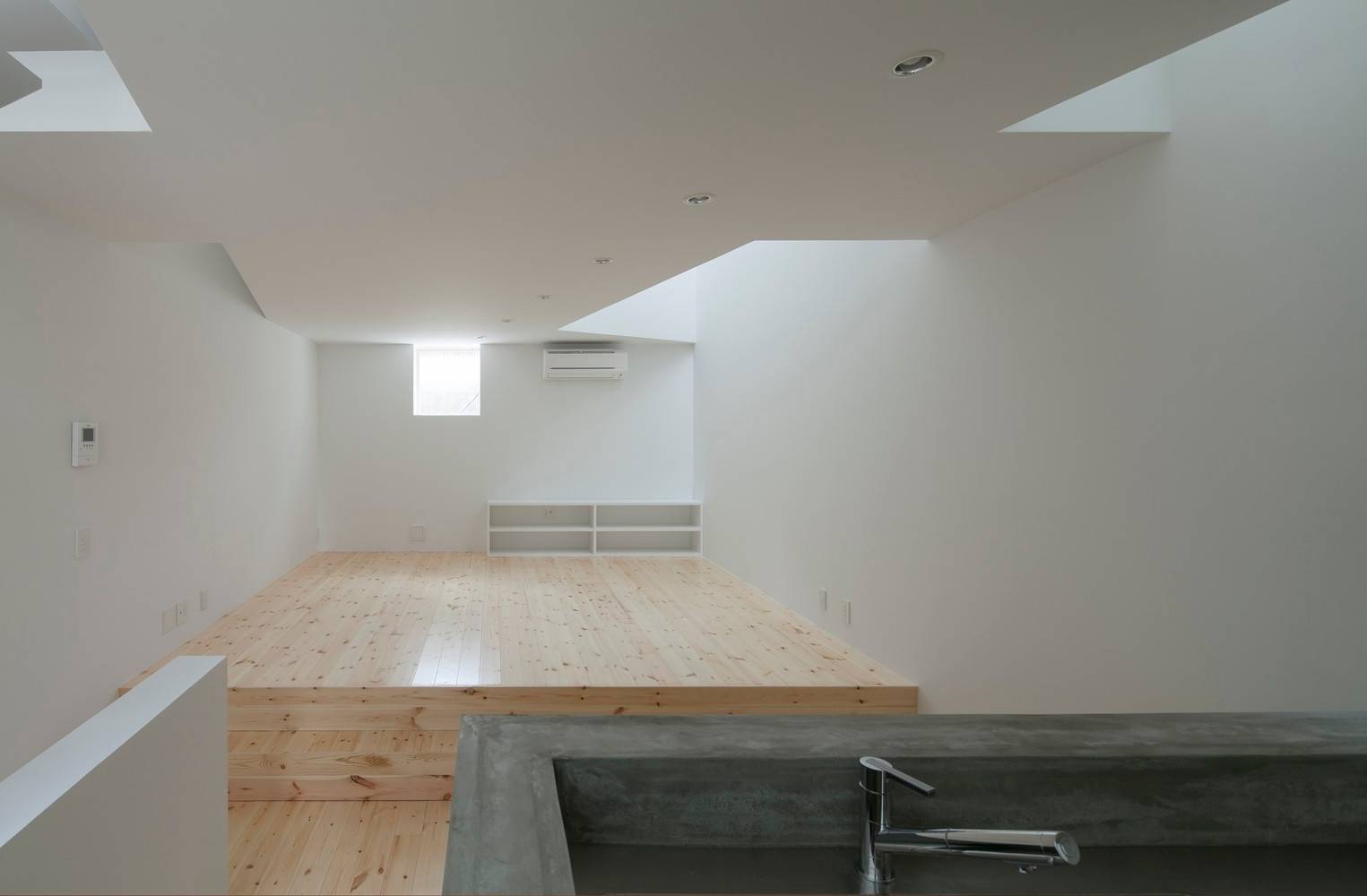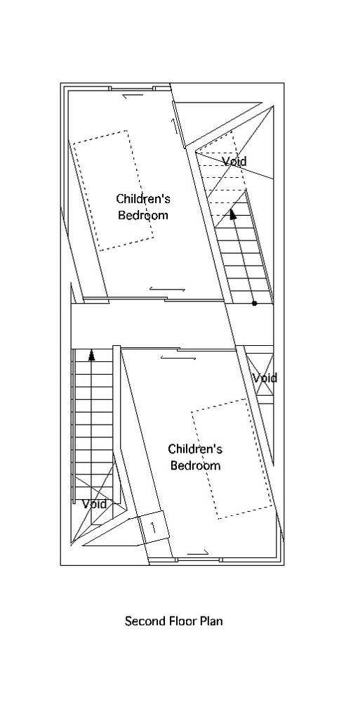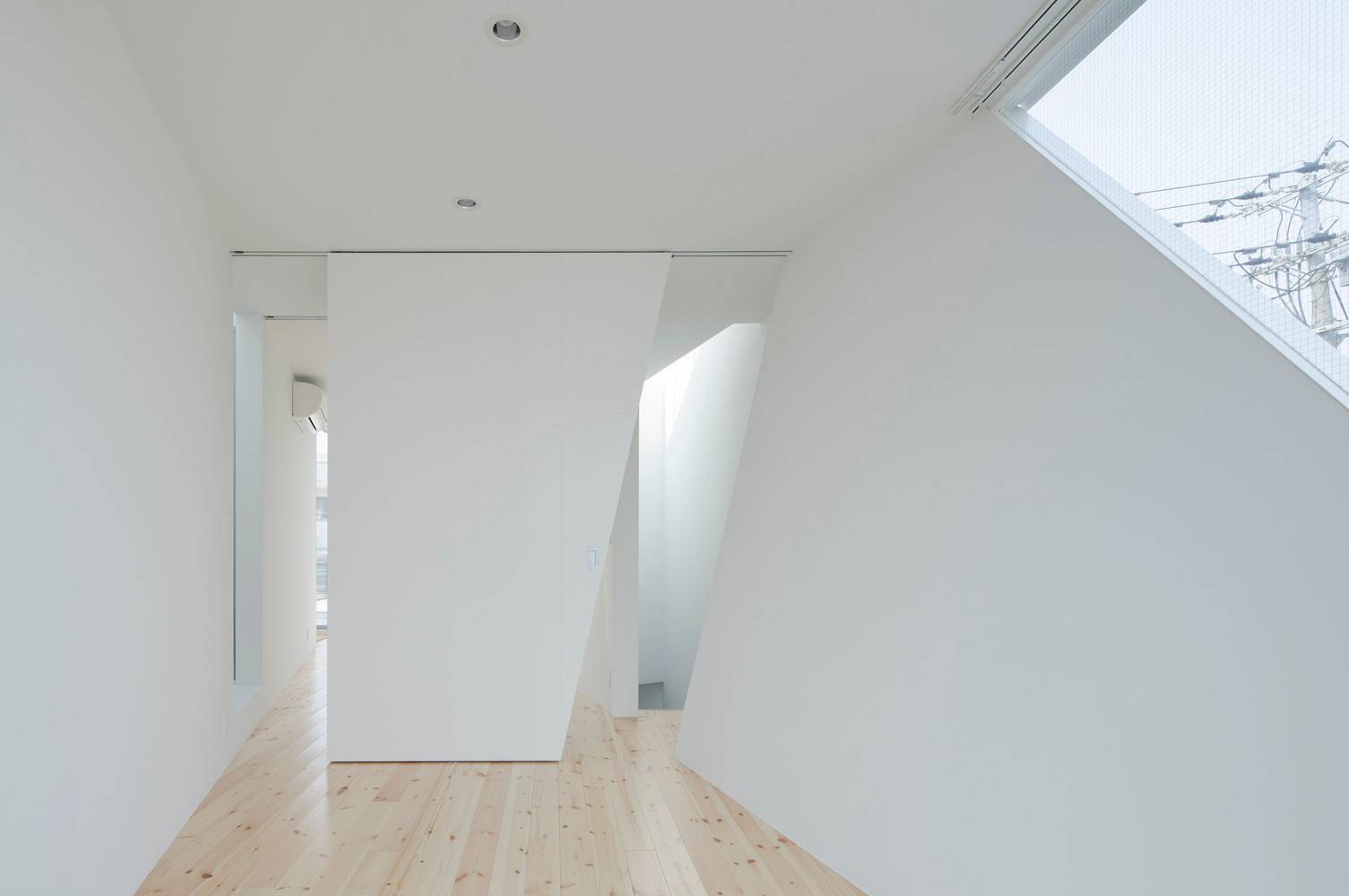 第一,因為該地段很窄,建筑物的體積占領了盡可能多的面積。根據(jù)客戶的生活方式,這對夫妻的臥室和潮濕地區(qū)被放置在一樓,孩子的房間放置在二樓,露臺放置在屋頂。由于結構性原因,開口只能開在靠近該建筑物的第一層的道路側。所以,我旋轉二樓的體積14度形成建筑物的軸線,并使旋轉壁和建筑物的外壁之間的間隙空間成為空孔。天窗置于虛空的上空,意在讓自然光進入一樓的家庭房。