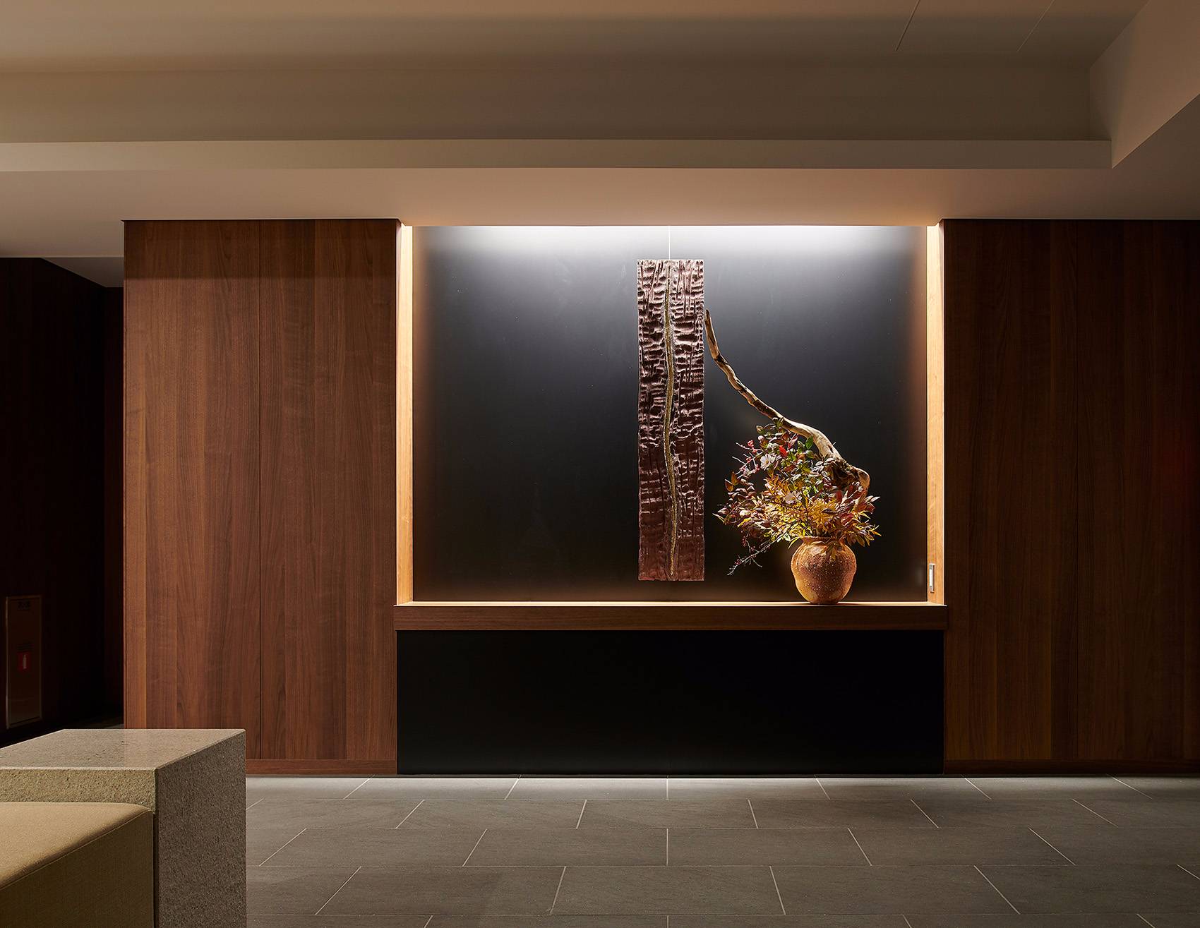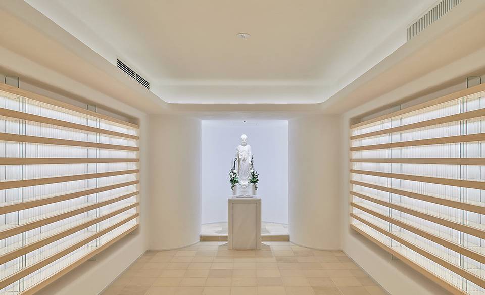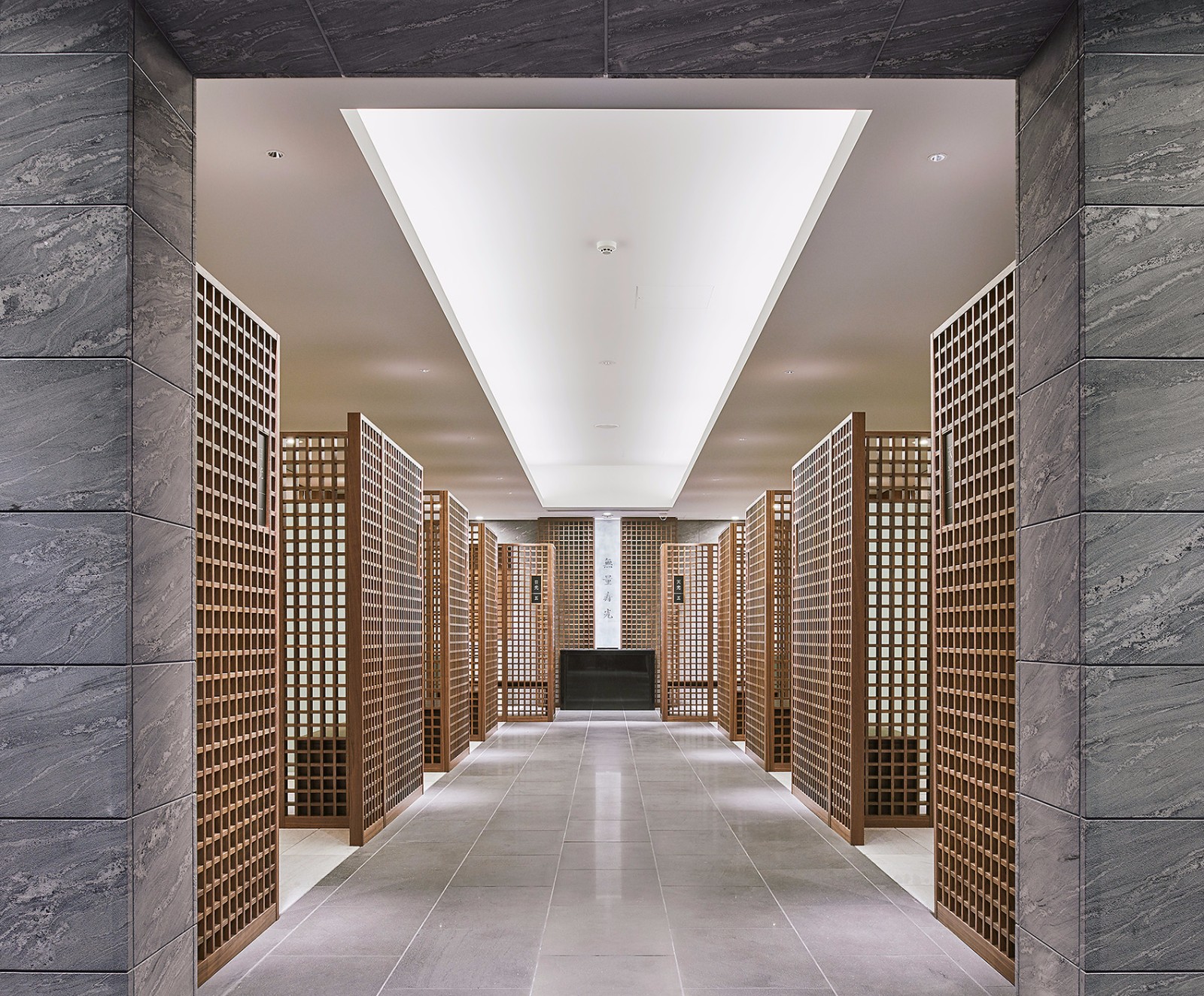 3層和6層用于靈位的實際存放。3層空間的環(huán)境較為明亮和清晰,主要使用了檜木,以及白色的大理石、灰泥和大谷石。6層空間的氛圍更加沉靜大氣,使用的材料以胡桃木、炭灰色大理石、膠合木板以及西式大理石為主。