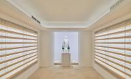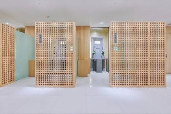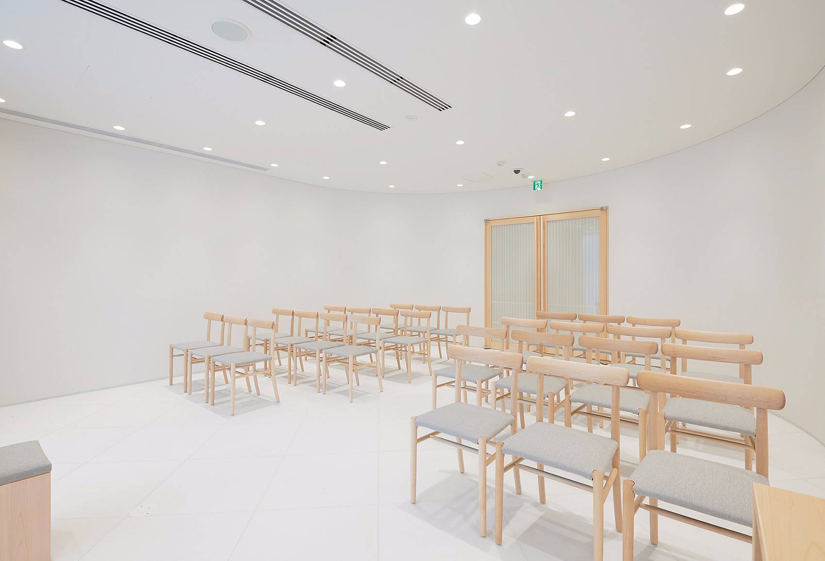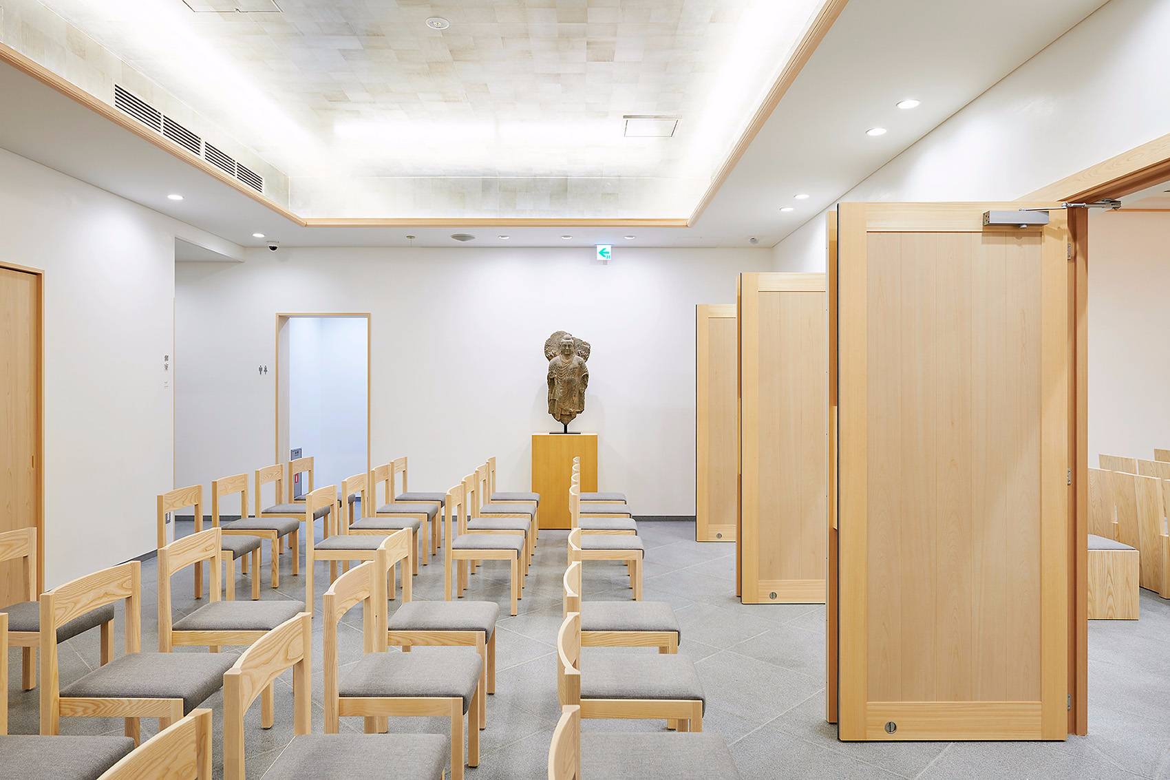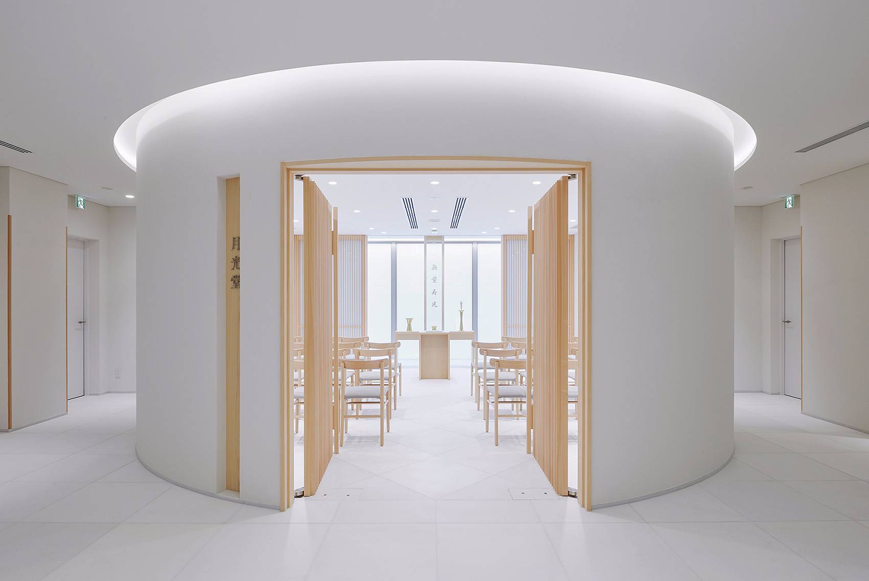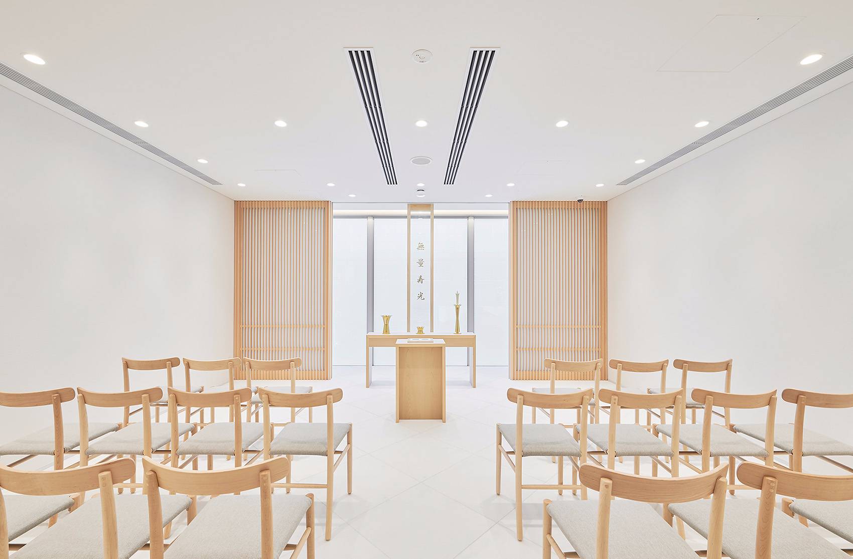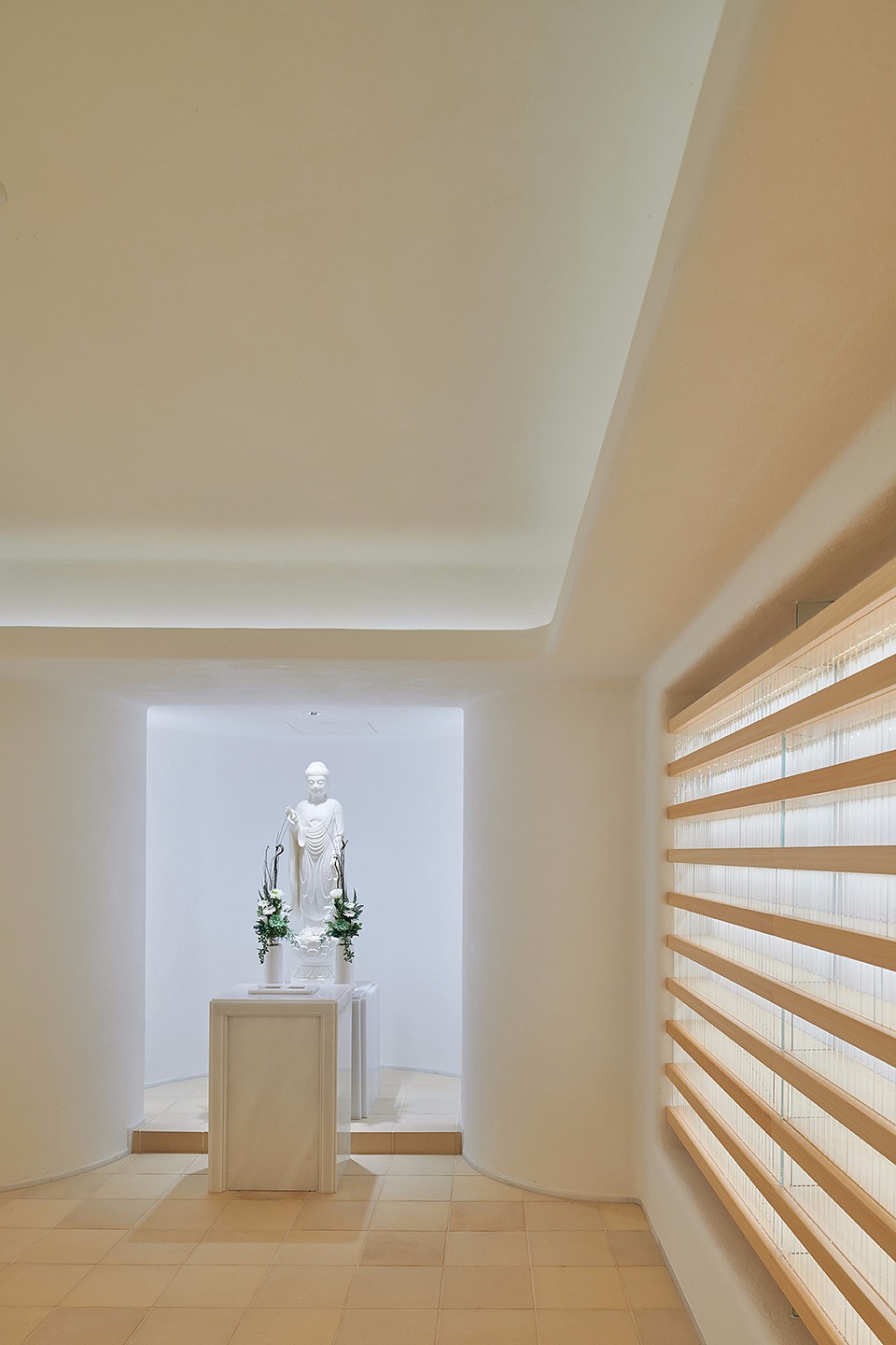 入口大門使用了不同種類的木材,以紋理強調(diào)出空間的界線。每層樓的房間入口都均鋪設(shè)以白色和黑色的大理石。墻壁和天花板處還覆蓋以錫箔,以呈現(xiàn)出天堂般的光明氛圍。5層空間對公眾開放,主要用于舉行參拜儀式,簡潔的設(shè)計凸顯出“寺院”所特有的平靜與親切之感。