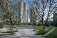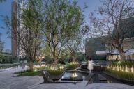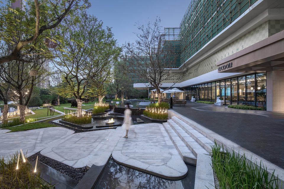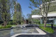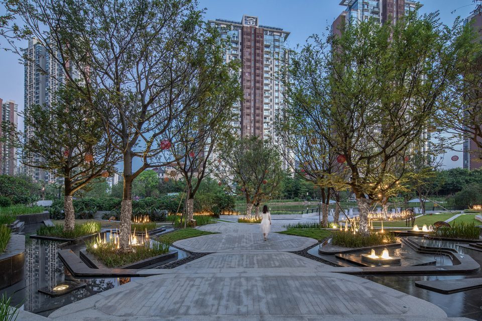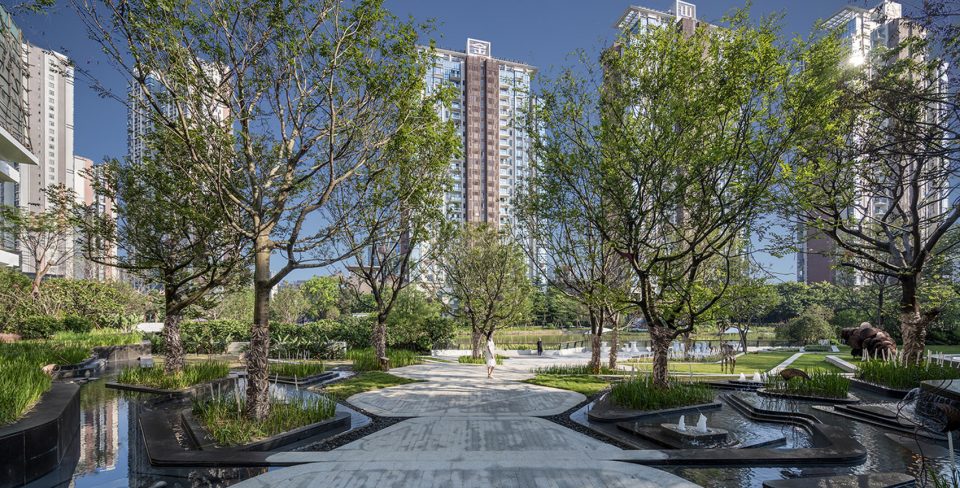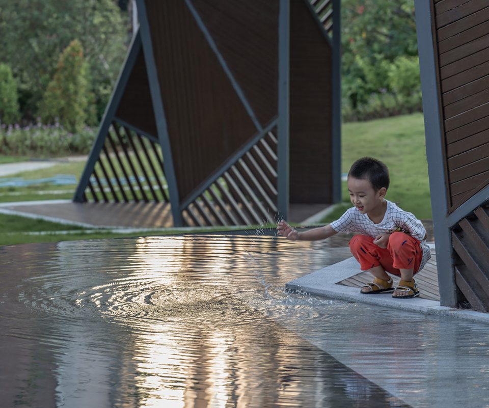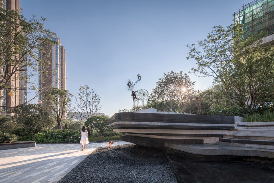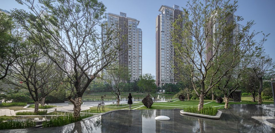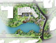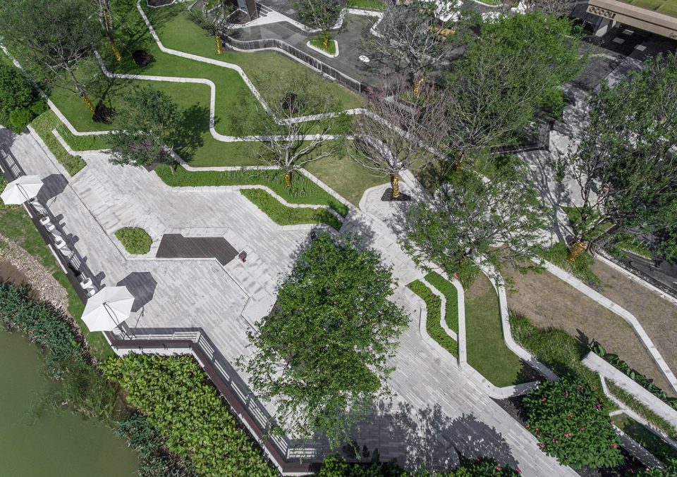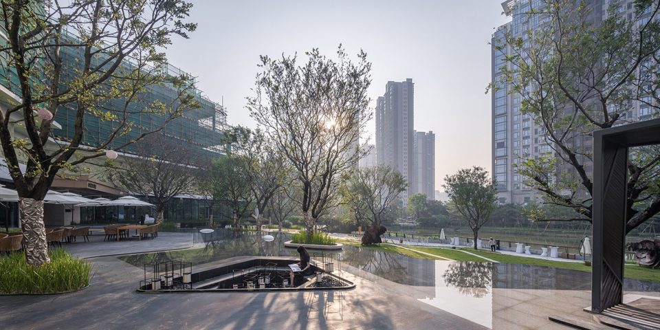 廣州招商·金山谷是我們對(duì)場(chǎng)地現(xiàn)狀和地理文脈混編的一次探索,而它的著迷之處不是傳統(tǒng)功能的梳理,利益的填補(bǔ),而是基于時(shí)間中風(fēng)景的再現(xiàn)。場(chǎng)地南側(cè)原有一湖體,北側(cè)的建筑與湖體間有兩米的高差,如何在建筑與湖體之間建立情感的、空間的聯(lián)系,如何解決近期作為銷售中心前場(chǎng),遠(yuǎn)期作為酒店后庭這一功能疊置,是我們面臨最重要的挑戰(zhàn)點(diǎn)。