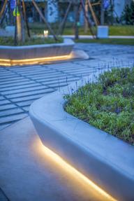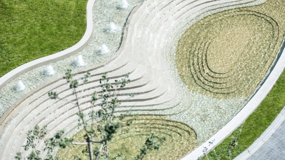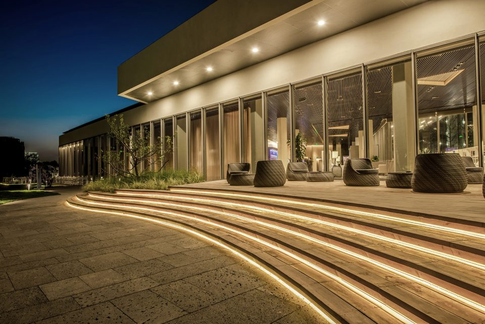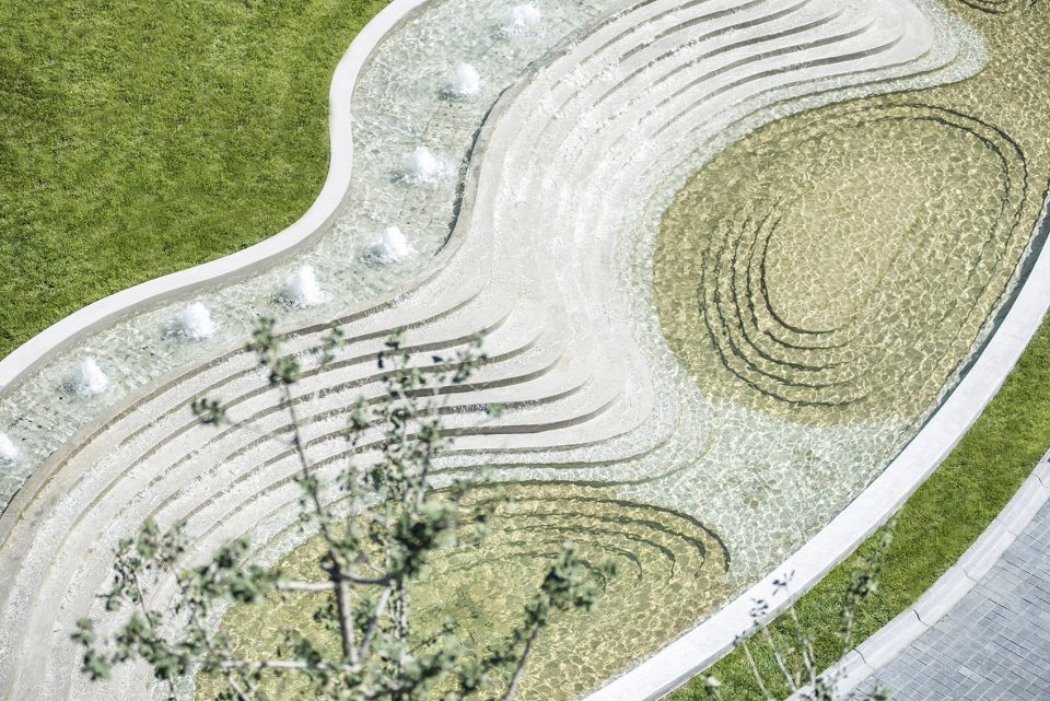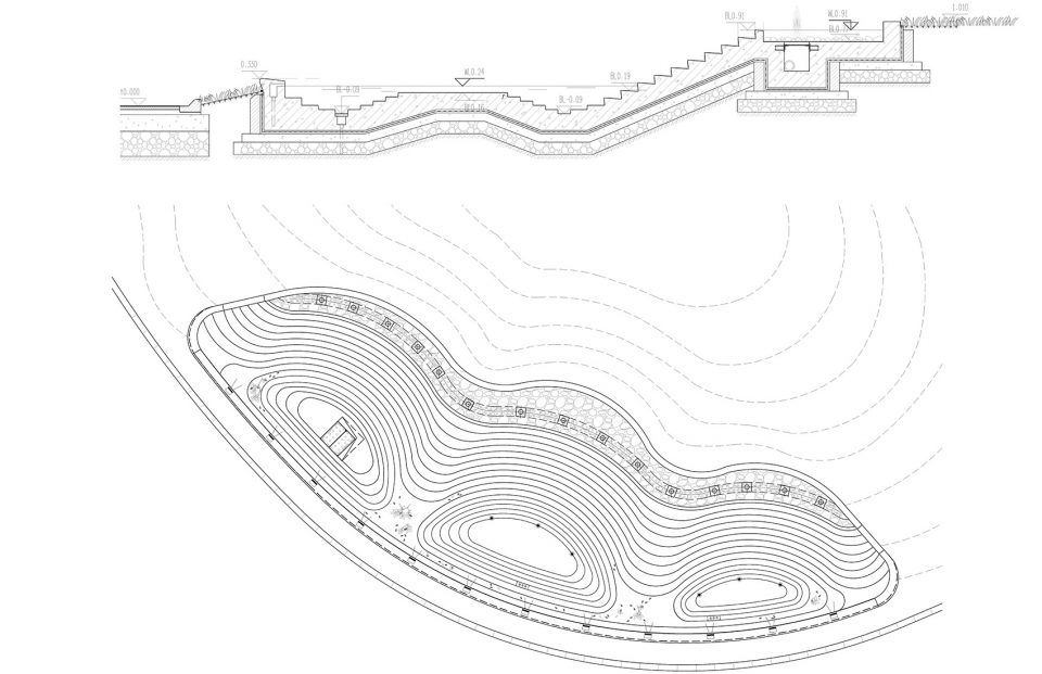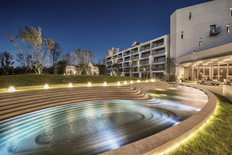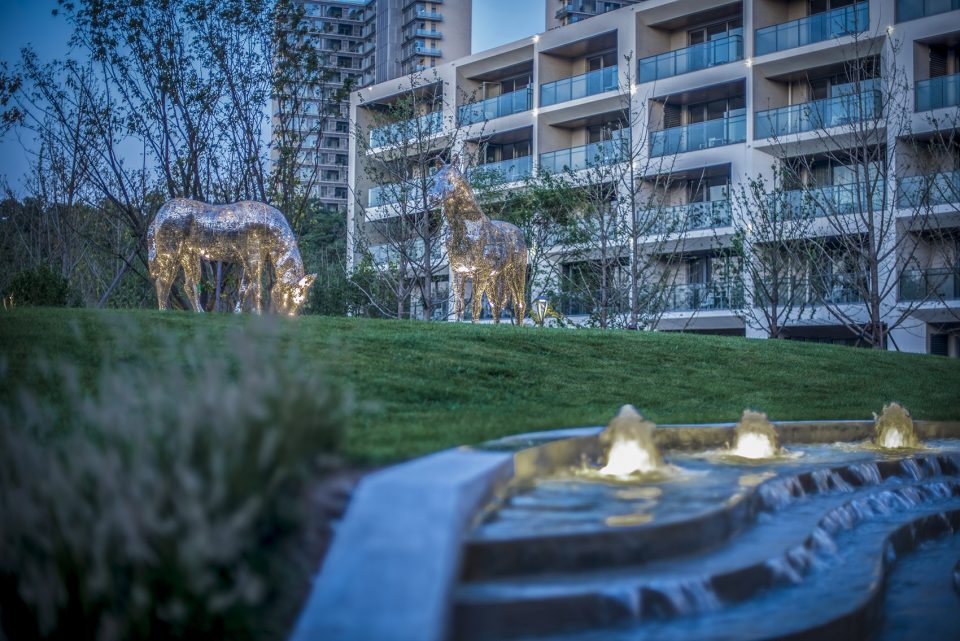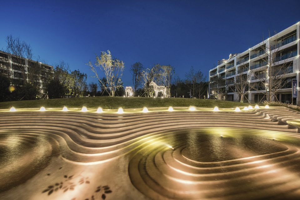 傳統(tǒng)弧形水景不僅對石材加工及拼貼工藝有嚴苛的要求,而且造價不菲,但是采用混凝土材質(zhì),這一切困難便就會迎刃而解。安瀾酒店前庭的混凝土弧形主水景長達25m,橫向拉伸了酒店大門空間。依地形走勢設計的疊水屏障遮擋前場兒童活動區(qū),引導層層水波匯入弧形水池?;炷脸氐阻偳吨S銅葉片組合,以自然的設計元素弱化了混凝土冰冷單調(diào)的質(zhì)感。黃銅葉片表面則采用磨砂紋理的處理方式,枯水和蓄水期都泛出星光點點,更為水池平添幾分意趣。