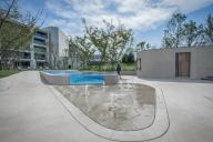 酒店后場一體成型的混凝土泳池區(qū)劃分有:兒童踩水池、成人泳池、吧臺,室外淋浴換衣房和洗手間。兒童踩水池由淺到深逐漸過渡,最深處的透明玻璃設計激發(fā)孩子們的好奇心,并與外側的旱噴廣場交相呼應。