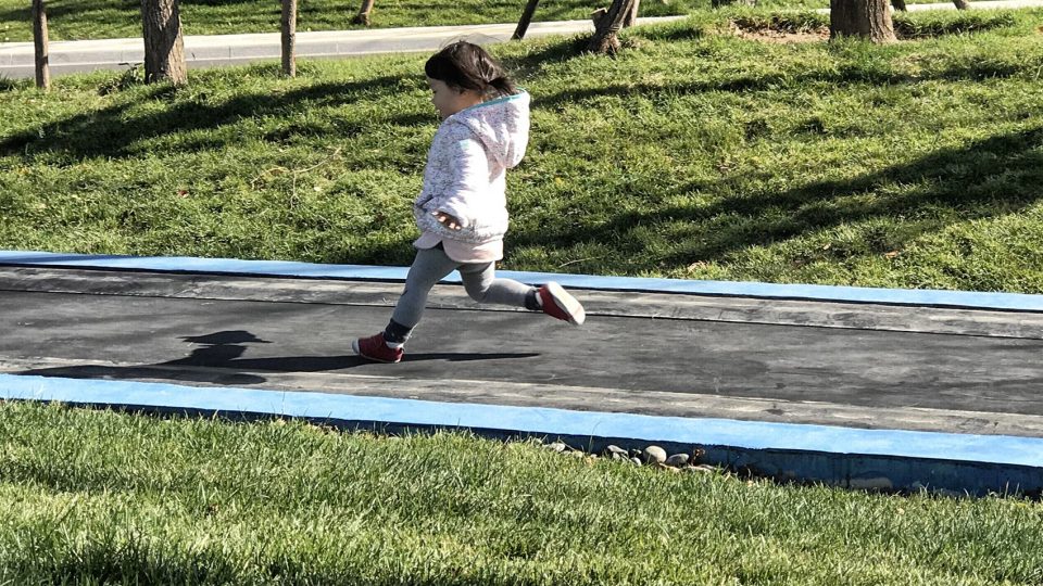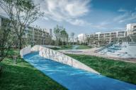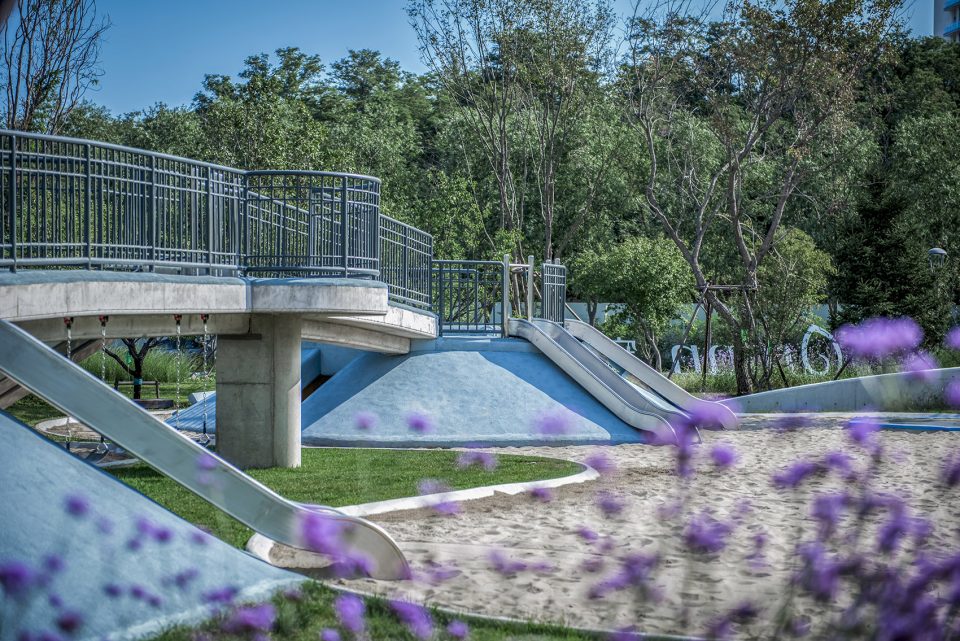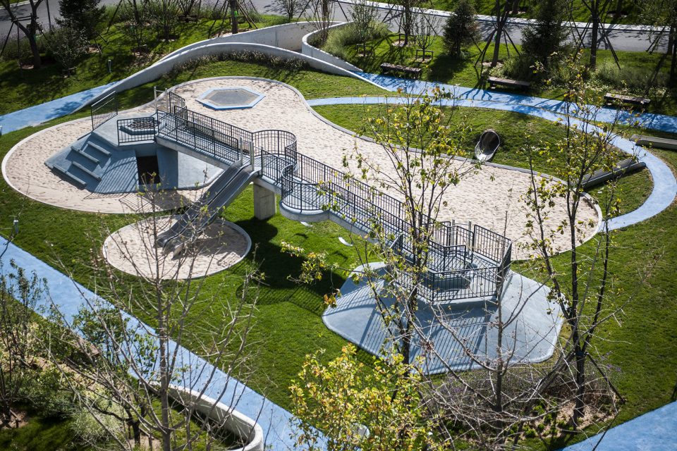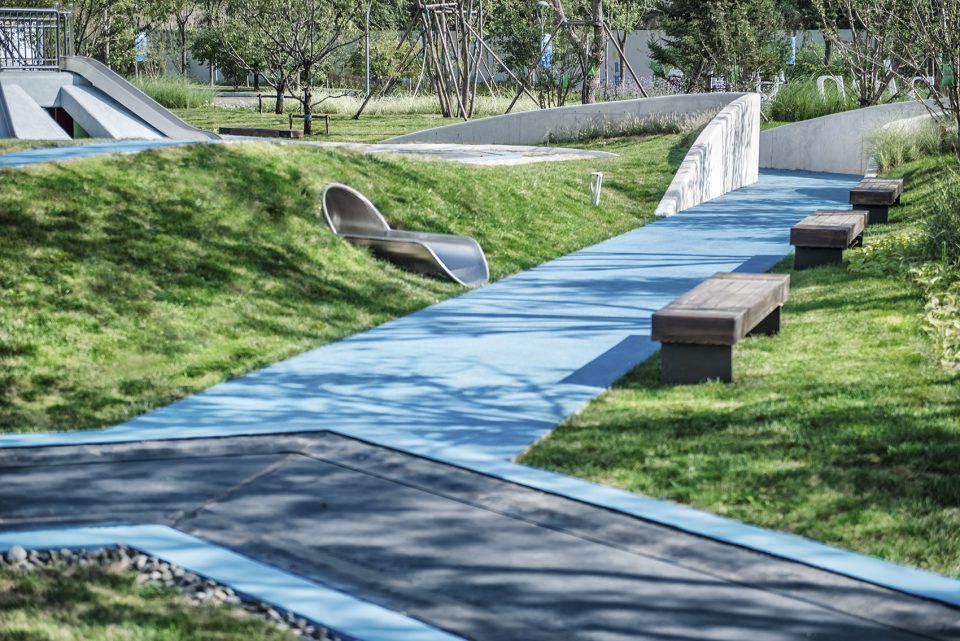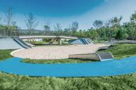 以混凝土素色和天藍色為主要基調(diào)的兒童活動場地,突破了以往兒童空間設計中顏色堆疊的思維慣性,嘗試以最素色簡約的設計理念還原孩子對世界的探索與感知,是一個極具個性化的兒童活動空間??紤]到兒童天性好動以及肌膚嬌嫩等特點,仿混凝土質(zhì)感的軟性塑膠材料將這一設計理念完美呈現(xiàn)。圍繞場地中央的兒童城堡,建有一條中國最長的80m戶外兒童蹦床跑道,孩子們可以在這里跳躍、奔跑、滑行,盡情享受擺脫大自然重力的暢快和愉悅。