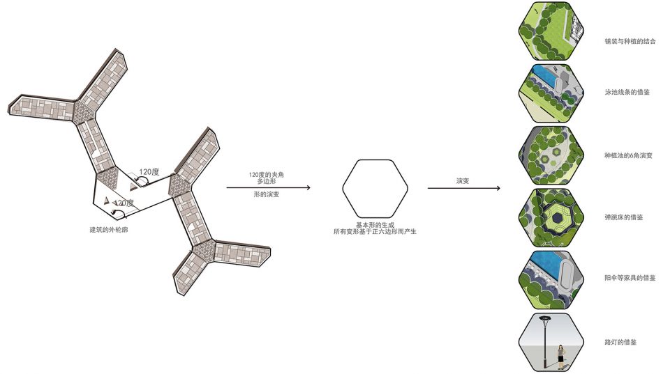 安瀾酒店景觀設計中基本形的生成,均基于酒店建筑正六邊形的整體構型。各種景觀要素從六邊形中借鑒延展,將其靈活轉化成多種可能性,并以穩(wěn)定的功能圖形連接起建筑與自然。清水混凝土設計語言的大量運用,輔以多邊形態(tài)的演化,共同塑造了阿那亞安瀾酒店簡單質(zhì)樸卻極具沖擊的視覺效果。