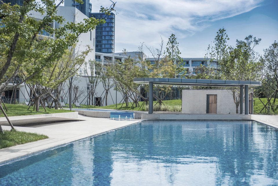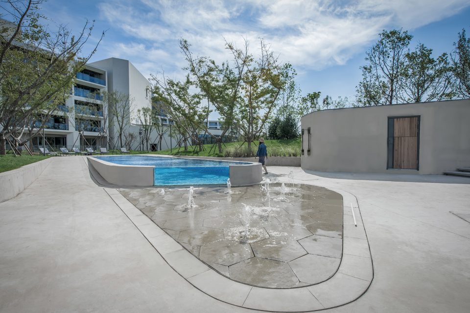 由于環(huán)境、工藝、成本等客觀環(huán)境的制約,本設計大膽采取了一些逆向思維:兒童場地前置、素色的肌理、混凝土水景和泳池。