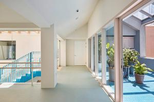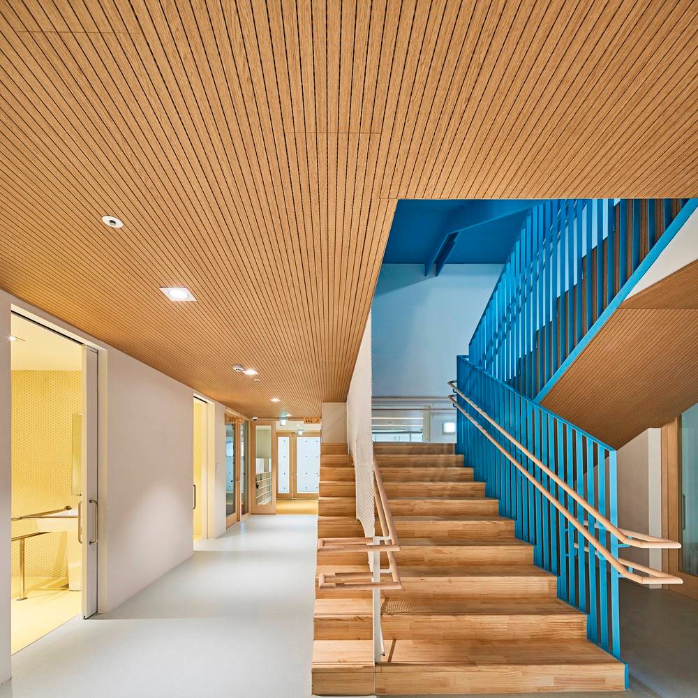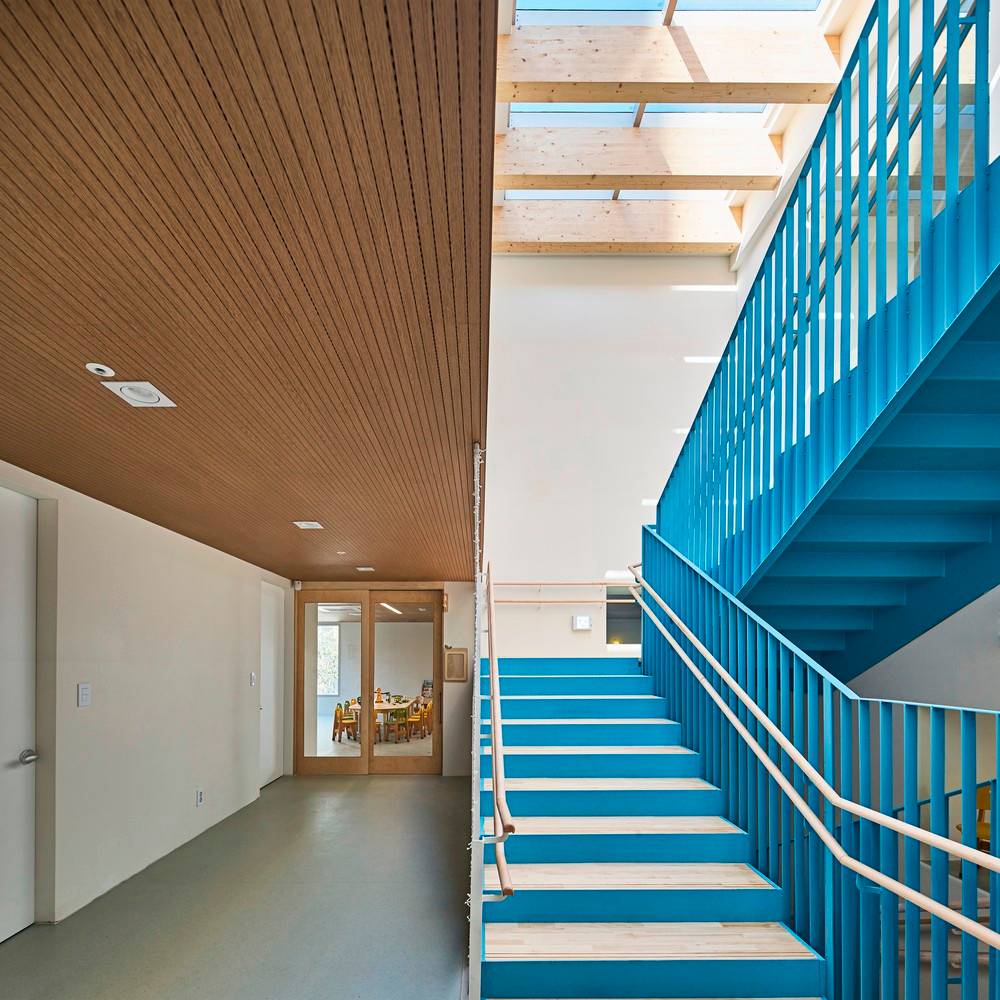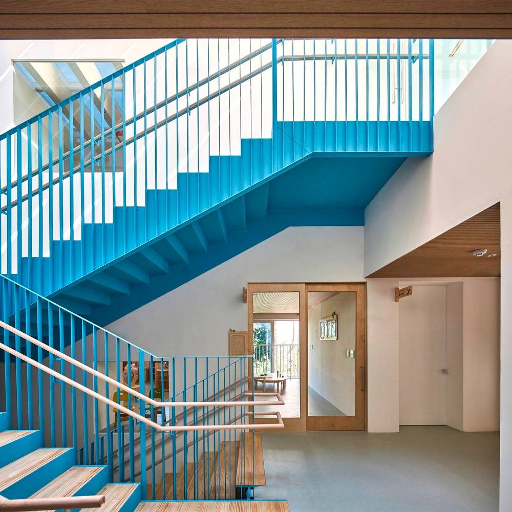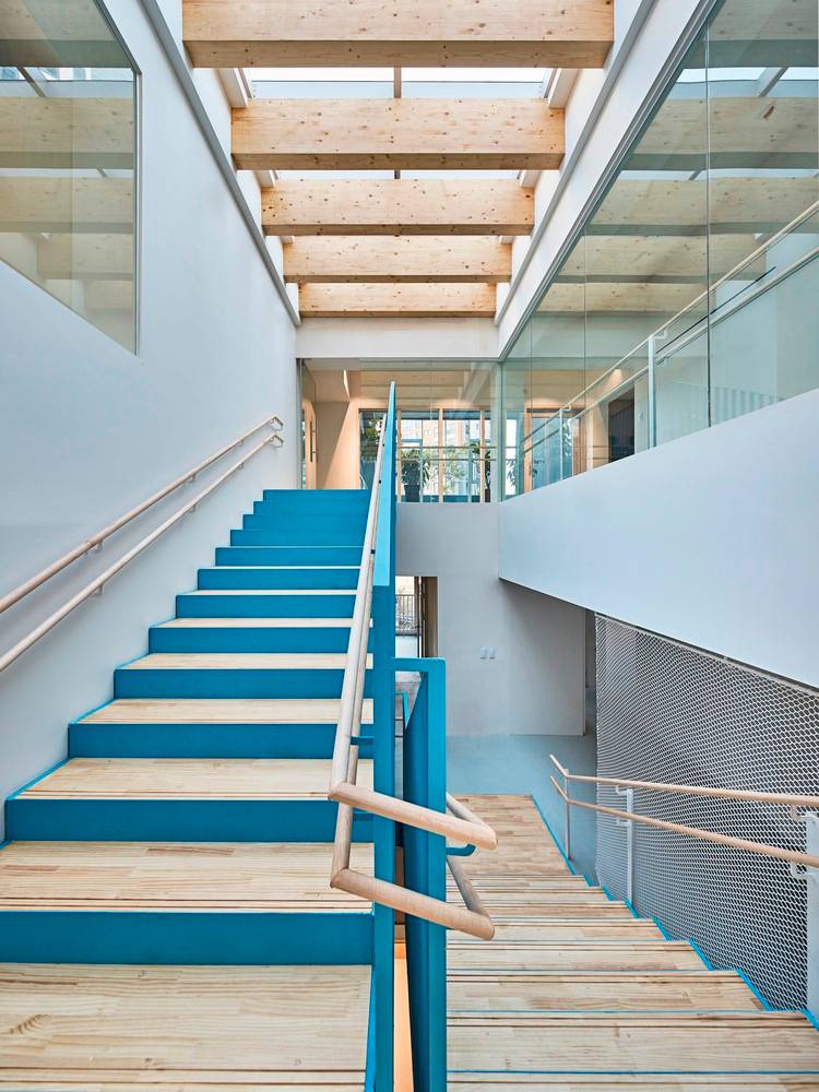 建筑圍繞著中央被漆成藍(lán)色主樓梯而建,屋頂上巨大的天窗,使自然光能射入大樓的中心。教室則朝中央開放。