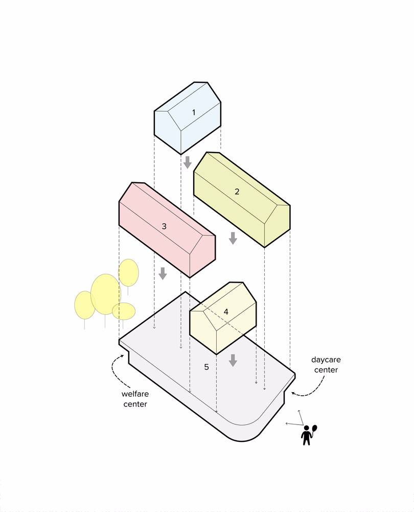 兒童與成人間有著不同程度的感知度。在小時(shí)候,每樣?xùn)|西看起來都比我們成年后再看時(shí)要大。這個(gè)項(xiàng)目的重點(diǎn)是縮小建筑物的感知度,以便日后的孩子們能夠與它產(chǎn)生更多聯(lián)系。為了實(shí)現(xiàn)這一目標(biāo),整座建筑被分成5個(gè)部分。每一部分都有獨(dú)特的顏色、幾何形狀和裝飾材料,以強(qiáng)調(diào)整體中的個(gè)體。