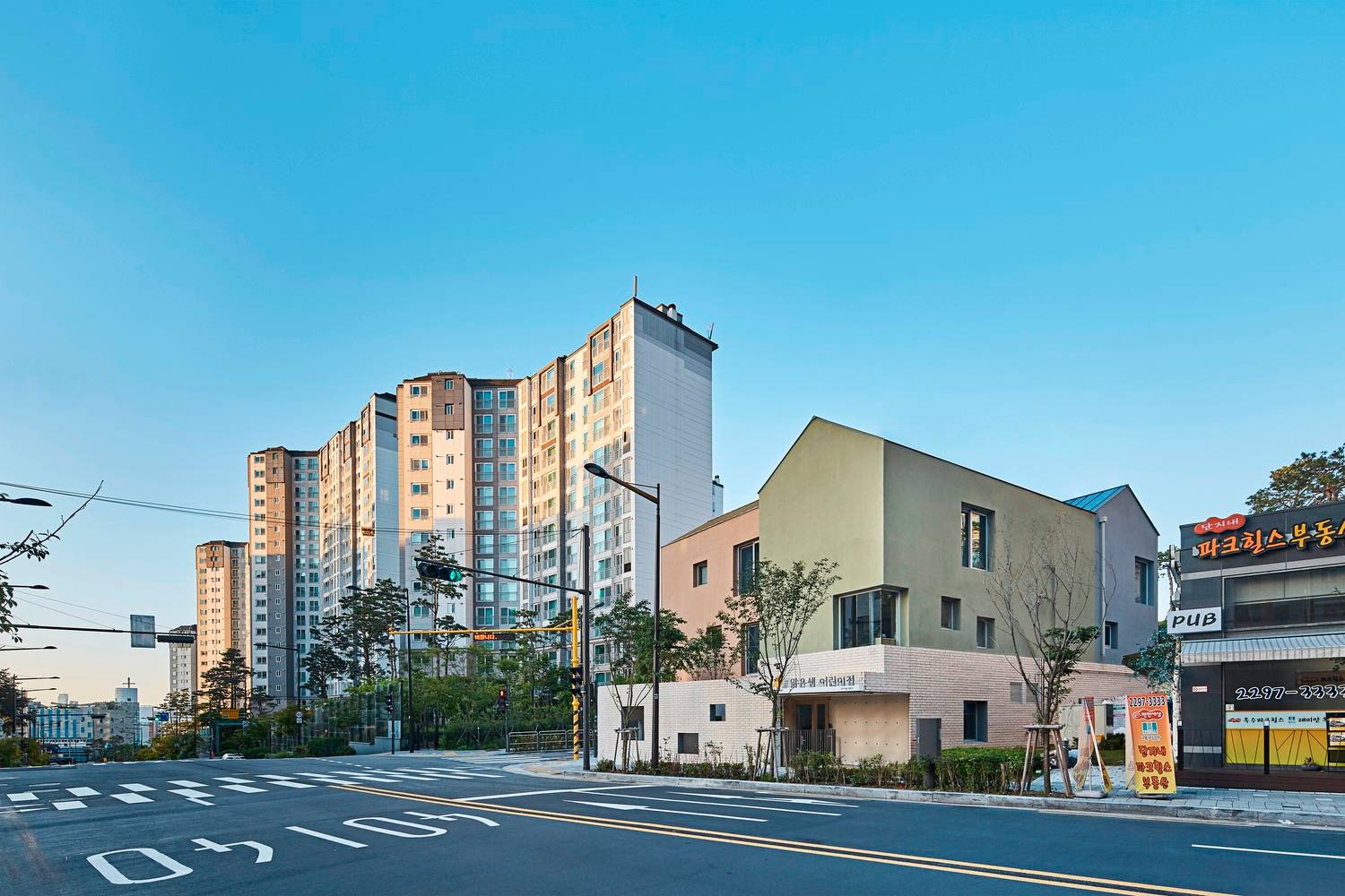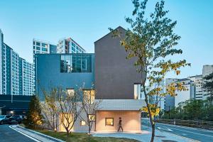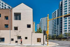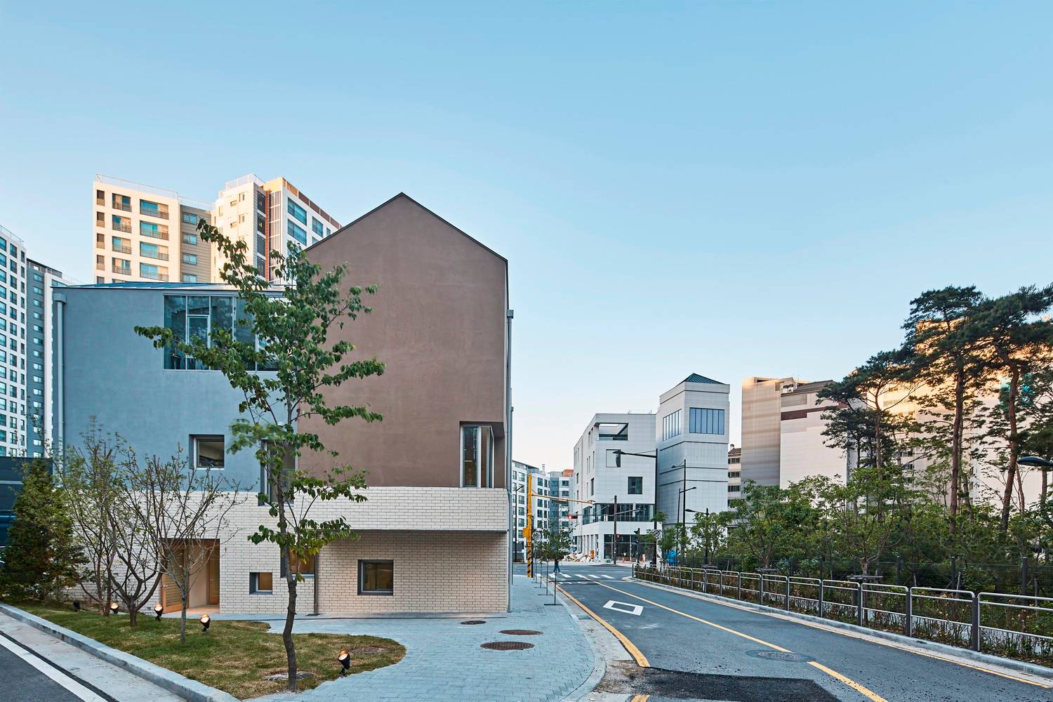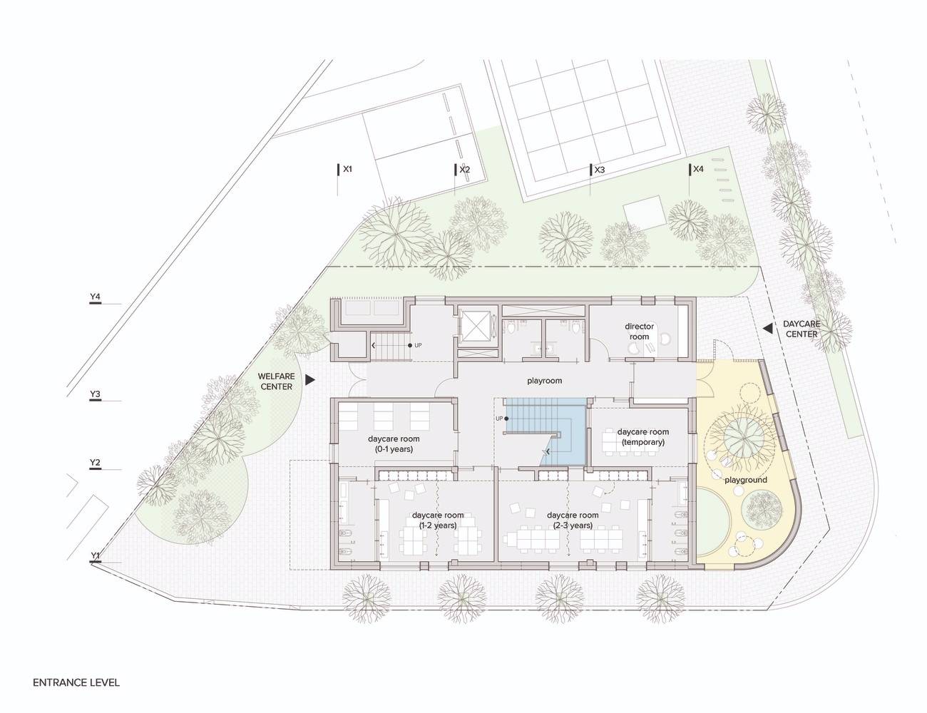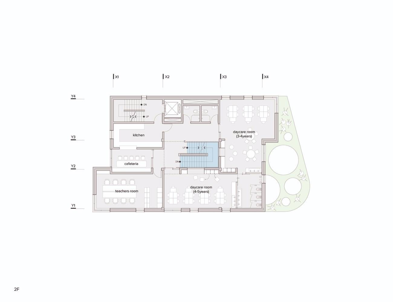 建筑位于兩條路的交匯處。建筑的主入口朝向更寬的道路,因此使兒童不會(huì)直接跑到馬路上,而是通過一個(gè)過渡空間。這個(gè)空間是一個(gè)安全區(qū)、操場(chǎng),也是來自主干道的交通噪音和班級(jí)之間的緩沖地帶。出于安全考慮,停車場(chǎng)位于主入口的對(duì)面,車輛可從輔路進(jìn)入。