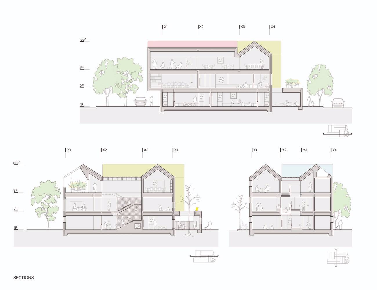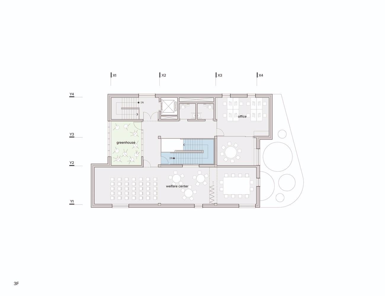 教室被安排在南部和東部,而像廚房、倉(cāng)庫(kù)、電梯和衛(wèi)生間等服務(wù)設(shè)施則在北部。位于三樓的溫室,不僅可以用于教育,還能成為冬天寒冷日子里的供暖系統(tǒng)。白天積累的熱空氣在晚上被釋放到內(nèi)部空間,有助于整個(gè)建筑的氣溫調(diào)節(jié)。