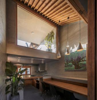 ▼中屋東側(cè)單元室內(nèi),高處亭臺(tái)壓低廚房區(qū)域,與餐茶空間形成對(duì)望?蘇圣亮