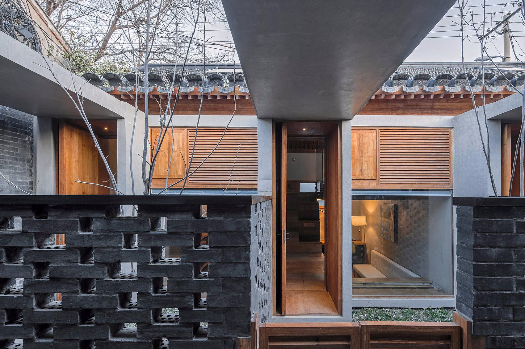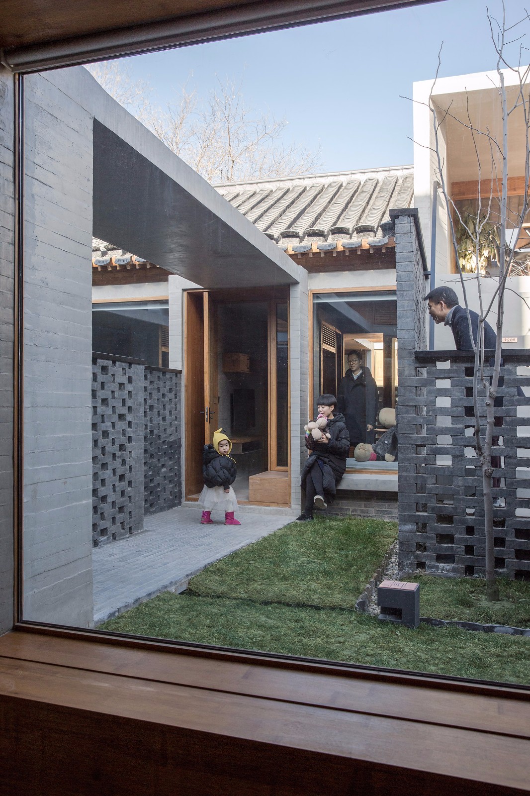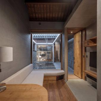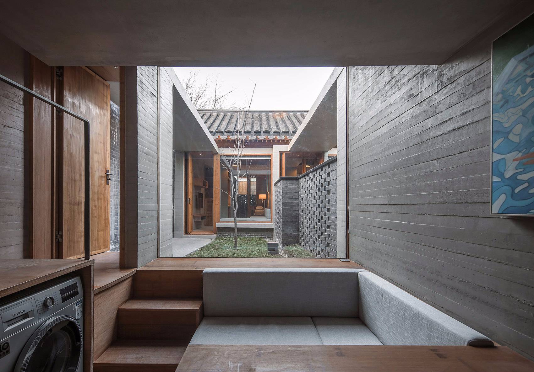 外人由喧鬧的城市商業(yè)街區(qū)轉(zhuǎn)折進(jìn)入閑適寧靜的胡同區(qū)域,經(jīng)過大院胡同28號(hào),先從老墻上的“三用”窗讀到一絲新意,大門敞開,檐廊深遠(yuǎn),綠意盎然,遂通過一條半室外主巷道進(jìn)入,巷道上方覆蓋混凝土頂板,與東鄰西墻脫開縫隙,光線順縫擠入照亮墻壁和甬道;走過北屋山墻,入第一進(jìn),才知此處既非雜院,也非獨(dú)院,而是“宅園”社區(qū);通過一條再次分支的巷廊,分別進(jìn)入北側(cè)、南側(cè)不同格局和規(guī)模的五套“合院”公寓,每套公寓擁有大小、形狀不同的小“合院”——園庭;園庭之中,麥冬草地圍合,高樹之下、低矮灌木之間,混凝土體塊水平、豎直組合,既取意抽象的山石,又是室外坐具、內(nèi)藏照明燈具、澆灌水喉,置于波形立瓦鋪地之上,鋪地可存薄水而成水中樹石之景;由側(cè)廊賞景而入戶,主要起居空間通透,面向并對(duì)景于園庭——為“宅園合一”,使大院胡同28號(hào)的改造超出了原有的居住功能,向著“理想居所”靠近。
