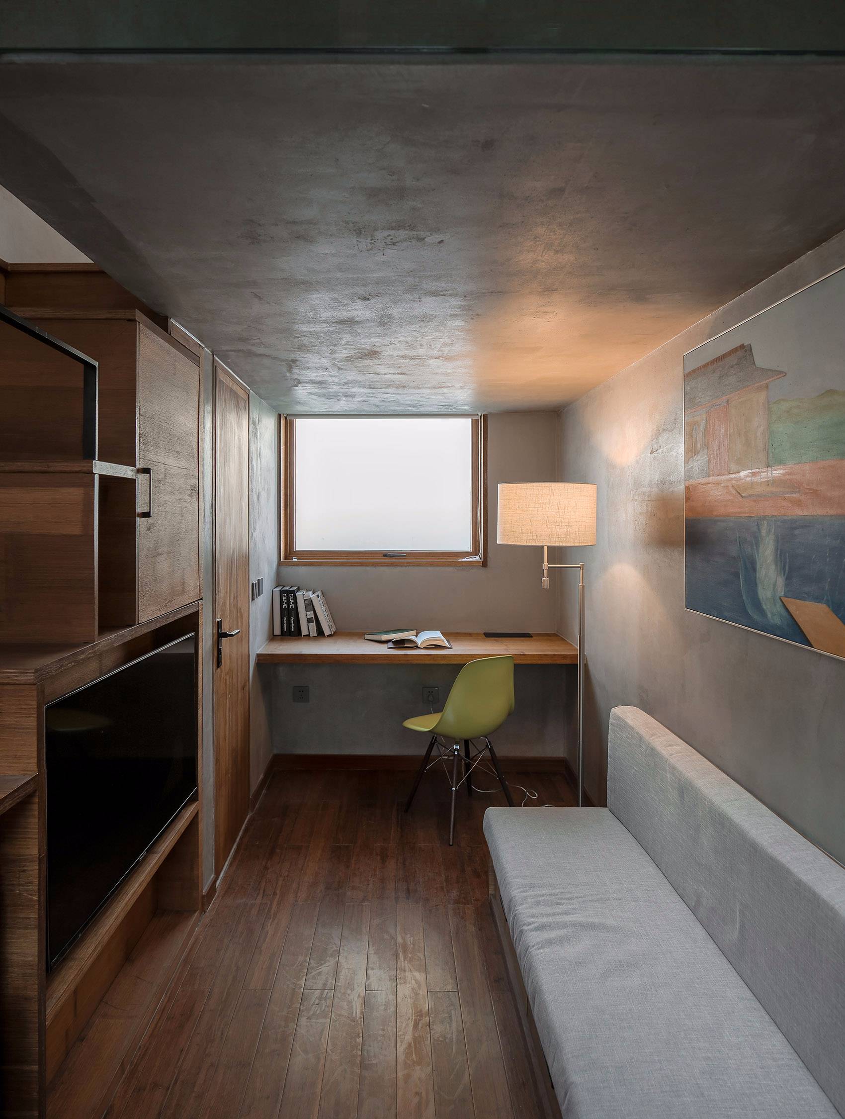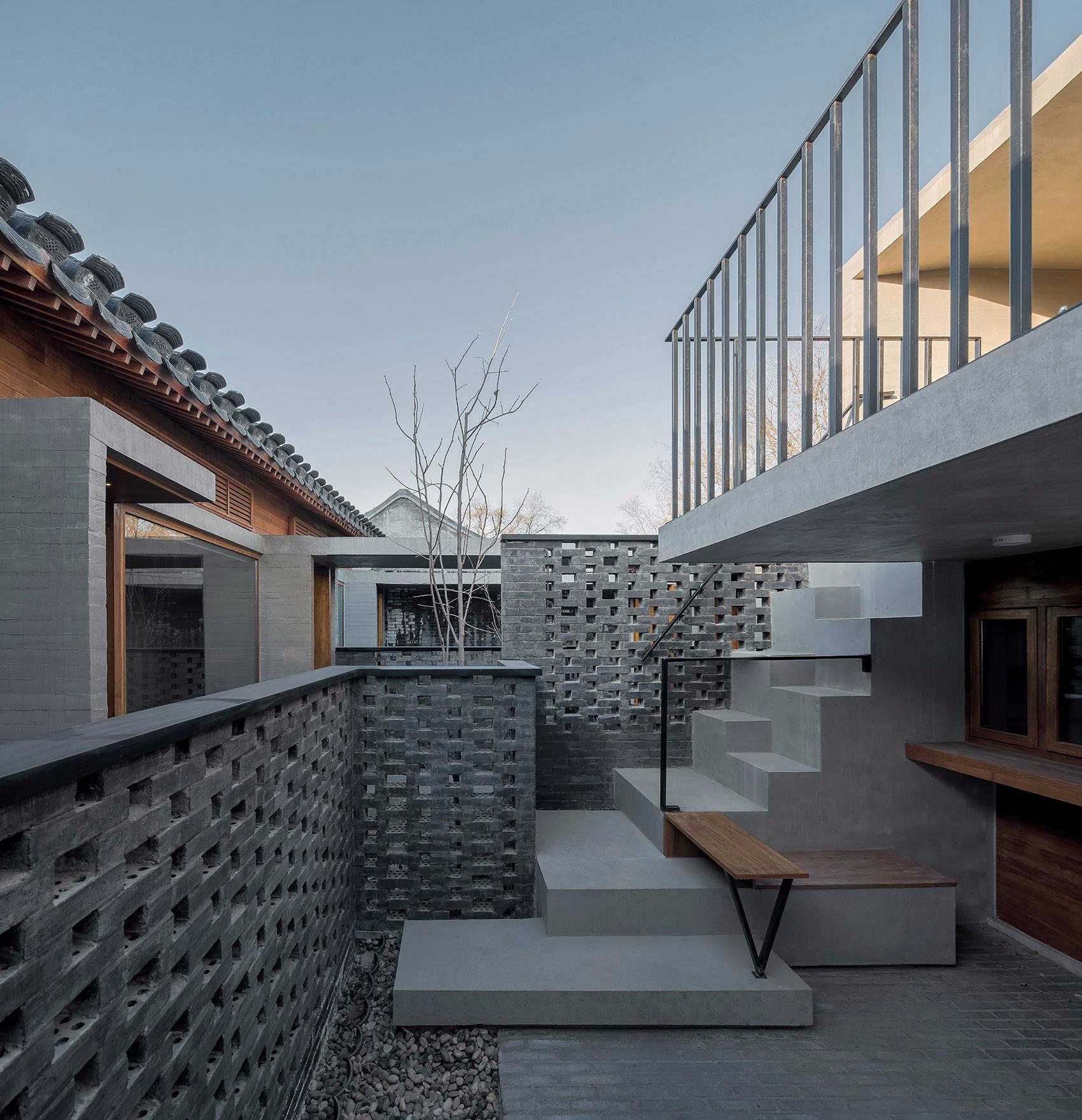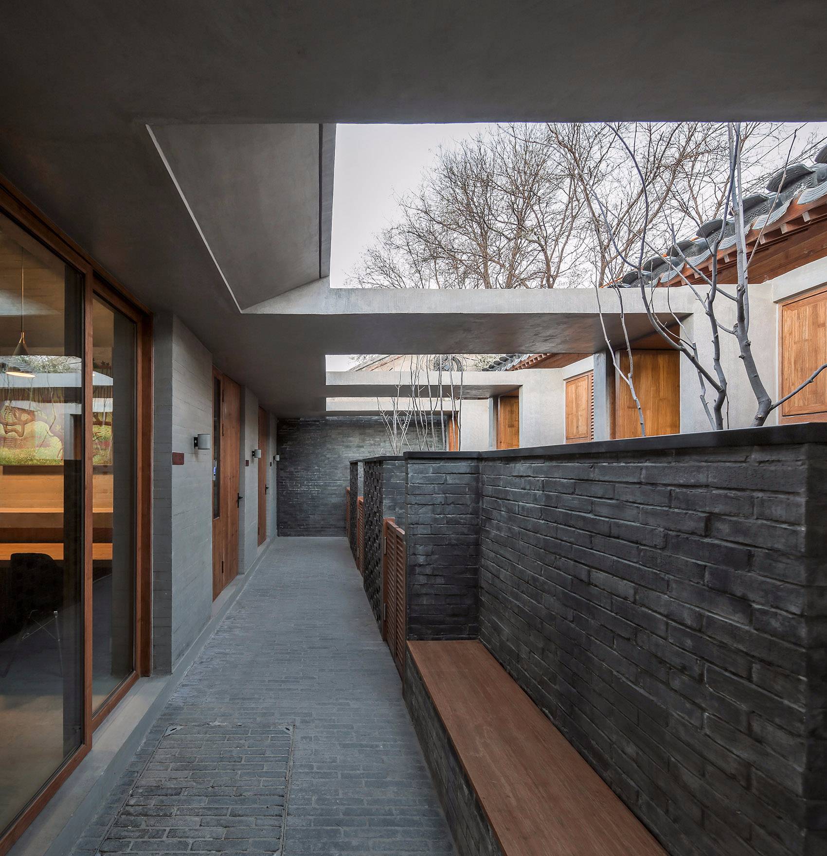 外人由喧鬧的城市商業(yè)街區(qū)轉(zhuǎn)折進(jìn)入閑適寧靜的胡同區(qū)域,經(jīng)過大院胡同28號(hào),先從老墻上的“三用”窗讀到一絲新意,大門敞開,檐廊深遠(yuǎn),綠意盎然,遂通過一條半室外主巷道進(jìn)入,巷道上方覆蓋混凝土頂板,與東鄰西墻脫開縫隙,光線順縫擠入照亮墻壁和甬道;走過北屋山墻,入第一進(jìn),才知此處既非雜院,也非獨(dú)院,而是“宅園”社區(qū);通過一條再次分支的巷廊,分別進(jìn)入北側(cè)、南側(cè)不同格局和規(guī)模的五套“合院”公寓,每套公寓擁有大小、形狀不同的小“合院”——園庭;園庭之中,麥冬草地圍合,高樹之下、低矮灌木之間,混凝土體塊水平、豎直組合,既取意抽象的山石,又是室外坐具、內(nèi)藏照明燈具、澆灌水喉,置于波形立瓦鋪地之上,鋪地可存薄水而成水中樹石之景;由側(cè)廊賞景而入戶,主要起居空間通透,面向并對(duì)景于園庭——為“宅園合一”,使大院胡同28號(hào)的改造超出了原有的居住功能,向著“理想居所”靠近。