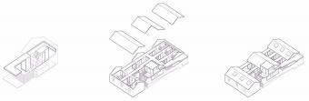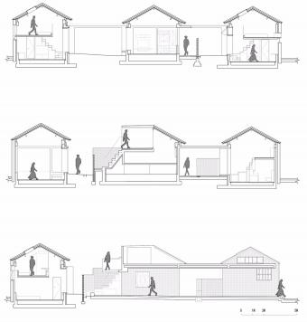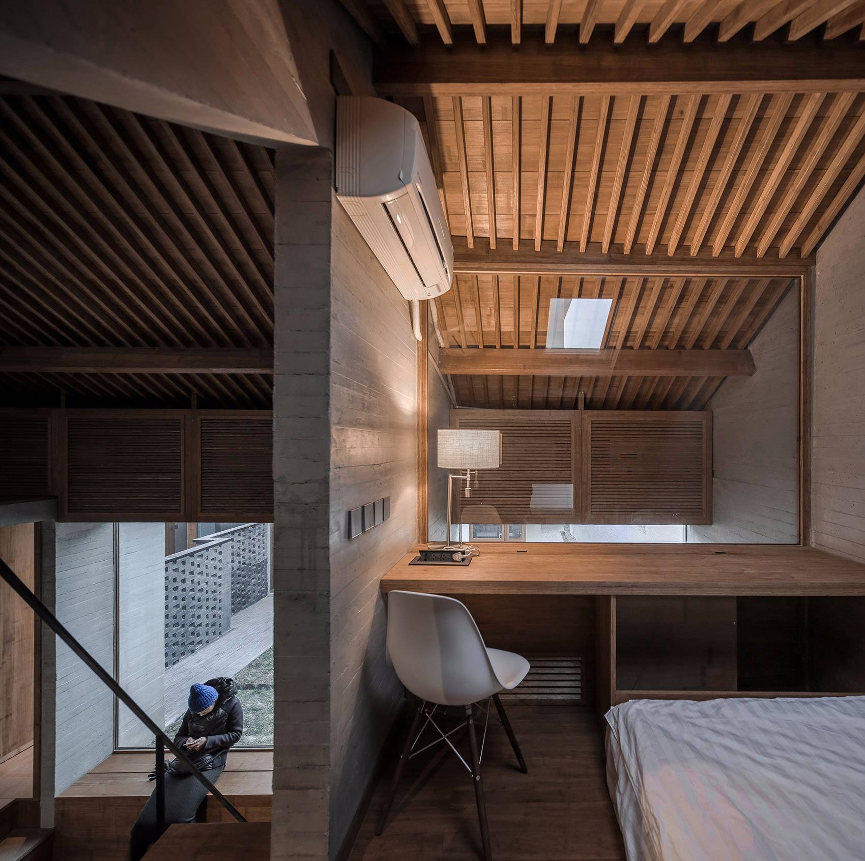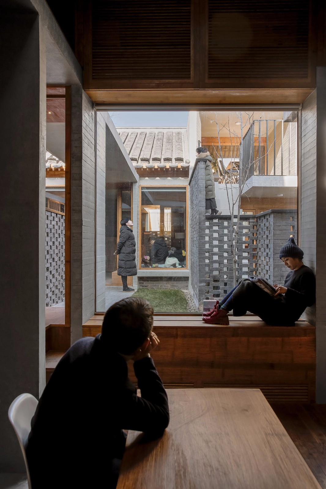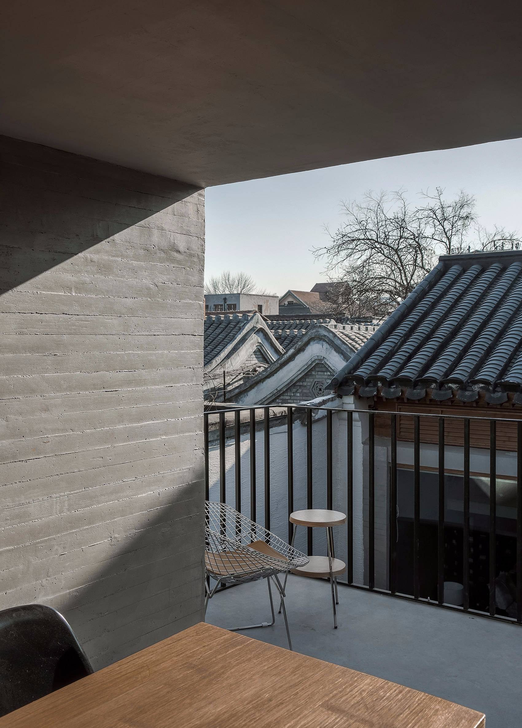 與主巷道串聯(lián)的中屋最東側(cè)公共空間單元,作為咖啡、餐茶空間,其坡頂局部抬高拉平,形成一個(gè)位于二層高度的半室外觀景亭,嵌入原有建筑開間,其下壓低為廚房操作空間。入口主巷道上方的混凝土檐板在此延伸為平臺(tái),與觀景亭外側(cè)連接為一體,在下限定出一個(gè)可休閑停留的戶外灰空間,面對(duì)餐茶空間后部的公共小庭,在上的景亭“抬頭”打破了原有瓦面坡屋頂?shù)男螒B(tài),視野在這里突然變得開闊,院落與城市景觀交織,這也是公共巷道空間在剖面上的延伸。這一公共空間的設(shè)立,完善了已建立的“街巷+居住單元”的模式,使得院落轉(zhuǎn)變?yōu)橐粋€(gè)“微縮社區(qū)”。這一公共空間既可為所有“宅園”單元居民日常使用、交往、共享,也可向胡同開放,對(duì)外營(yíng)業(yè)服務(wù)于附近胡同居民乃至外來游客,進(jìn)而成為更大范圍鄰里共享的公共服務(wù)空間,更增強(qiáng)其“社區(qū)”的特征。
