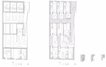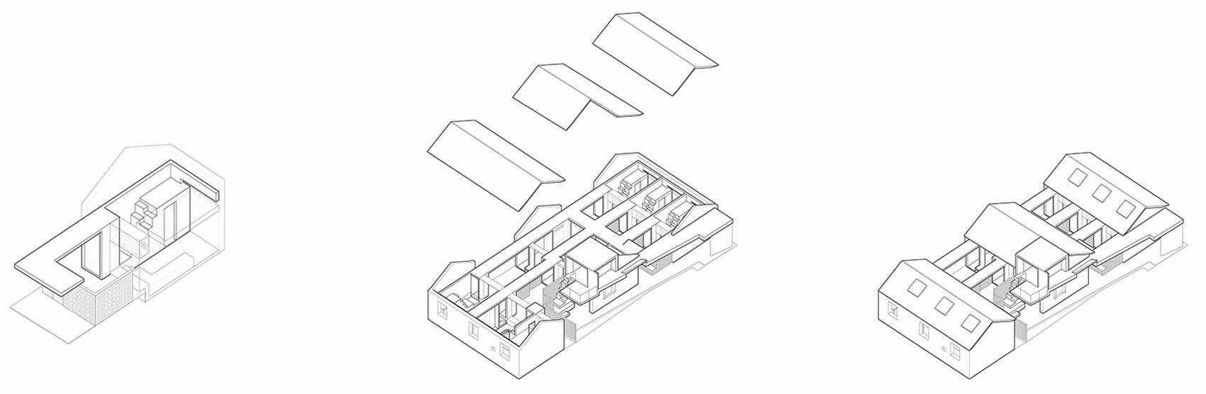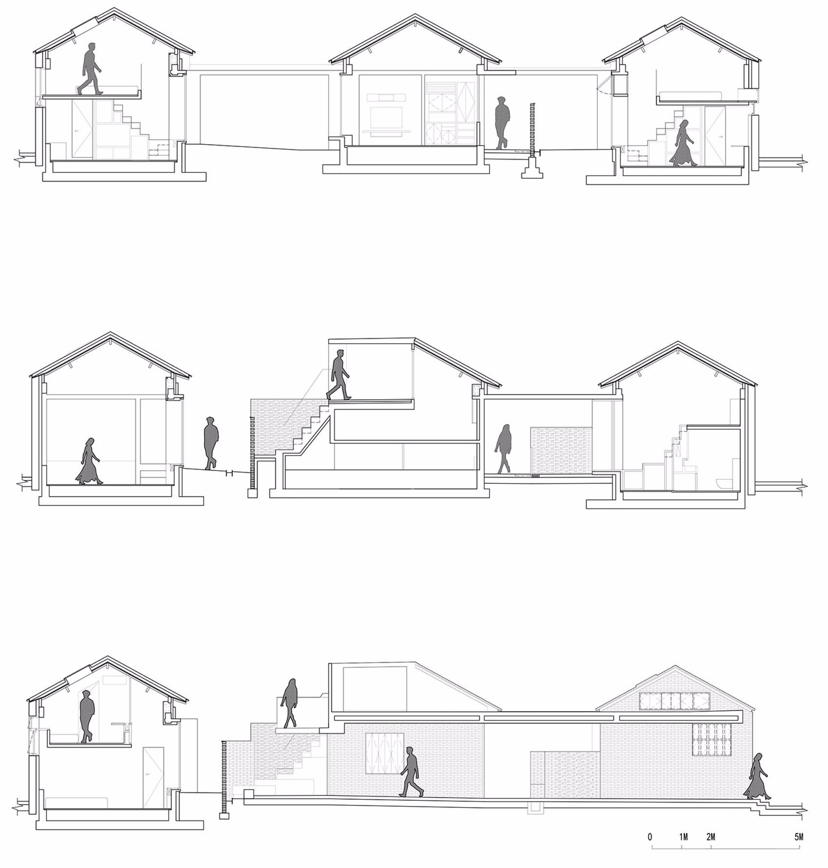 傳統(tǒng)四合院通常容納一個(gè)家族式大家庭,隨著現(xiàn)代社會(huì)結(jié)構(gòu)的轉(zhuǎn)化,需要尋求新的空間模式以適應(yīng)不同人口數(shù)量和空間需求的小家庭單元。大院胡同28號(hào)現(xiàn)存在三座產(chǎn)權(quán)合法的建筑(下文稱作“北屋”、“中屋”和“南屋”),利用北京城市分型結(jié)構(gòu)的特點(diǎn),將原來的院落以開間為基本單元,進(jìn)一步細(xì)分為多個(gè)更小的“宅+ 園”居住單元,聚集為“小合院群”,并將以胡同為主的城市交通系統(tǒng)向院內(nèi)延伸出巷道及支巷,串聯(lián)這些居住單元,從而實(shí)現(xiàn)城市空間結(jié)構(gòu)的由“細(xì)胞”層級(jí)向“分子”層級(jí)有序加密,再進(jìn)一步實(shí)現(xiàn)從“雜院”到“宅園”的進(jìn)化。在保持原建筑外墻和屋頂不變的前提下,隨開間規(guī)律布置的混凝土單元分隔墻,在老墻的包裹中形成新的結(jié)構(gòu)體系,同時(shí)成為室內(nèi)的空間分界。偏于每個(gè)單元一側(cè)的雙墻空間,極限整合了入戶門斗、躍層樓梯、機(jī)電設(shè)備、衛(wèi)生間等,另側(cè)較大開間,底層作為主要的起居空間,夾層作為臥室;室外入口廊道則是雙墻向外的延續(xù),與居宅和院墻一起形成對(duì)庭園的圍合。這些線型混凝土結(jié)構(gòu)為主干的結(jié)構(gòu)/空間單元構(gòu)成了內(nèi)含于整體院落群組建筑的主要空間架構(gòu)。