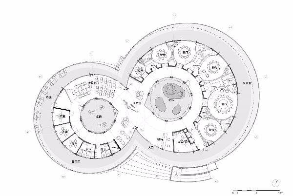 ?“場地坐落在兩個(gè)相鄰錯位的宅基地上”,設(shè)計(jì)師解釋道,“在每個(gè)宅基地上我們畫了一個(gè)巨大的圓形;這兩個(gè)圓形交疊為我們的建筑勾勒出壯闊的輪廓,同時(shí)保留了周圍的竹林和樹木。我們力圖實(shí)現(xiàn)在非限定邊界的場地中塑造最大化的空間連續(xù)性、水平性和延展性。懸置的屋頂創(chuàng)造最開闊的自然風(fēng)光視野,甚至可以將人的存在消隱地延展到自然當(dāng)中?!?/p>